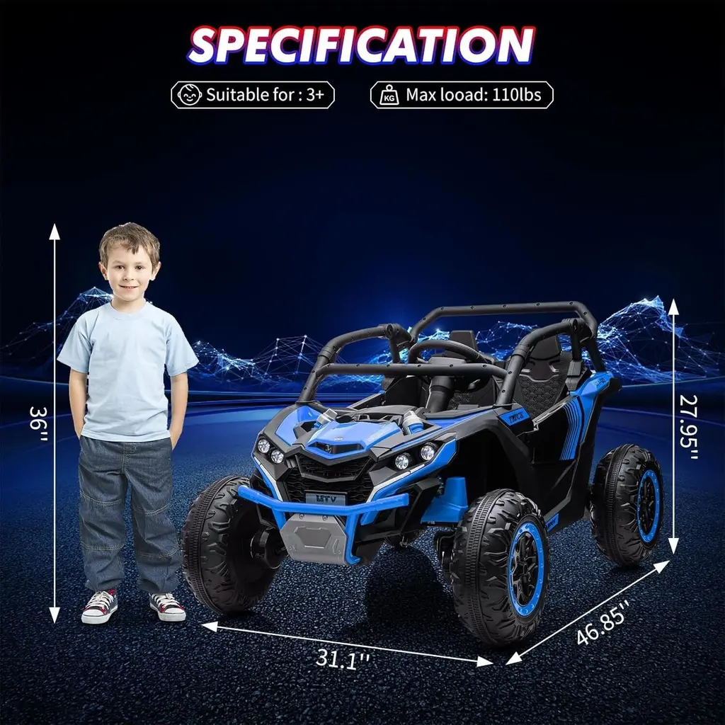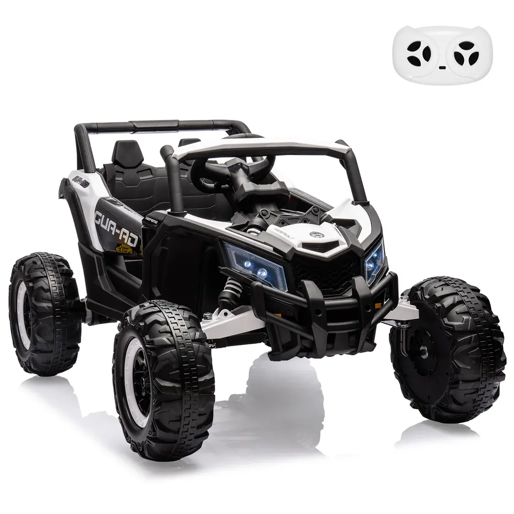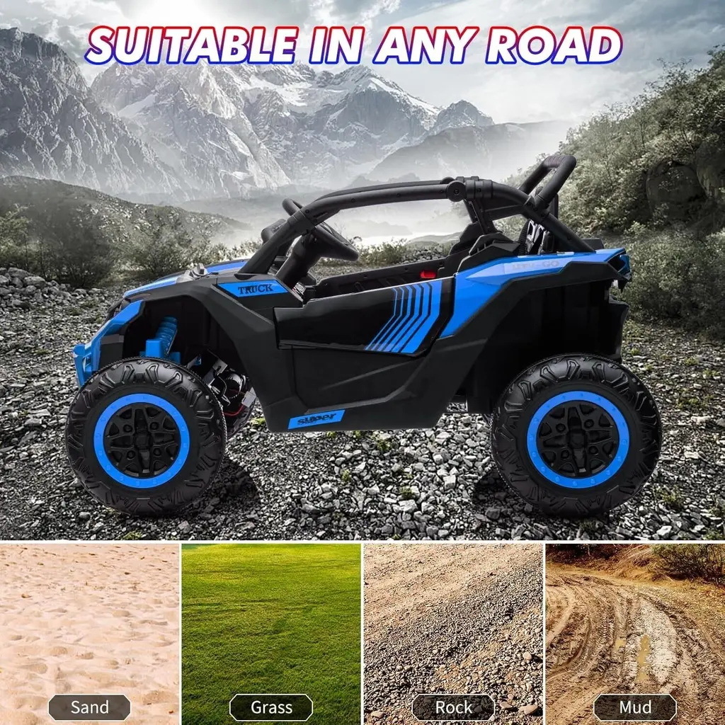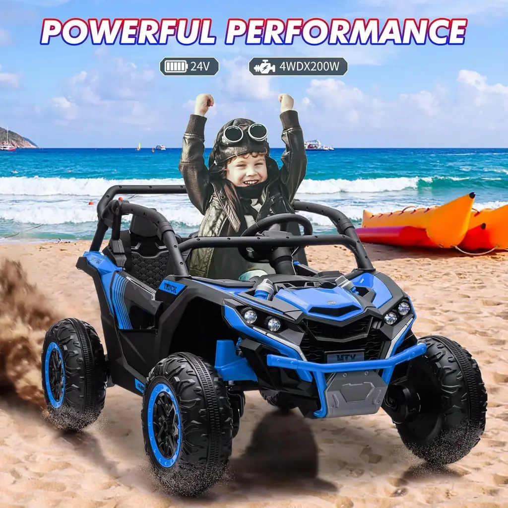 Powerful Off-Road Performance: This 24V ride-on UTV is equipped with four 200W motors, providing impressive power that enables young adventurers to tackle various terrains with ease. Its design is tailored for off-road excitement, making it perfect for outdoor exploration and adventure. User-Friendly Remote Control: The UTV comes with a convenient remote control that allows parents to oversee their child's driving experience, ensuring safety while they learn to navigate. This feature enables parents to control both speed and direction, providing peace of mind during playtime. Dual Seating for Shared Adventures: With a spacious 2-seater design, this ride-on UTV allows friends or siblings to join in on the fun, promoting social play and shared experiences. Kids can ride together, making it an excellent choice for family outings and playdates. Versatile Driving Functions: This electric UTV offers both forward and reverse driving functions, allowing young drivers to easily maneuver and explore their surroundings. The gentle acceleration feature promotes safety and builds confidence as children learn to drive. Exciting Features for Engaging Playtime: The UTV is equipped with vibrant lights and built-in music, enhancing the overall driving experience and keeping kids entertained during their adventures. The combination of fun features and powerful performance makes it a fantastic option for outdoor play, ensuring lasting enjoyment for young drivers.