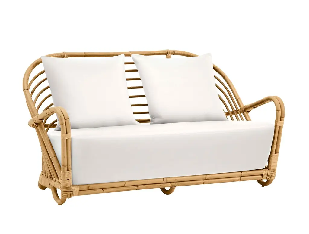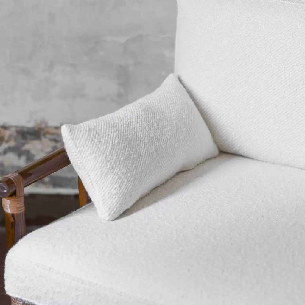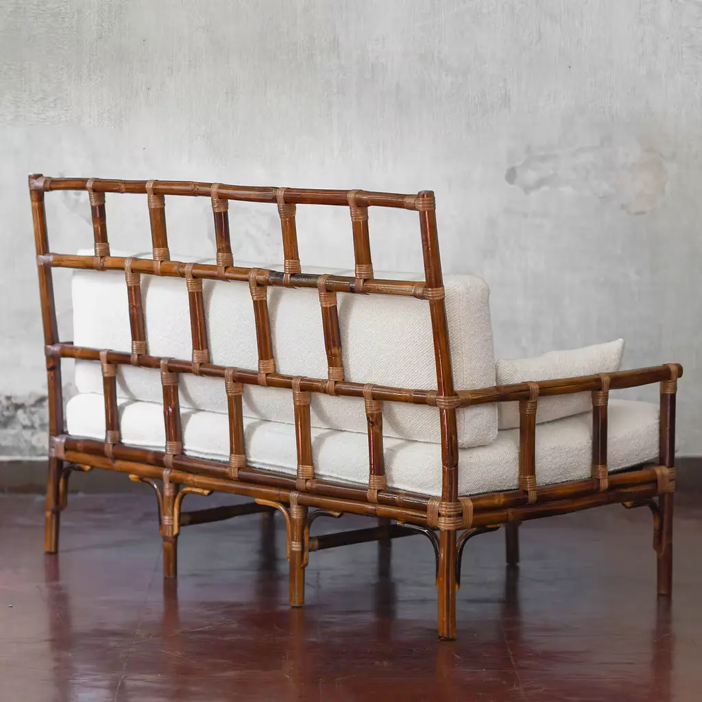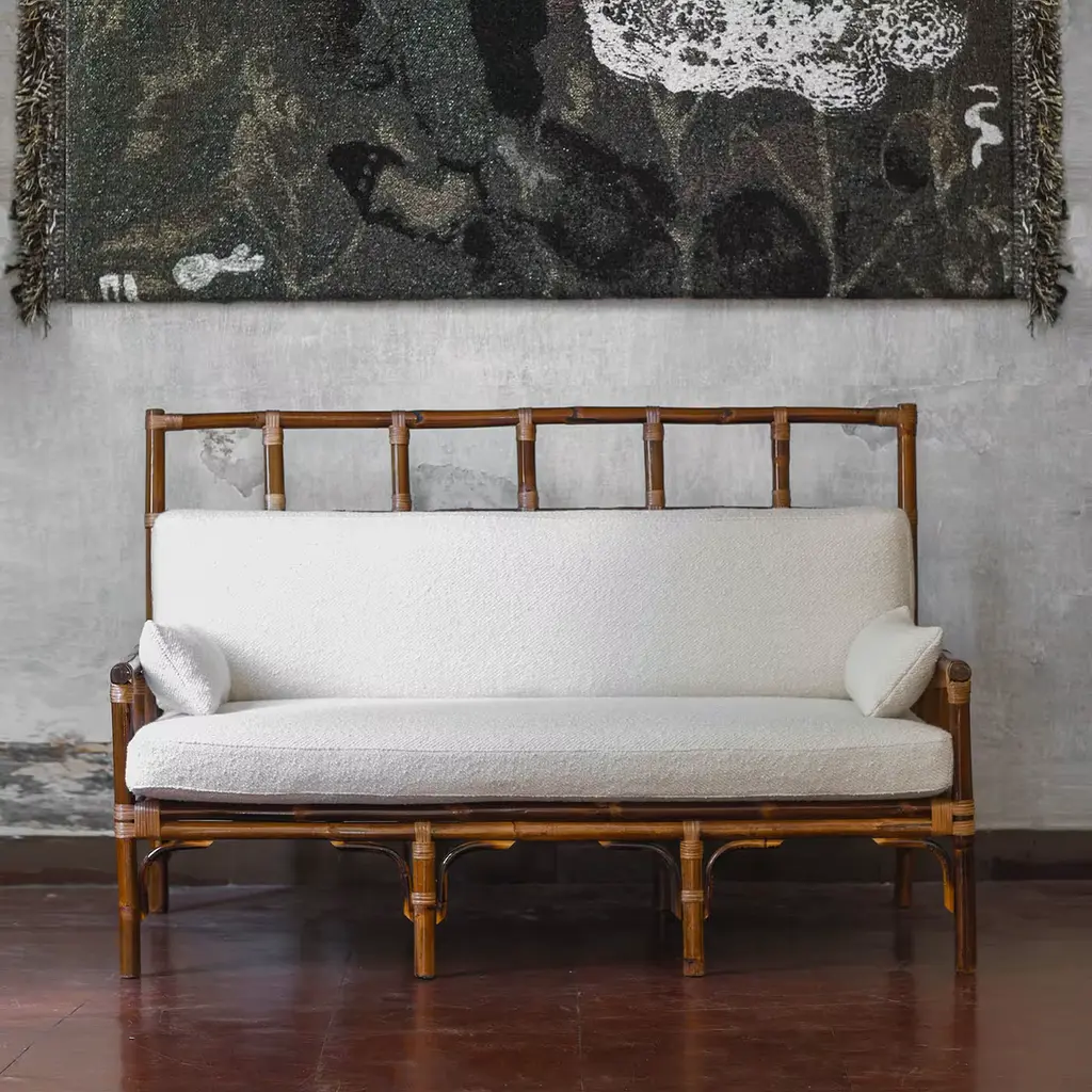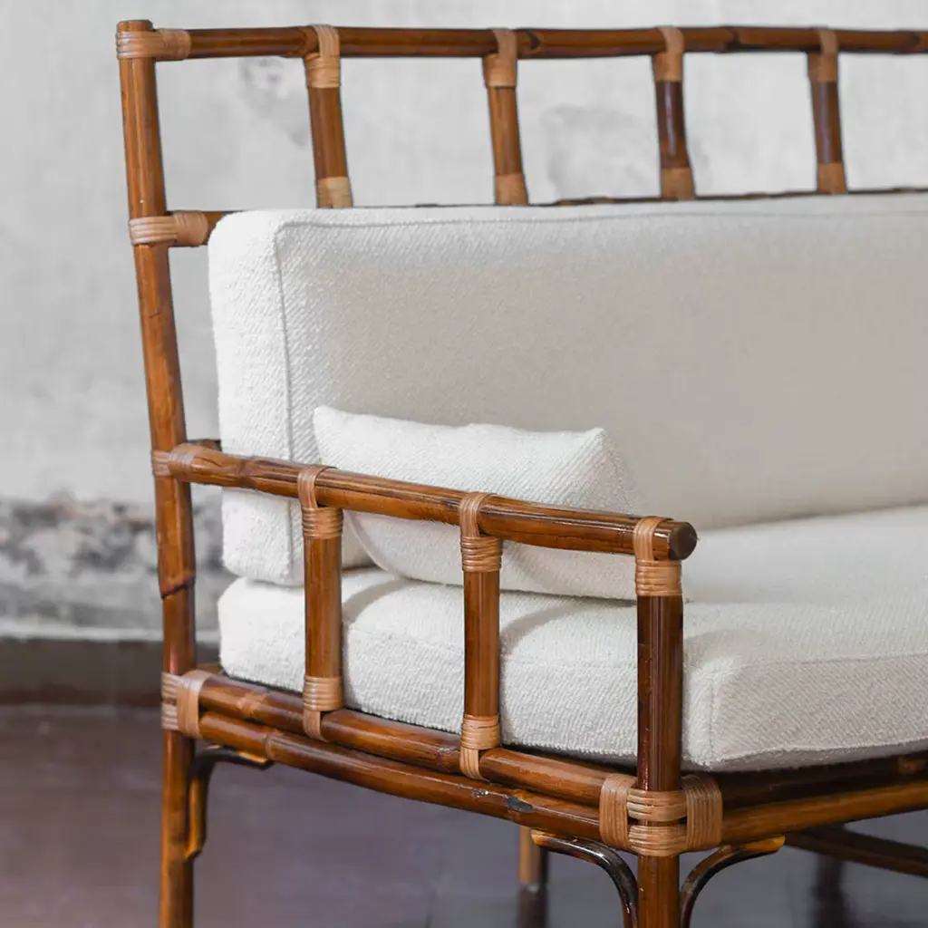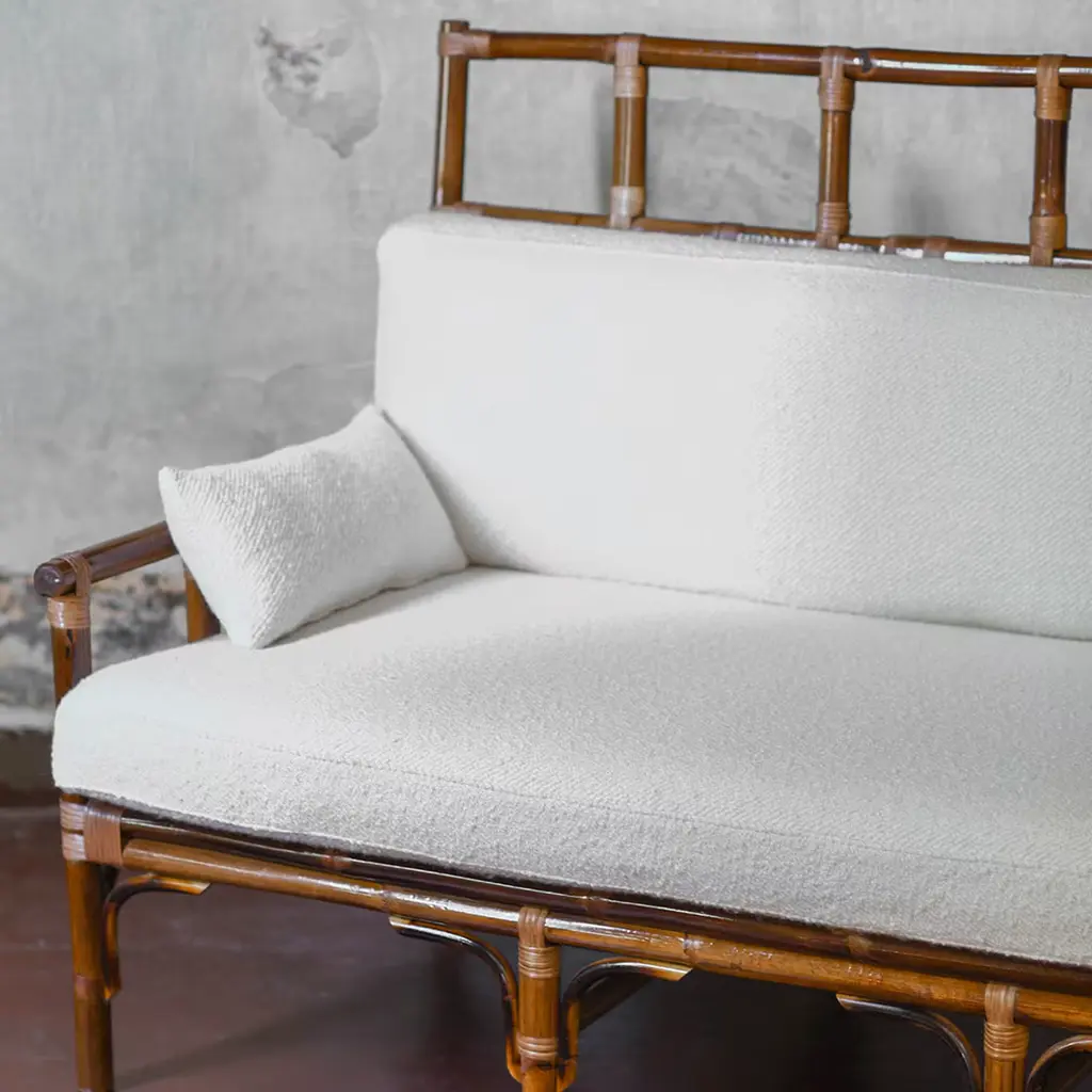 A sense of striking authenticity defines this bamboo bench, a precious artisan piece perfect for complementing porches or patios. Leather bindings keep its frame together, while utmost comfort is ensured by the cushioned seat and backrest that share the pair of loose cushions in the same luminous white Dedar fabric cover.