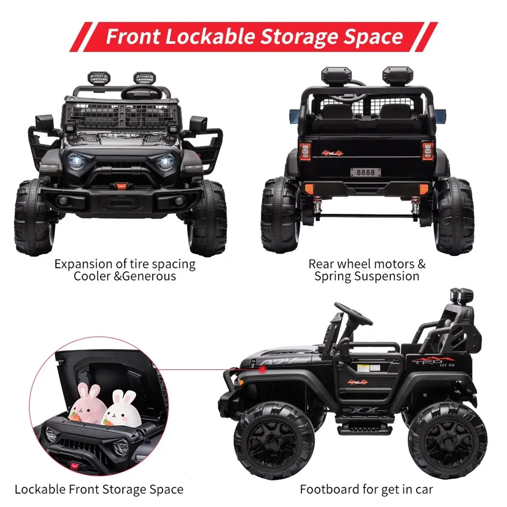 This ride-on vehicle is equipped with MP3, USB port, FM radio, LED headlights, horn, Bluetooth, and bottle holder for added fun. The front storage bin allows kids to bring their toys along for the ride. Parents can use the remote control to enjoy quality time with their child, while kids can operate the car themselves using the foot pedal for ideal speeds. Each wheel features an independent bearing for smoother steering. The ride on truck equiped 24V 9ah battery and 2*120W powerful motors.Coordinate with 14.2" large-sized wheels, can better reflect the off-road performance,can adapt to various terrain and provide continuous power in any condition! Metal spring shock absorbers, forward and reverse gears, high and low-speed settings, and easy operation enhance children's hand-eye coordination while providing a smooth and comfortable driving experience. A perfect gift choice for exciting playtime!