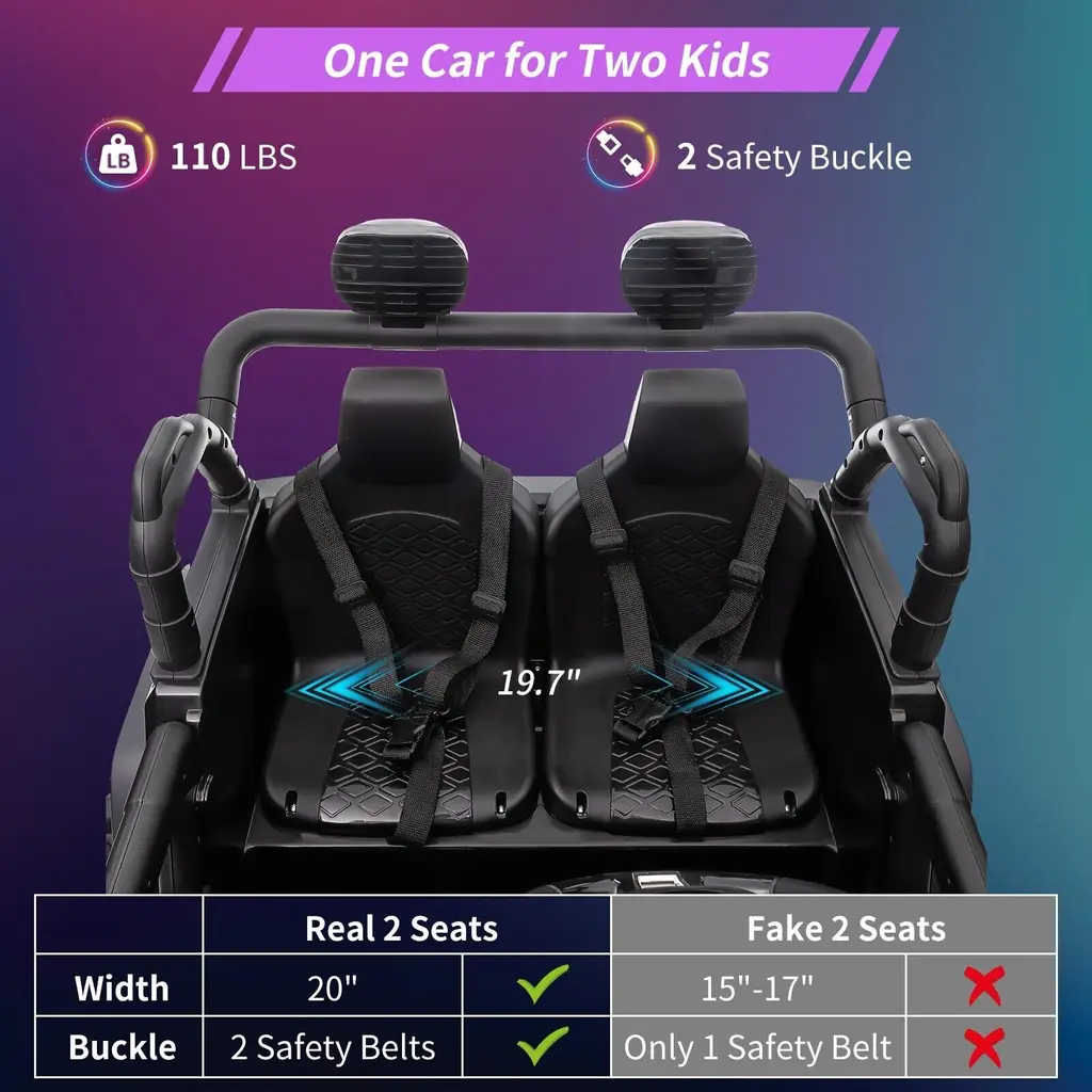 [Entertainment Features]: This ride-on bike comes pre-equipped with MP3, USB ports, bright LED headlights and taillights to enhance kids' fun. The tail with scoop adds an extra element of enjoyment. After 8-12 hours of charging, playback time lasts for 1.5-2.5 hours. [Real TWO Seats]: With overall dimensions of 47.6" x 33" x 32.3" (L x W x H) and a seat width of 19.7", this two-seat design can easily accommodate two children under 4 years old Or 1 child aged 3-8 years. The vehicle is equipped with 2 seats and 2 single seat belts, which can accommodate 1 to 2 children. [Manual and remote control]: Parents can use the remote control to share happy moments with their children, and the children can operate the vehicle independently using the foot pedal to control the desired speed. Each wheel is equipped with independent bearings for smoother steering. [4 Strong Motors]: The ride-on truck is powered by a 24V 7ah battery and four 45W powerful motors, showing excellent off-road performance. It can handle various terrains and provide continuous power in various conditions, easily conquering slopes up to 20°. [Double package delivery]: Due to logistics restrictions, the bike will arrive in two packages. Please wait for the delivery of both packages. Once you receive the package, please refer to the installation video and user manual to properly assemble the truck.