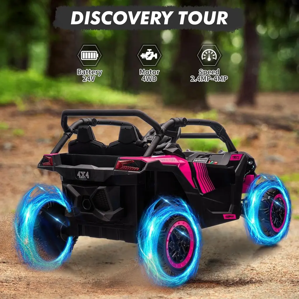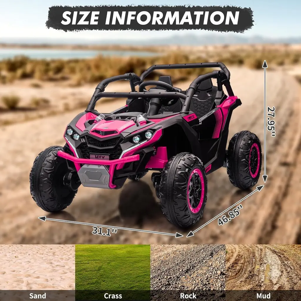 Powerful 4WD Performance:This 24V 2-seater kids ride-on UTV features a robust 4WD system, allowing for adventurous off-road experiences. With excellent traction and stability, it can navigate various terrains, from grassy yards to gravel paths, ensuring endless outdoor fun. Convenient Remote Control:Equipped with a parental remote control, this UTV allows parents to manage speed and direction, providing added safety for younger children. This feature enables parents to enjoy peace of mind while their little ones explore and drive independently. Enhanced Safety and Comfort:Designed with four shock absorbers, this electric UTV offers a smooth and comfortable ride, even on bumpy surfaces. The spacious seating allows two kids to ride together, while secure seat belts ensure safety during every adventure. Exciting Features for Endless Entertainment:This ride-on UTV includes a one-click start function for easy operation and a built-in music player that lets kids enjoy their favorite tunes while driving. The vibrant LED lights add to the fun and visibility, enhancing the overall driving experience. Perfect Gift for Young Adventurers:Designed for kids ages 3 and up, this electric truck makes an ideal gift for birthdays or special occasions. It promotes outdoor play, teamwork, and imaginative adventures, making it a perfect choice for young explorers and their friends.