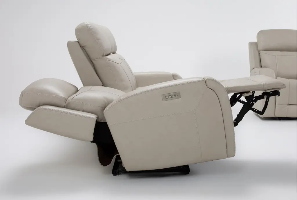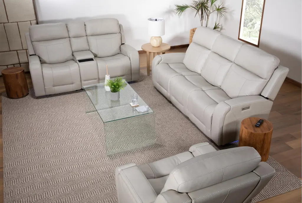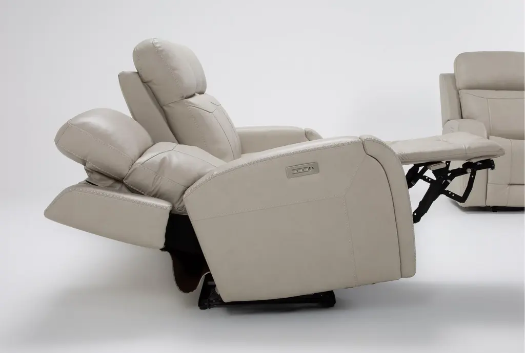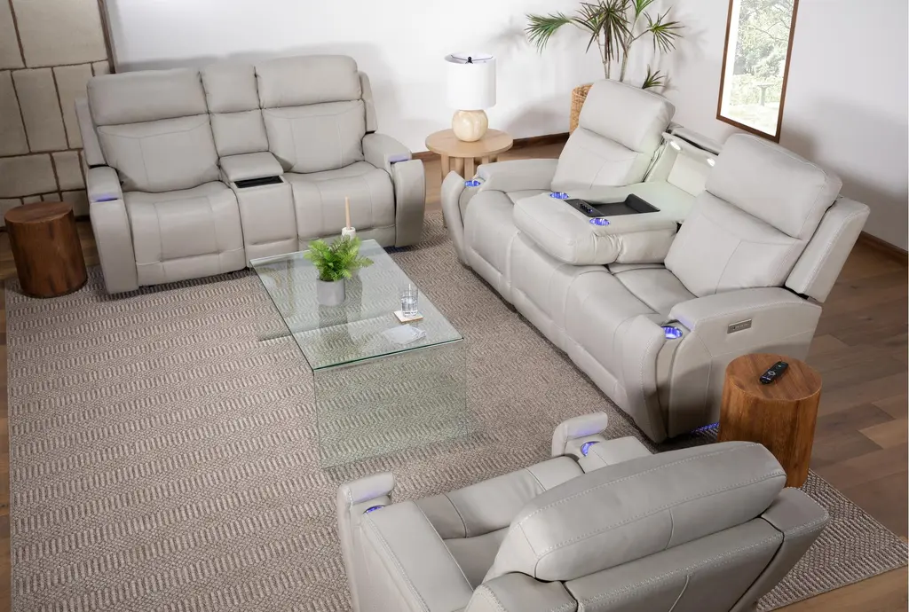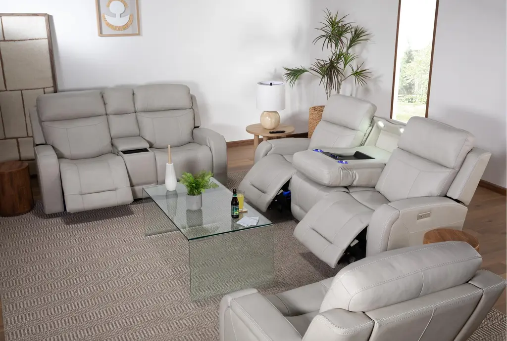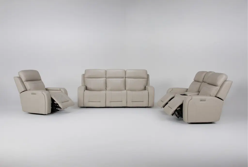 Experience ultimate comfort and style with the 3 Piece Matrix Cream Leather Power Zero Gravity Reclining Audio Living Room Set. This casual set includes a sofa, console loveseat, and recliner, all designed to provide a luxurious seating experience. The cream leather upholstery adds a soft, neutral touch to any living room decor.