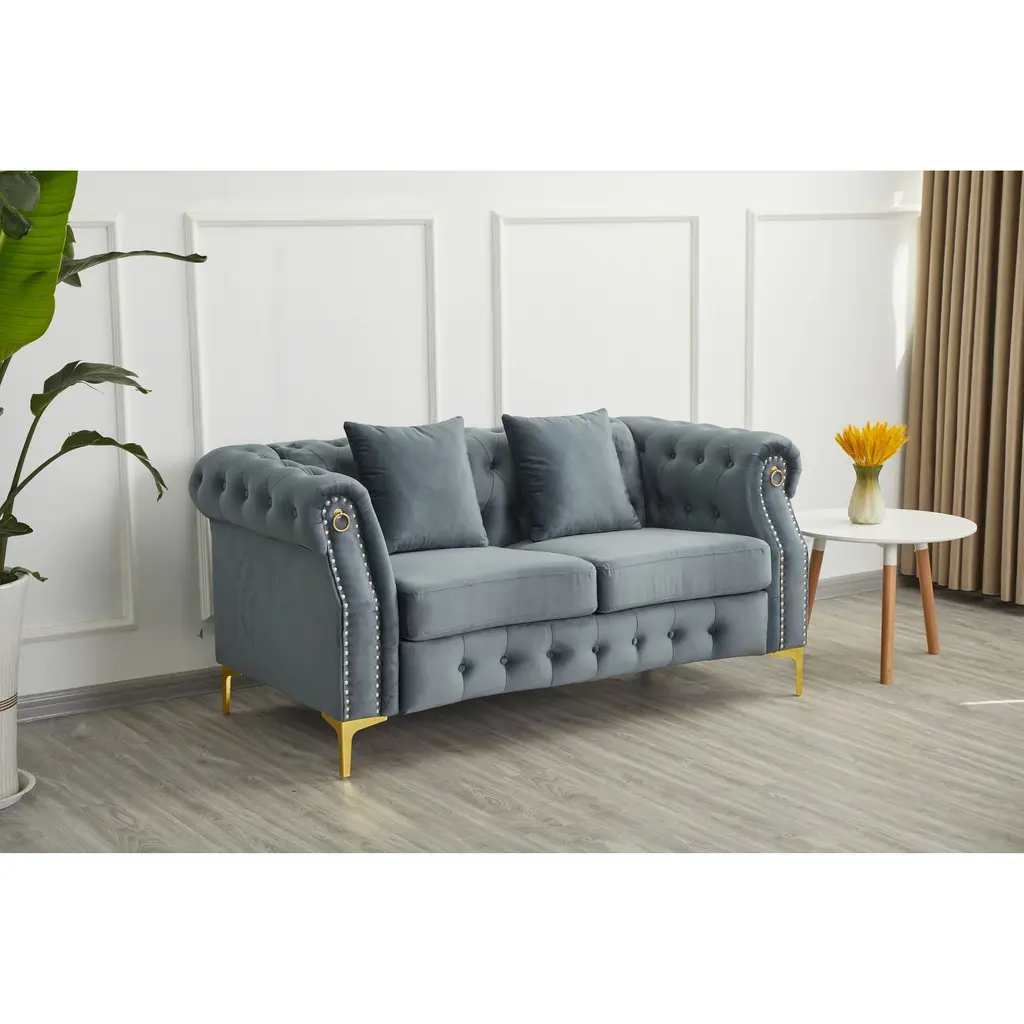 This loveseat adds classic glam style to your living room or den. It's built with a solid and engineered wood frame and rests on turned legs with a brown finish. The velvet upholstery features deep button tufting studded that add just the right amount of sparkle to your seating area. This loveseat also has deep seating and exceedingly comfortable cushions, specifically designed with your comfort in mind. This loveseat is the ideal addition to any living room. It features flared arms, a tufted back, and nailhead trim. Beautifully styled and consciously crafted using materials, makes a welcome addition to any living space.Feature:Dimensions: 35" D x 65" W x 30.3" H Sofa: 35.00"D x 85.00"W x 30.3"H Velvet Chesterfield Button-tufted Sofa click 40968588Loveseat and Sofa Living Room Set: Velvet 2 Piece Loveseat and Sofa Living Room Set click 40968587