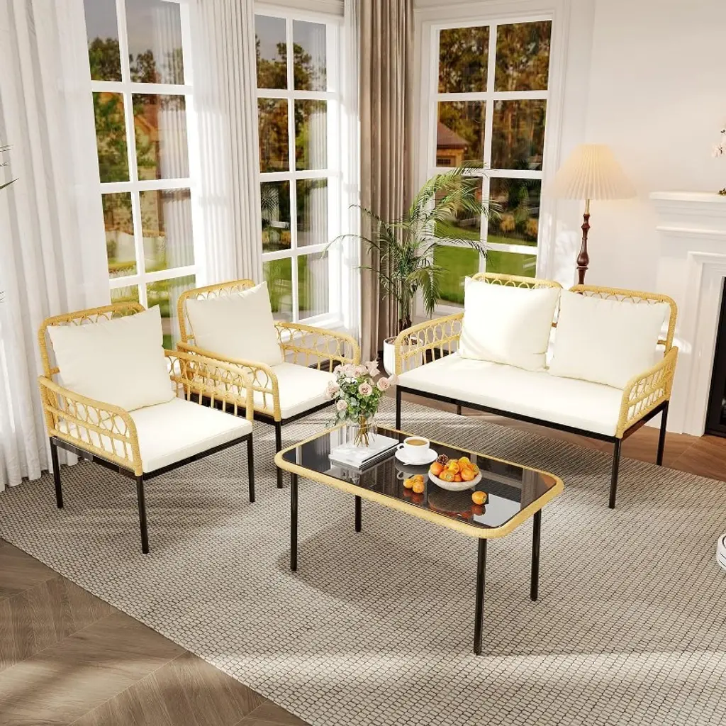 1. Complete 4-Piece Outdoor Patio Set Includes 1 loveseat, 2 spacious cushioned armchairs, and 1 rattan-wrapped glass-top coffee table Perfectly suited for small to medium outdoor spaces such as patios, decks, porches, balconies, and pool areas Lightweight yet durable design allows easy movement and repositioning, inside or outside your home 2. Durable & Weather-Resistant Construction Handwoven PE rattan mimics natural rattan’s look and feel but offers enhanced weather resistance Built on a robust powder-coated steel frame that resists rust, cracking, and fading from sun exposure Adjustable anti-slip feet provide added stability on various ground surfaces, ensuring safety and comfort 3. Superior Comfort with Easy Maintenance Thick sponge cushions and soft back pillows offer plush, ergonomic seating for extended relaxation Cushion covers are made from waterproof, fade-resistant polyester fabric for long-lasting color retention Cushions are removable for convenient cleaning; the glass-top table surface wipes clean effortlessly 4. Space-Smart Dimensions Loveseat: 26.8" W x 49.6" L x 32.1" H — comfortably seats two adults Armchairs: 26.8" W x 26.2" L x 32.1" H — spacious and supportive design Coffee Table: 35.4" L x 19.7" W x 17.5" H — perfect height and size for drinks, snacks, and décor