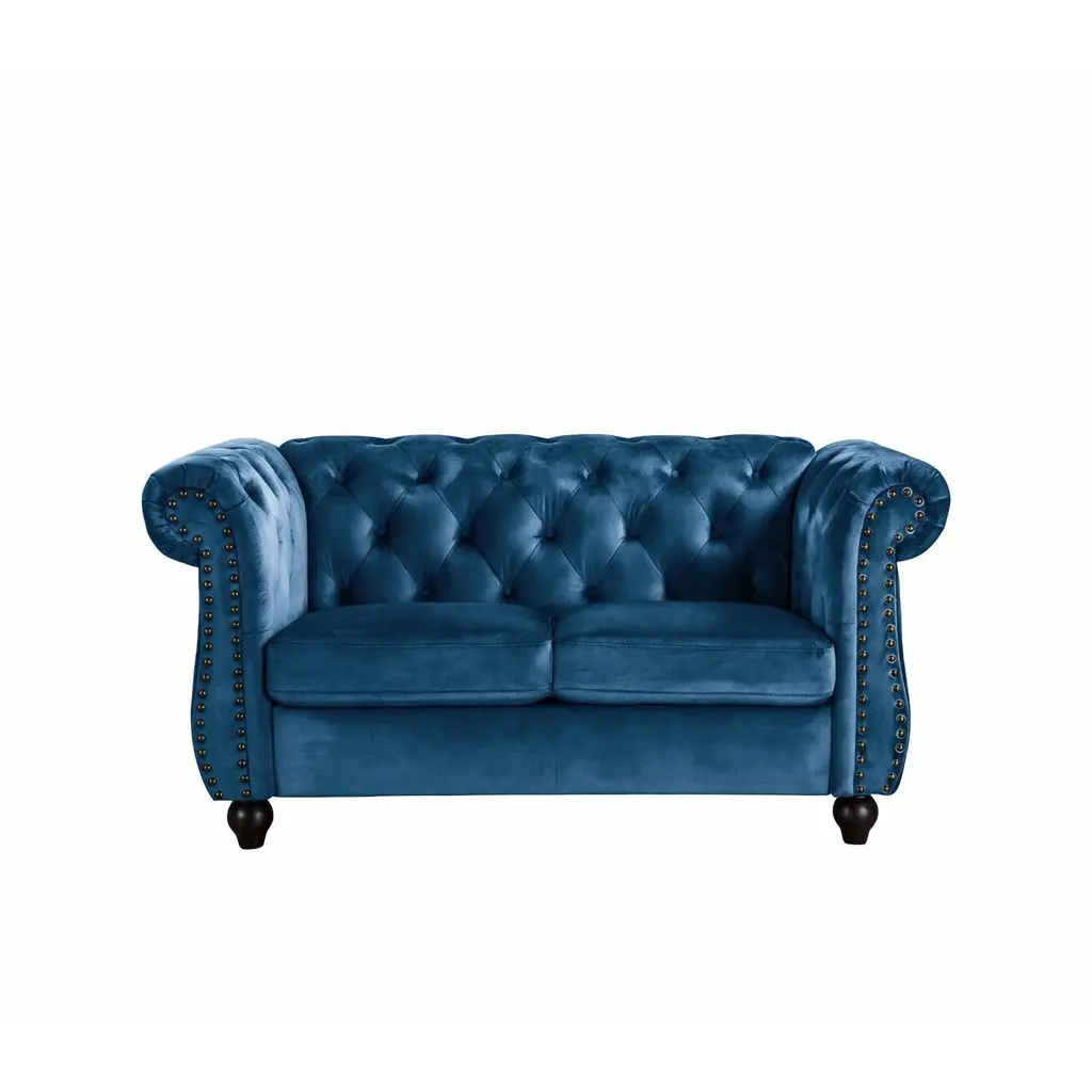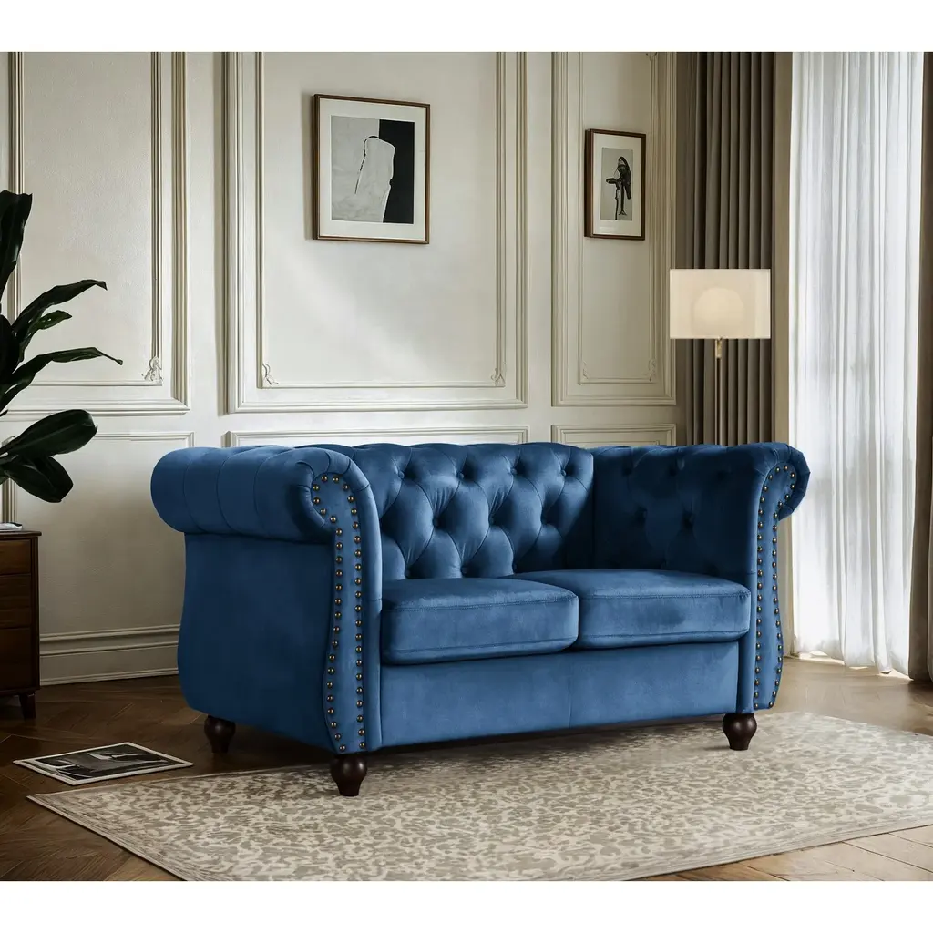 61.4" W Velvet Chesterfield Loveseat For Living Room With Nailheads - Dark Blue