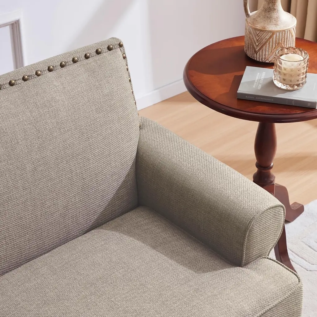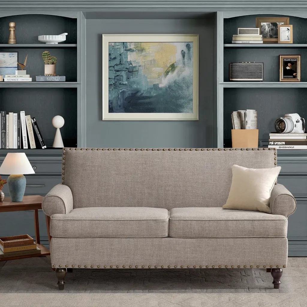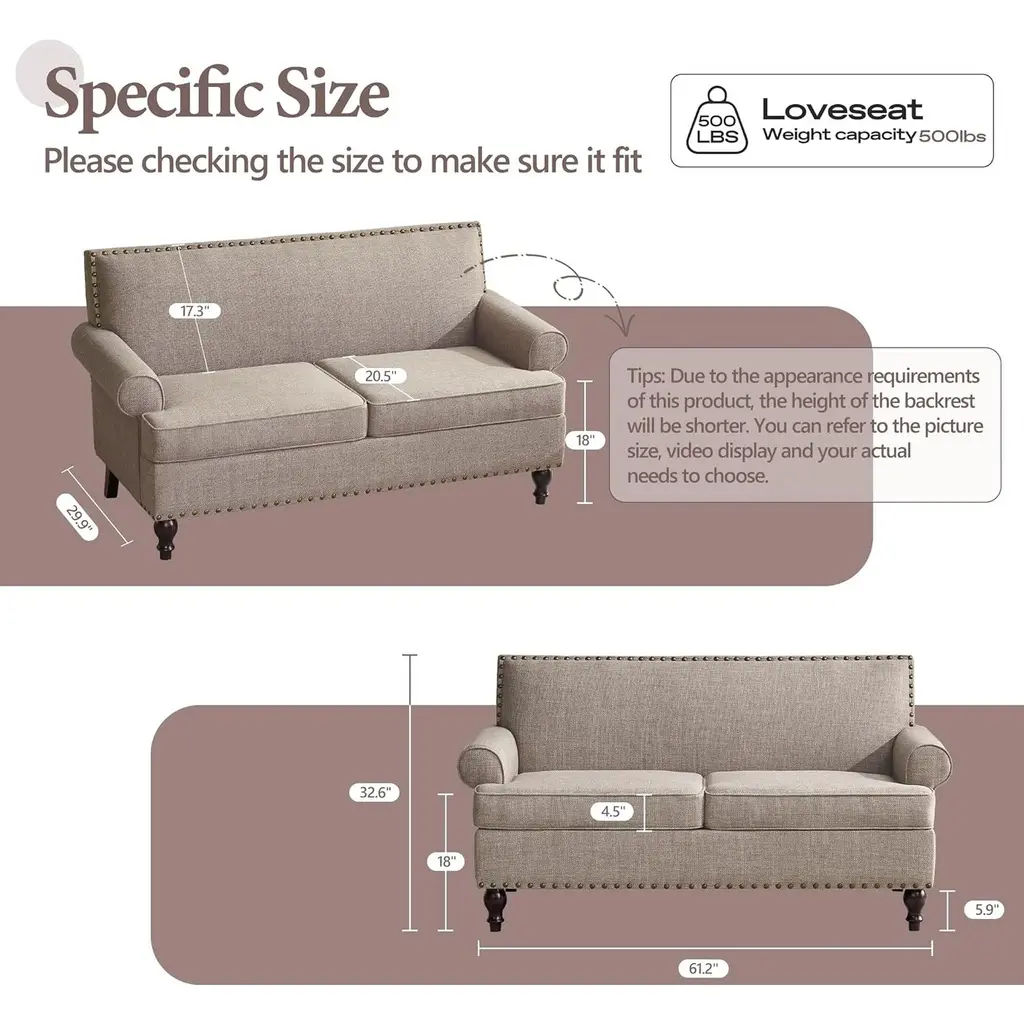 ▷Design and Comfort:The surface of our love seat sofa is made of basket weave imitation linen fabric, which is soft and skin-friendly; the combination of the woven texture and the unique rivet design adds a mysterious retro element to this love seat, bringing you a double surprise of sight and feeling. ; Seat cushion made of high elastic sponge, allowing you to enjoy unparalleled comfort ▷Solid and Reliable:The internal frame of this loveseat sofa is made of solid wood, and its rugged design ensures stability and strength. Please believe that this living room sofa can stand the test of time and provide you with reliable use for many years. ▷Ergonomic Design:Our loveseat couch accords with the ergonomic backrest Radian and is perfectly designed to support the human body. The wide and thick handrail design can also provide a perfect place for your arms to rest and bring physical and mental relaxation. ▷Ergonomic Design:Our loveseat couch accords with the ergonomic backrest Radian and is perfectly designed to support the human body. The wide and thick handrail design can also provide a perfect place for your arms to rest and bring physical and mental relaxation. ▷Easy Installation: Due to the large size of our upholstered sofa, the product will be sent in two packages with instructions and screw packages inside, which can be easily installed as long as you follow the instructions.