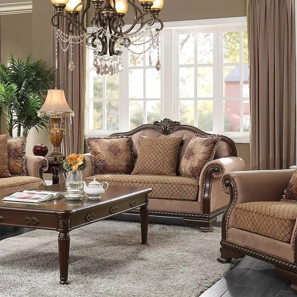 The Chateau De Ville sofa set surrounds you in a warm and cozy embrace. Wood carved details with nail-head accent embody a timeless look with an old world flair. Floral decorative pillows and upholstered cushions with tufted details soften the whole construction, infusing luxury and comfort into the sofas. The sofa set uses pocket coil spring in the construction of seat cushions for extra support and durability while removable cushion and back cover for easy disassembly and cleaning. Comfortable, inviting, and full of style, the Vomoldrot sofa set will be an alluring focal point in any living room.