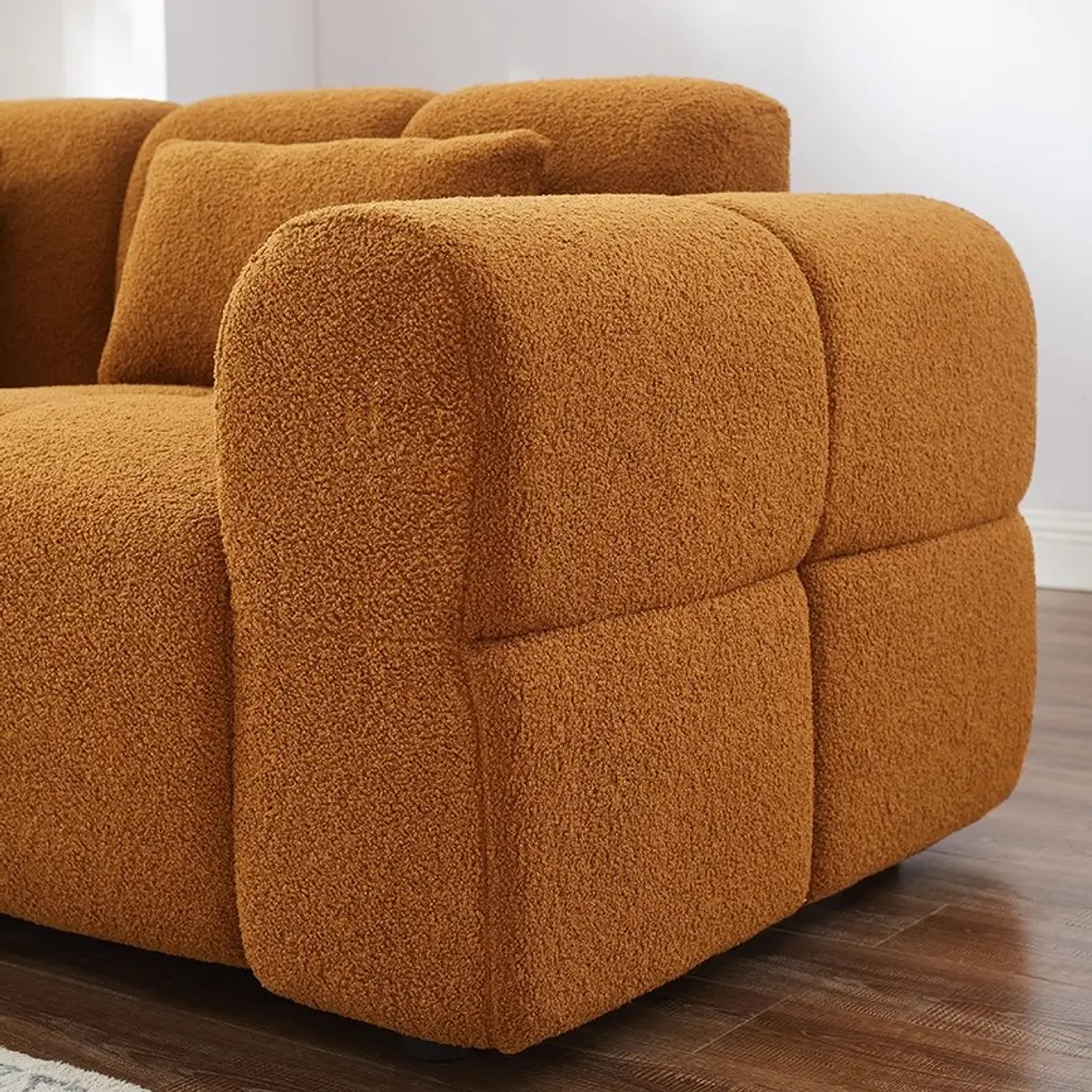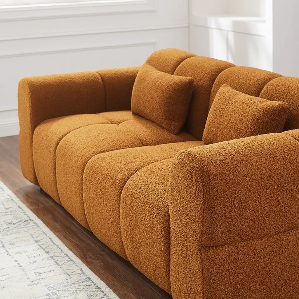 Our modern couch is a must - have for your living room. Made with plush lamb fleece fabric, it offers a soft and cozy touch. The thick cushions provide an extremely comfortable seating experience. Accompanied by two pillows, it not only enhances comfort but also adds to the elegant look. The overall shape of the cloud couch is square, and the cushions and backrest present a blocky design with clean and smooth lines that have a modern feel. This loveseat combines comfort and aesthetics perfectly. The fabric of the living room couch is made of boucle material. With a soft touch, it can give people a comfortable and cozy feeling. The cushions and backrest of the boucle sofa look thicker, and its internal filling is full of foam, which can provide good support to ensure the comfort of sitting and lying for a long time. The shape of the plush couch presents a modern minimalist style. It has a square silhouette and clean lines, cushions and backrests present a block division, this design is not only beautiful, but also gives people a kind of neat visual feeling. In addition to the support provided by the thick cushions and backrest, the addition of two pillows further enhances the comfort of the loveseat sofa, where people can rest, read or watch TV in comfort.