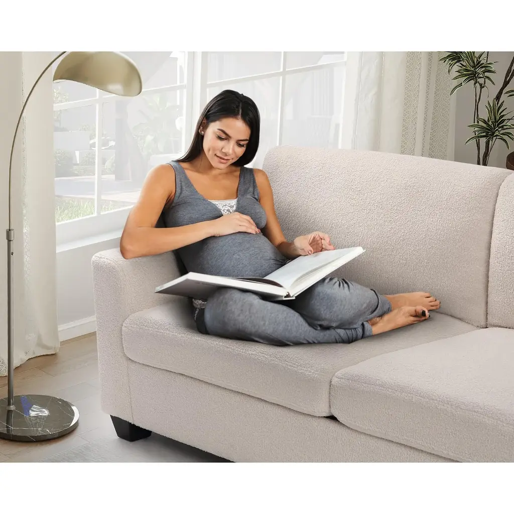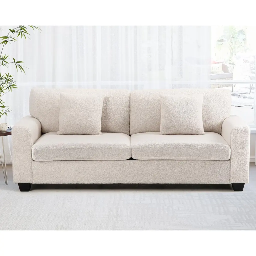 This extra-long sofa gives you a convenient centerpiece for your living room, allowing multiple people to stretch out and relax for movie night or the big game. Built with a solid wood frame and durable steel legs, this sofa offers a maximum weight capacity of 900 lb for safety and stability. Wrapped in corduroy fabric, this couch is filled with foam to provide just the right amount of support as you lie back and enjoy a few magazines after a long day. Square arms, a loose back, and accent pillows complete the look.Modern Sofa: Elevate your space with the exquisite charm of tufted teddy velvet fabric, offering a luxurious and inviting feel. This sofa strikes the perfect balance between comfort and modern elegance, making it a delightful addition to your living room or home office.Irresistible Comfy Sofa: Indulge in ultimate relaxation with highly elastic cushions, soft fabrics, and oversized proportions that provide a cocoon-like comfort. The plush backrest and wide armrests cradle you in a nurturing embrace, allowing you to unwind effortlessly day after day.Durable Sofa: Crafted with premium hardwood, sinuous springs, and high-density foam, this loveseat offers exceptional durability and support. With a weight capacity of up to 900 pounds, rest assured of the safety and longevity of this sturdy piece, perfect for all your lounging needs.Teddy Velvet Fabric: Crafted from premium teddy velvet fabric, this sofa boasts a unique grainy texture and silky soft touch. The tufted design adds a touch of sophistication, while the simple yet fashionable aesthetic complements a variety of decor styles. Create a cozy and stylish leisure space with this high-quality piece.