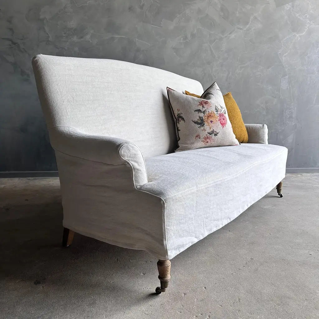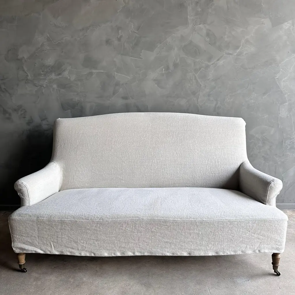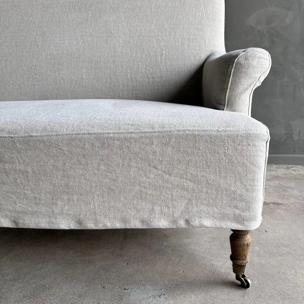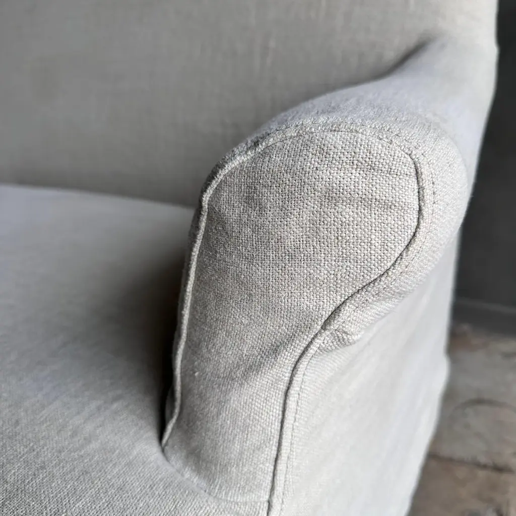 Introducing the Alma Loveseat - a timeless piece crafted for comfort and style. Made with heavy-weight linen and slipcovered in a soothing oatmeal hue, this settee exudes a natural and relaxed elegance. The 18oz linen fabric offers a soft touch, perfect for cozying up with a book or enjoying your favorite TV show. Resembling a classic French Napoleon style sofa, the Alma features turned white oak legs with a medium finish and charming antique-style caster wheels. The machine-washable slipcover ensures easy maintenance, while dry cleaning is recommended for optimal care. Designed for extended seating comfort, the Alma Loveseat is your perfect companion for moments of relaxation and leisure.Fabric: 100% pure linen Color: Greige Natural Size: 72" W x 36.3" D x 39" HSeat Height: 16"Seat Depth: 25"Arm Height: 23"Leg Height7"