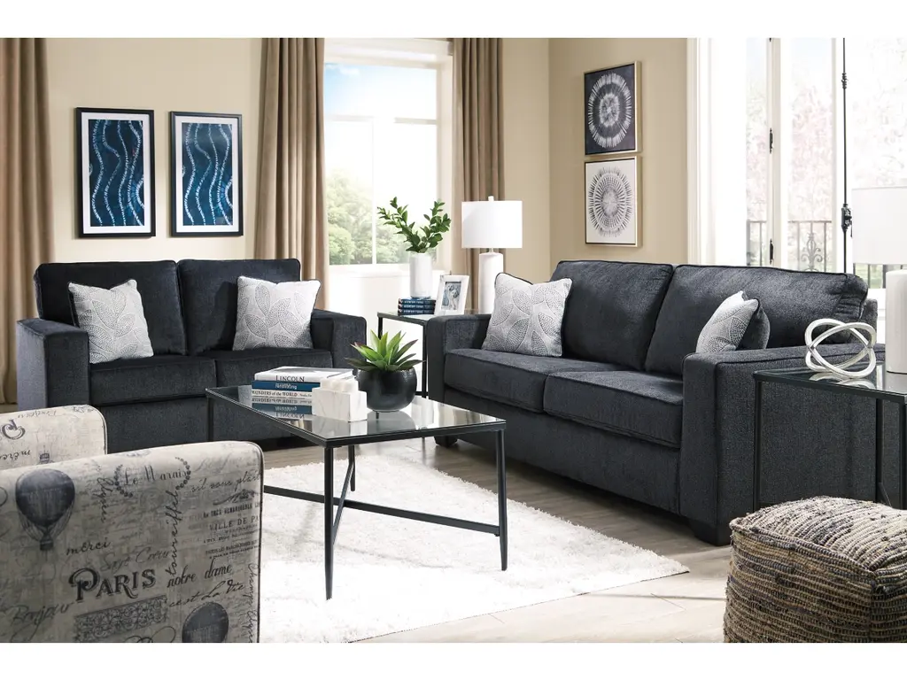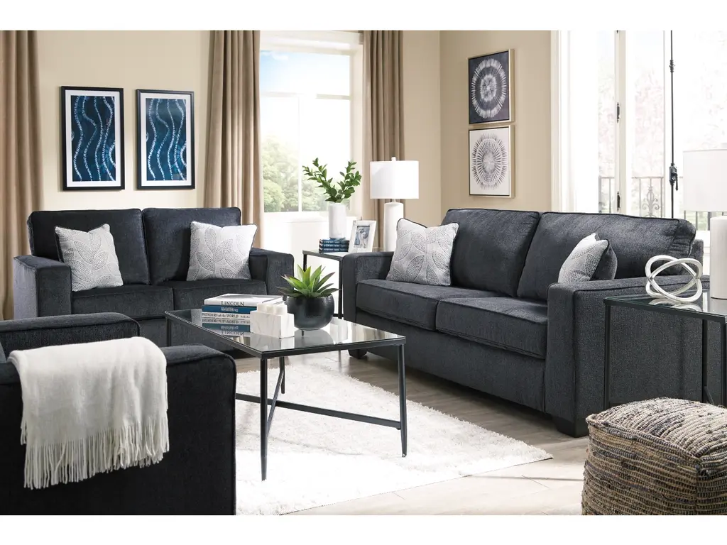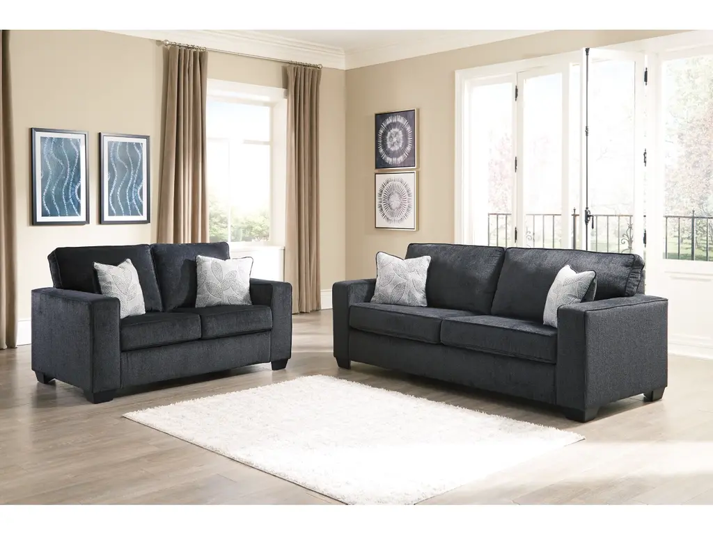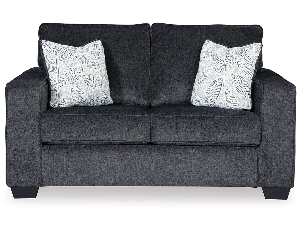 If style is the question, then the Altari loveseat is the answer. Sporting clean lines and sleek track arms, the decidedly contemporary profile is enhanced with plump cushioning and a chenille-feel upholstery that's so pleasing to the touch. Sure to play well with so many color schemes, this loveseat in slate gray includes a pair of understated floral pattern pillows for fashionably fresh appeal.