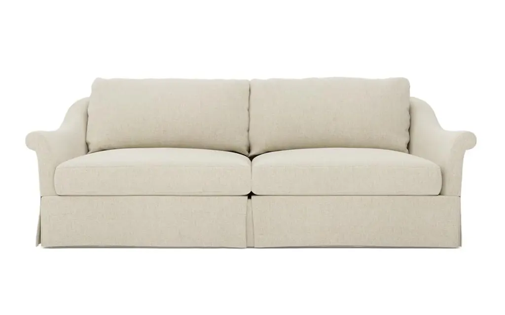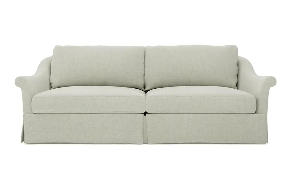 A Kathy Kuo Home exclusive, our 72” Amelie loveseat has an elegant, timeless French design. The seat cushions offer EXTRAORDINARY COMFORT, with a foam core surrounded by a blend of feathers and duck down. With flared roll arms, a skirted base, and a gently curved, subtly tapered back, the chic silhouette embodies classic sophistication and is beautiful from every angle. Choose from a variety of upholstery options, including linen and performance fabrics.