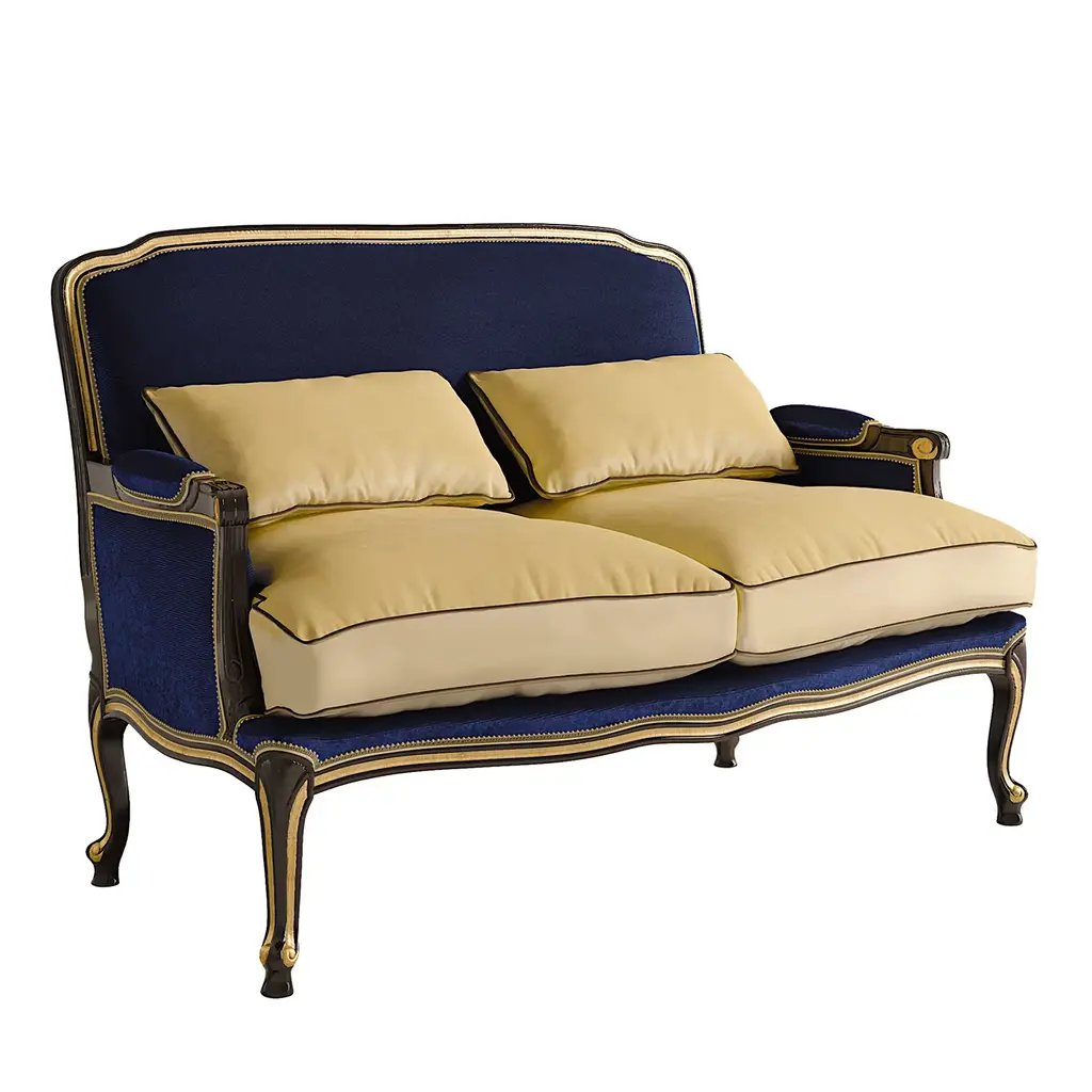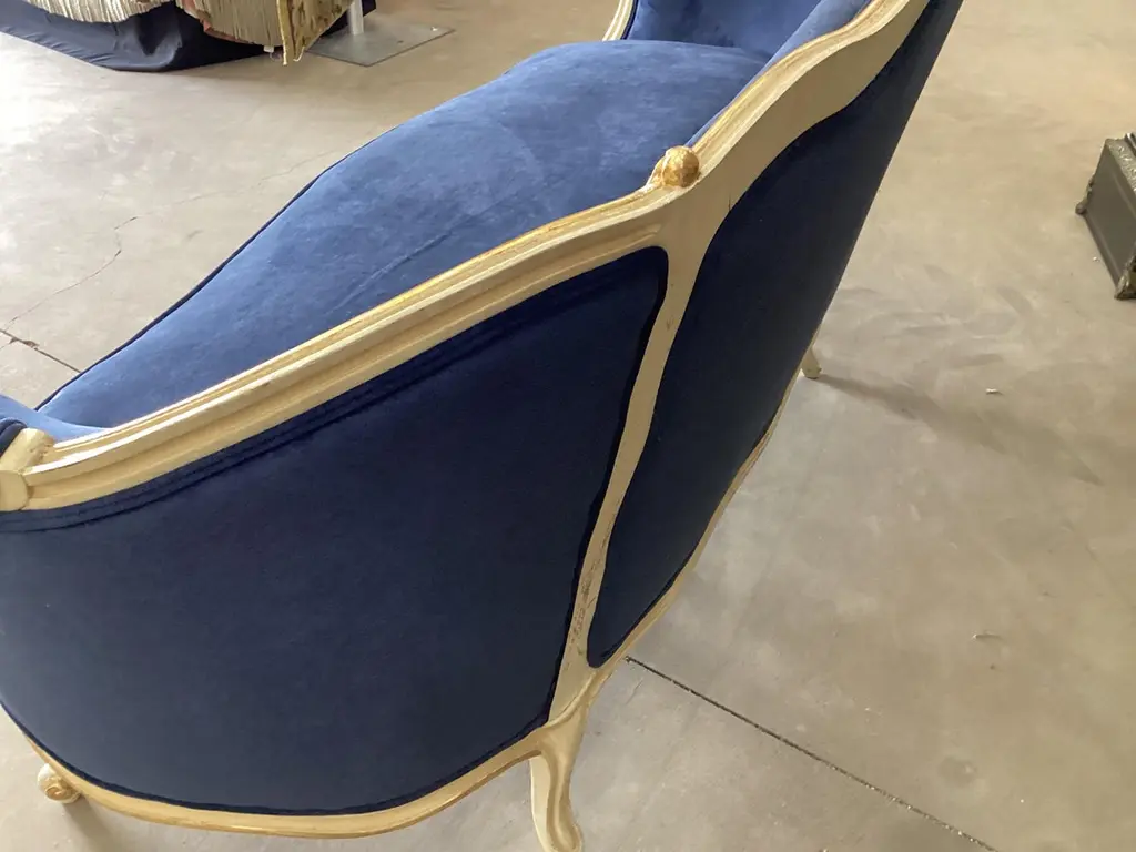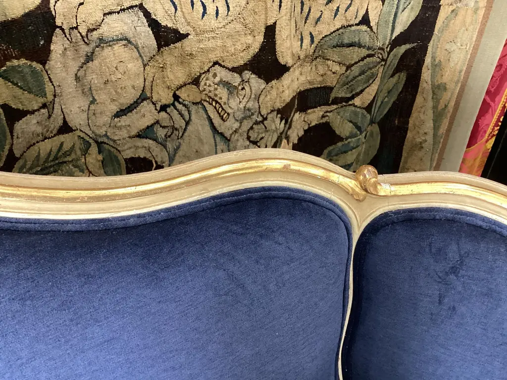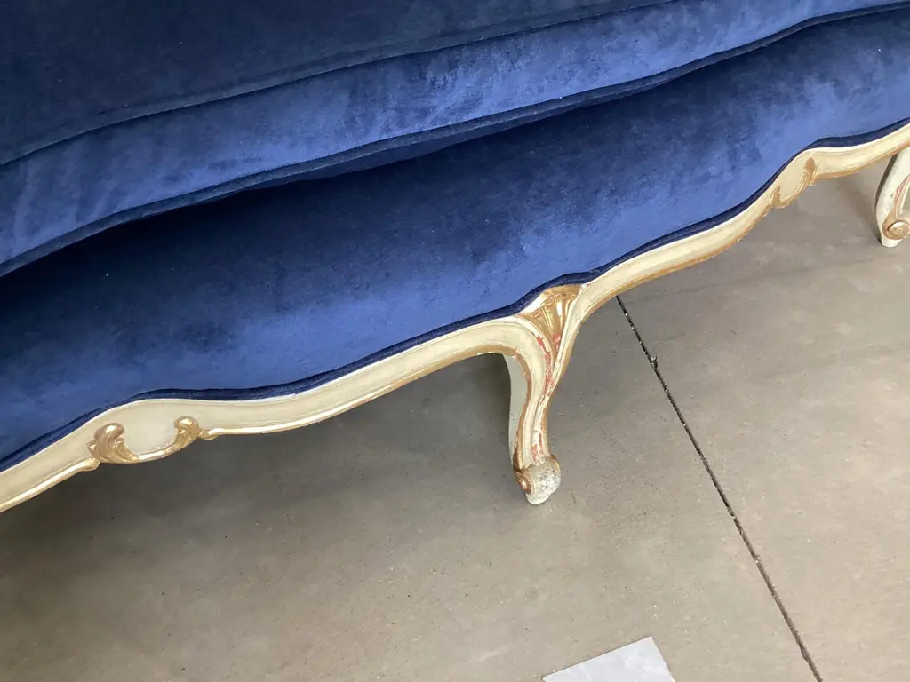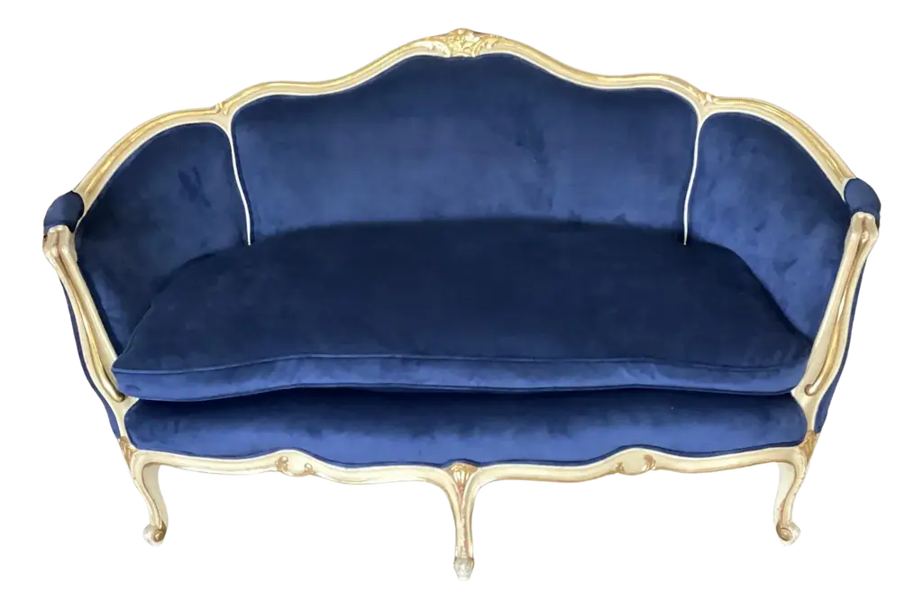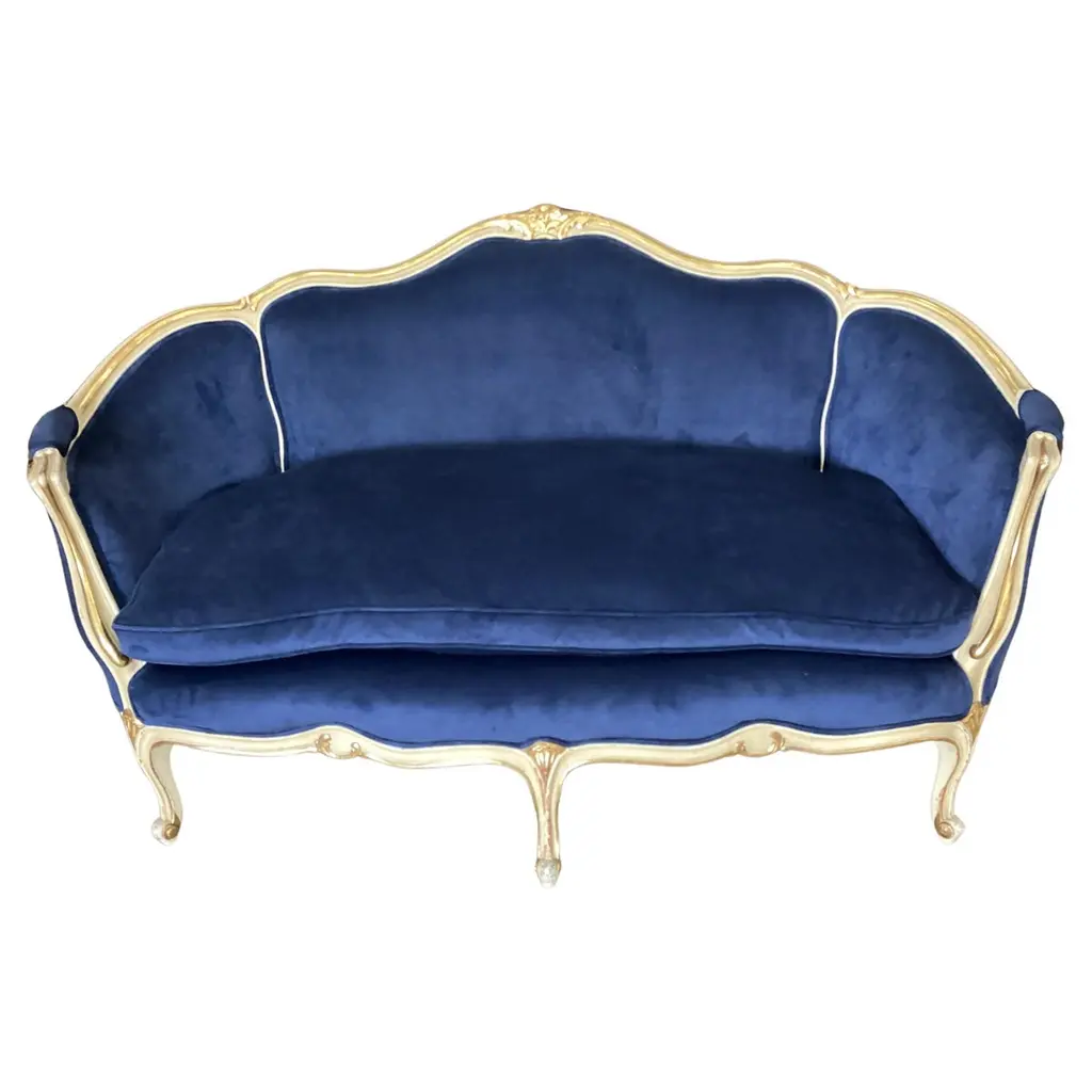 Antique Louis XV Style Painted and Gilt Settee. This is one of a pair and priced individually. Newly upholstered in a blue velvet fabric. Cream painted frame with gilt accents on typical Louis XV style scrolling legs. The pair would look great in a living room together.Please contact us for competitive shipping rates.