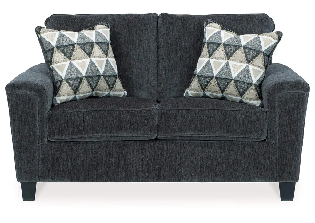 This loveseat is the ultimate in casual comfort. With a soft, plush back and seat cushions, it offers hours of soothing relaxation. Its lovely, muted shade of light grey blends effortlessly with a variety of color palettes. Two dark accent pillows with a pleasing plaid pattern provide a lovely contrast to its frame. This loveseat is a beautiful enhancement to any living room's decor. Item Contents: Item Bullets: Materials: Features: Dimensions: Accessories pictured are NOT included.