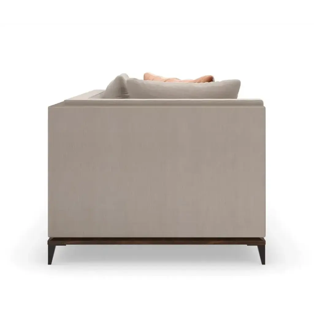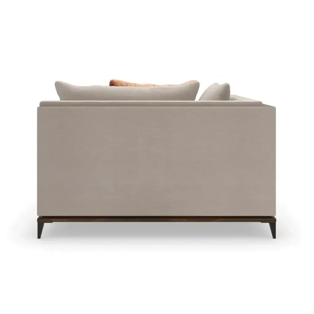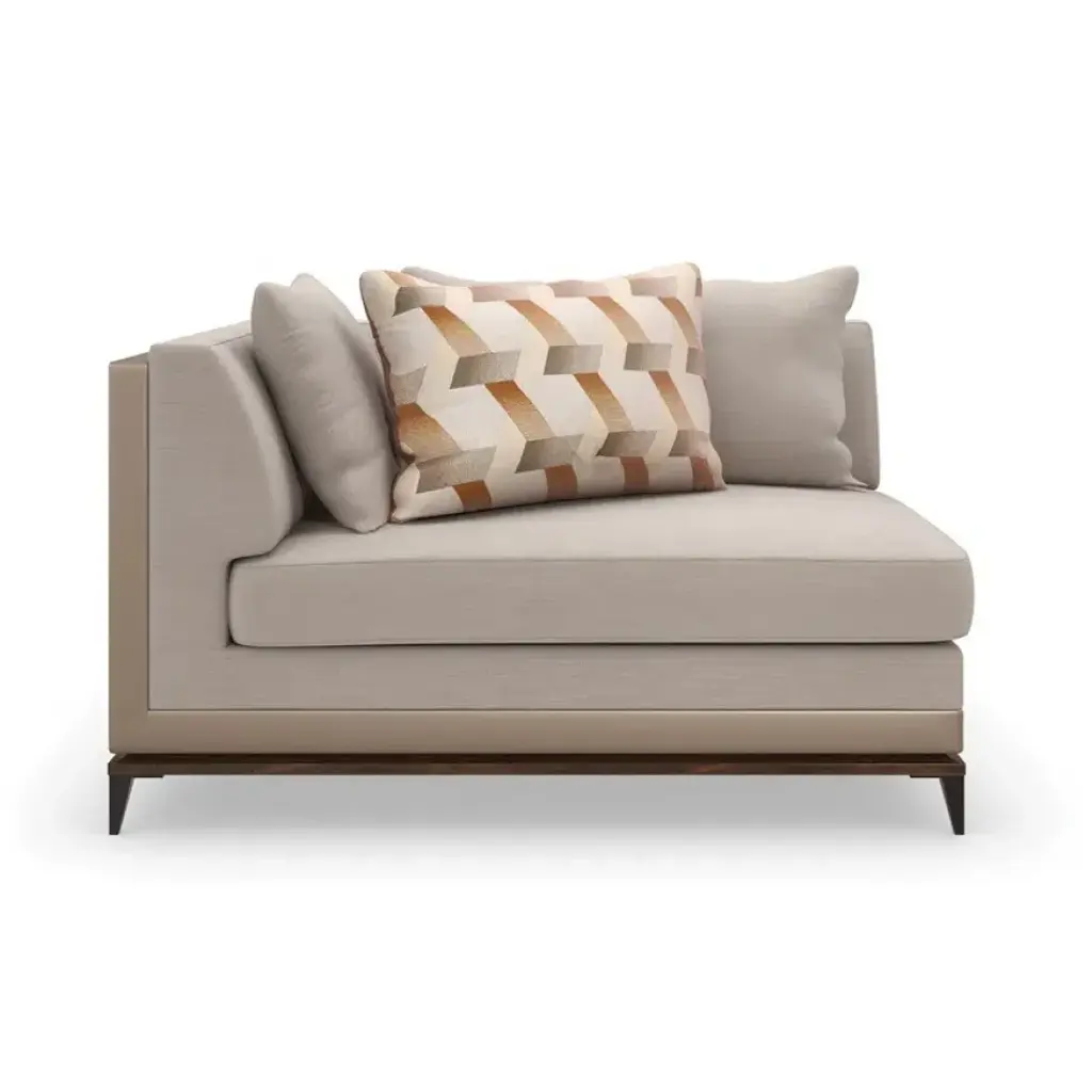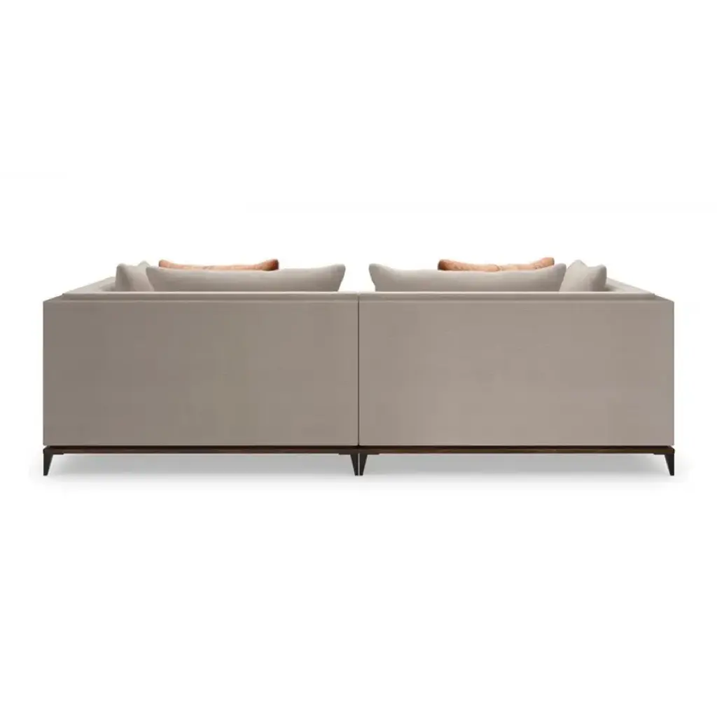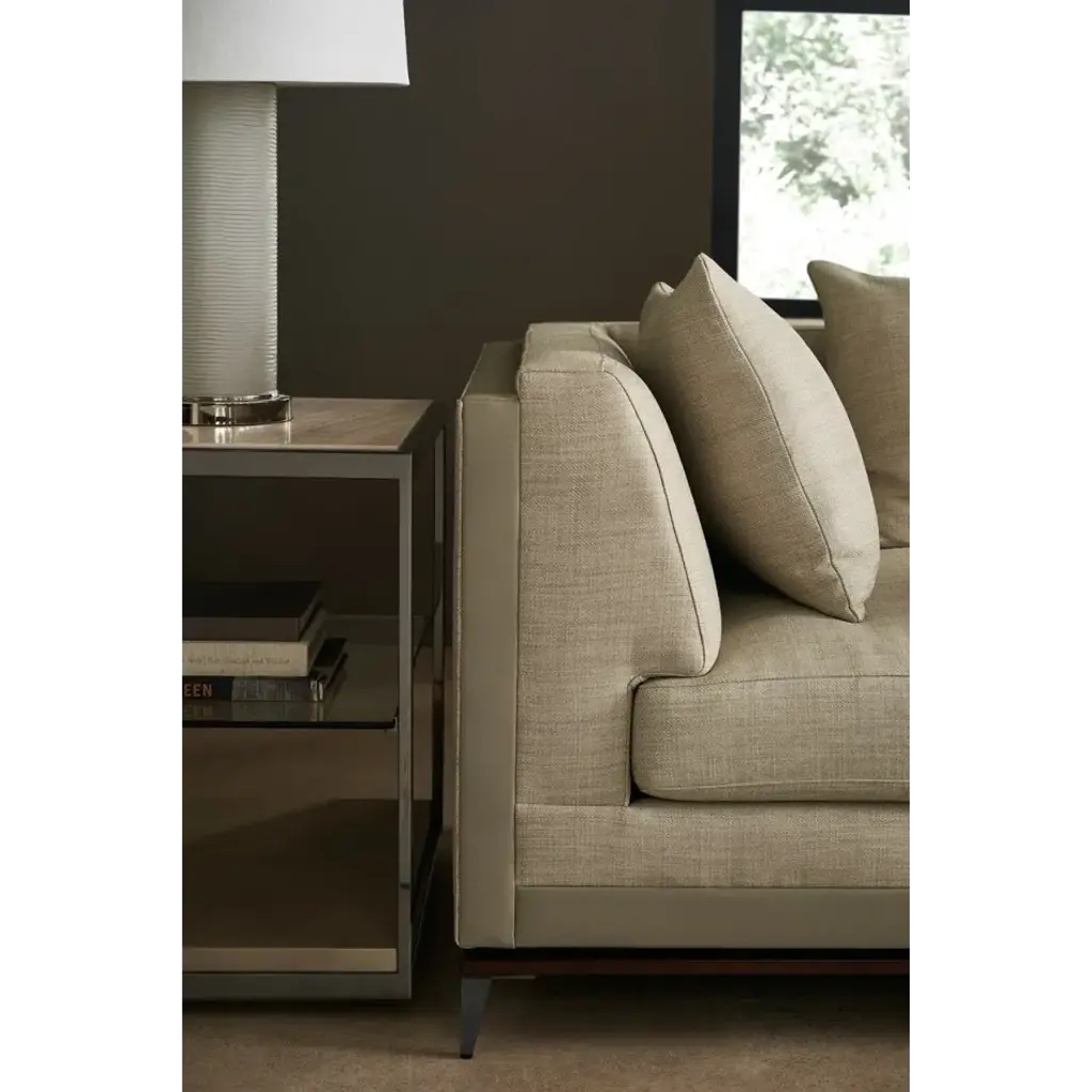 With numerous configurations and options for in-the-moment customization, the Archipelago collection introduces a relaxed sit with a refined aesthetic. Upholstered in a neutral twill fabric with a faux leather accent, and elevated on an exposed Bourbon Glaze wood base with metal legs in a Deep Bronze finish. Style luxe down pillows with a color-blocked expression of saffron velvet, or reverse to display an embroidered, geometric pattern. Collection also includes an armless chair, and matching armchair.