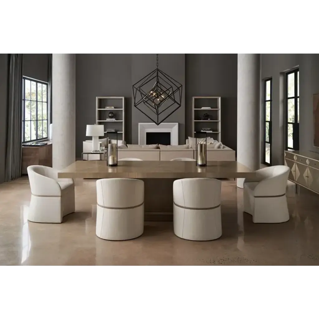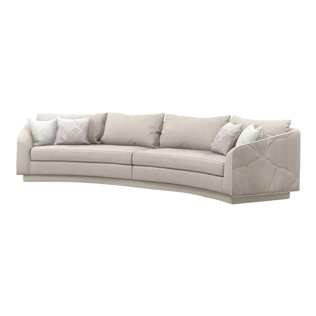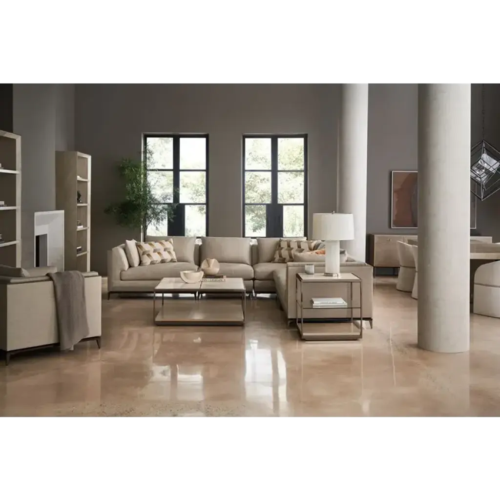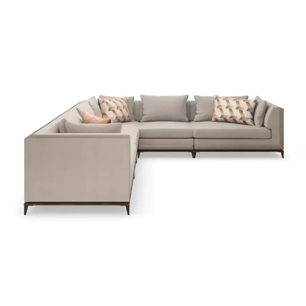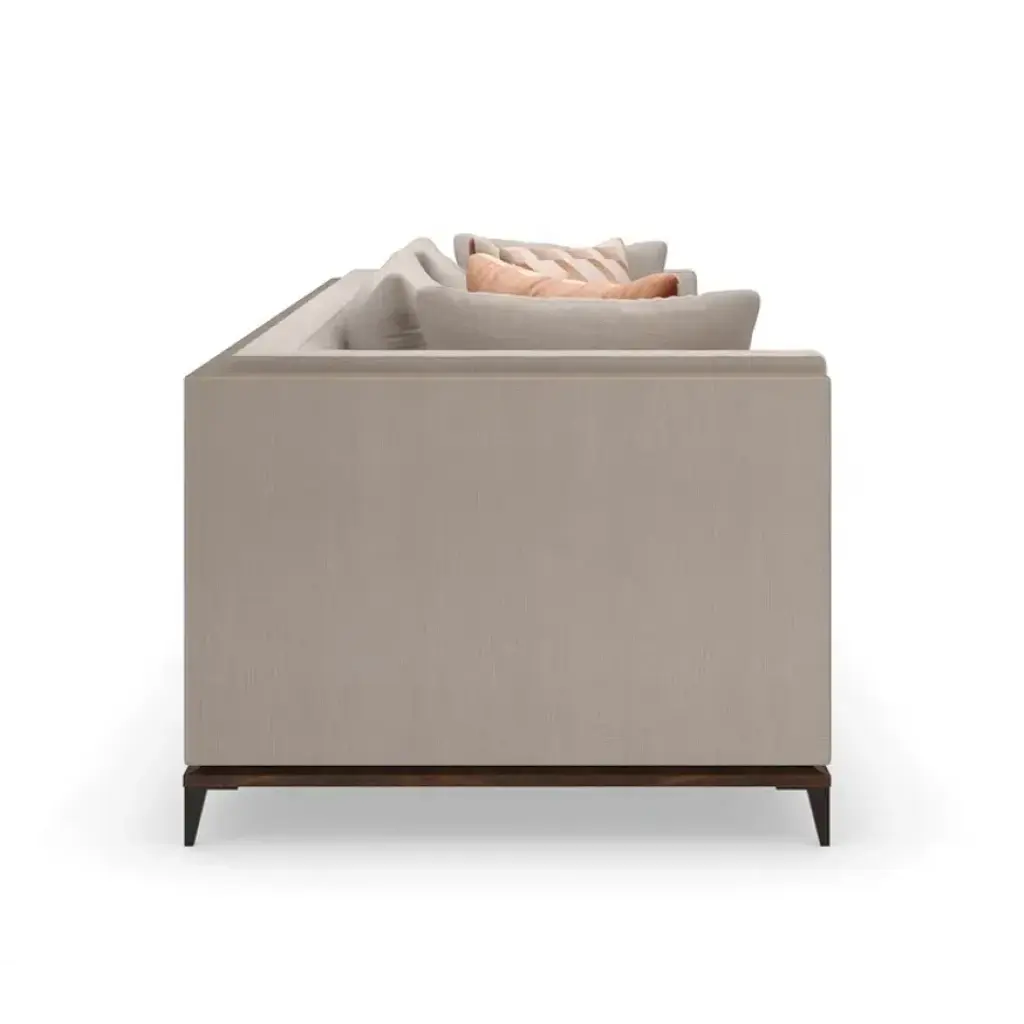 With numerous configurations and options for in-the-moment customization, the Archipelago collection introduces a relaxed sit with a refined aesthetic. Upholstered in a neutral twill fabric with a faux leather accent, and elevated on an exposed Bourbon Glaze wood base with metal legs in a Deep Bronze finish. Style luxe down pillows with a color-blocked expression of saffron velvet, or reverse to display an embroidered, geometric pattern. Collection also includes an armless chair, and matching armchair.