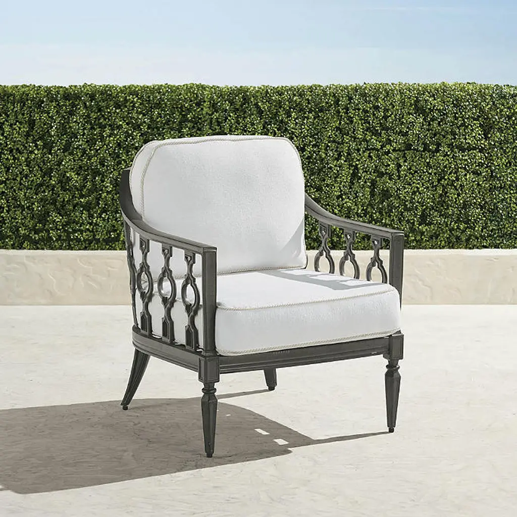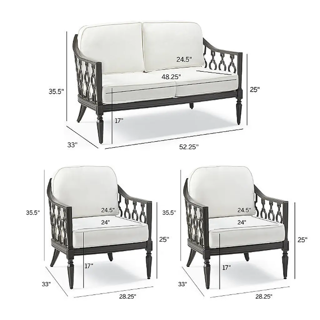 The quatrefoil motif recurring throughout our Avery Loveseat Set puts a contemporary twist on the age-old iron gates of Europe. Expertly crafted of cast aluminum with hand-filed welds, powdercoated finish and weather-defying solution-dyed acrylic cushions, this set is built to stand the test of time and mix well with pieces from our other collections. Set includes loveseat and two lounge chairs. Part of the Avery Collection Includes loveseat and two lounge chairs with cushions. Note: Set only available as listed. Premium-quality cast aluminum frames, with hand-filed welds and durable powdercoated finish All-weather cushions are constructed of a high-resiliency foam core with soft polyester wrap and covered with weather-defying solution-dyed fabric to resist mold, mildew and fading Included cushions are 5 inches thick Piping color on cushion matches the stripe color Includes loveseat and two lounge chairs Imported Please note: Digital renderings of custom upholstery may differ in pattern placement from the actual item. Because colors can vary from screen to screen, we recommend ordering a swatch before completing your order. We offer free swatches of all our outdoor fabrics. 10-swatch maximum. Solid and stripe swatches measure 4"x4" and pattern swatches measure 8"x8". View and order swatches here. A Frontgate Exclusive At Frontgate, our primary focus is quality. We guarantee that every product we sell will stand up to the supreme test – our customers' satisfaction. To learn more about our policies, visit our Shipping & Processing, Returns & Exchanges and Warranty & Price Guarantee pages.