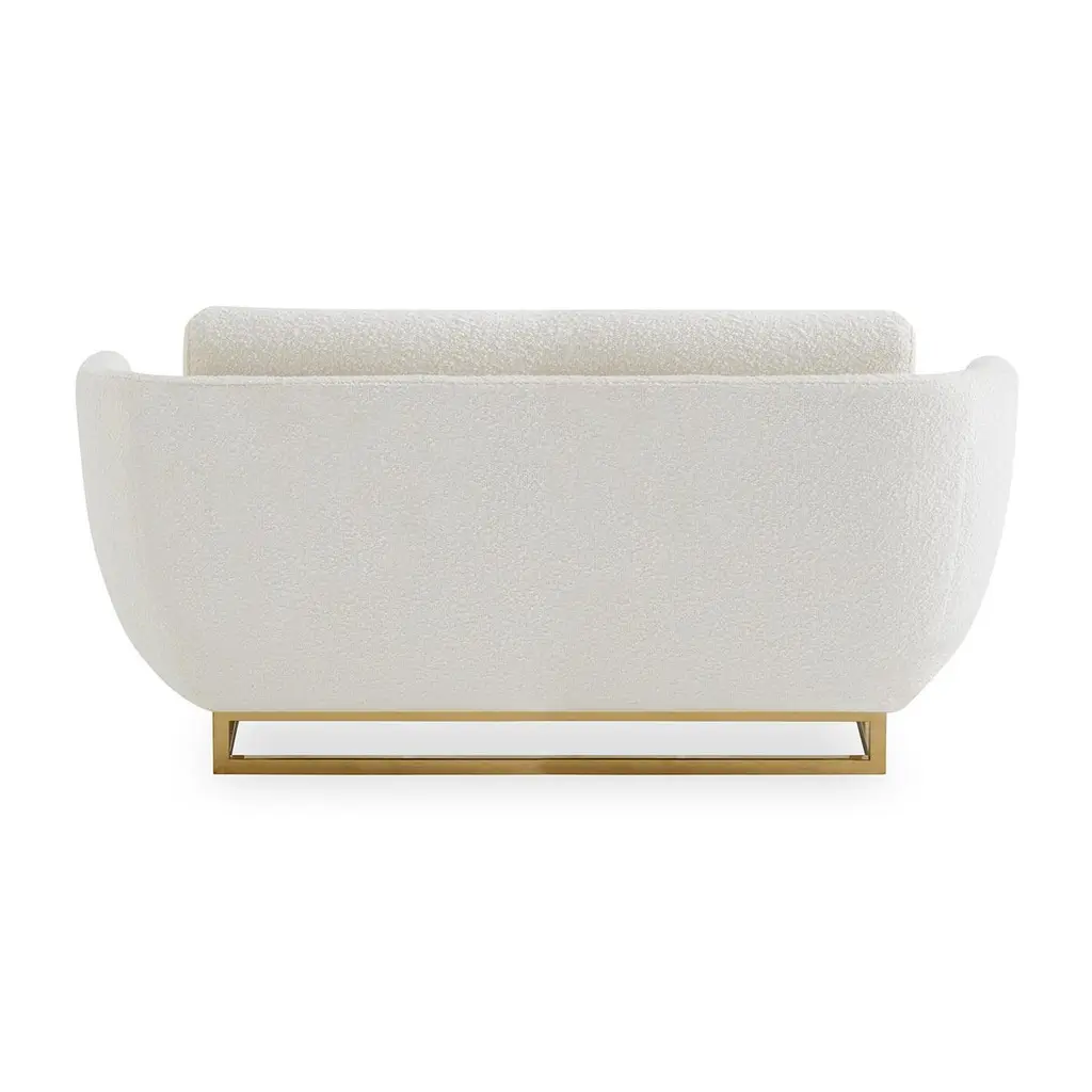 New traditionalism. Minimalist rigor meets cocoon-y comfort. Our Beaumont collection's architectural yet airy bases are juxtaposed with silhouettes softened by sculptural flair. Balance and geometry get a glamorous lift from shiny polished brass and luxe Olympus Ivory bouclé. Perfectly parlor-friendly, or brilliant in a bedroom. Pairs perfectly with our Beaumont lounge chair.Specs:Measures: Seat depth 22 in.Arm height 23 in.Upholstered in Olympus Ivory Bouclé upholstery (54% polyester, 41% acrylic, 5% wool)Loose bench seat cushion; loose back cushionPolished brass base.