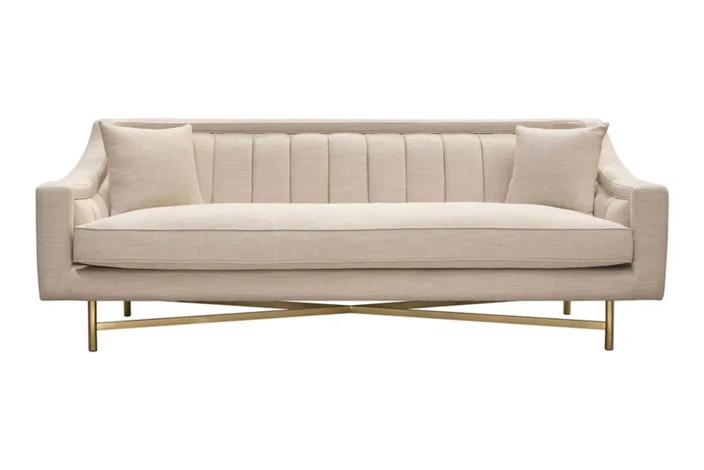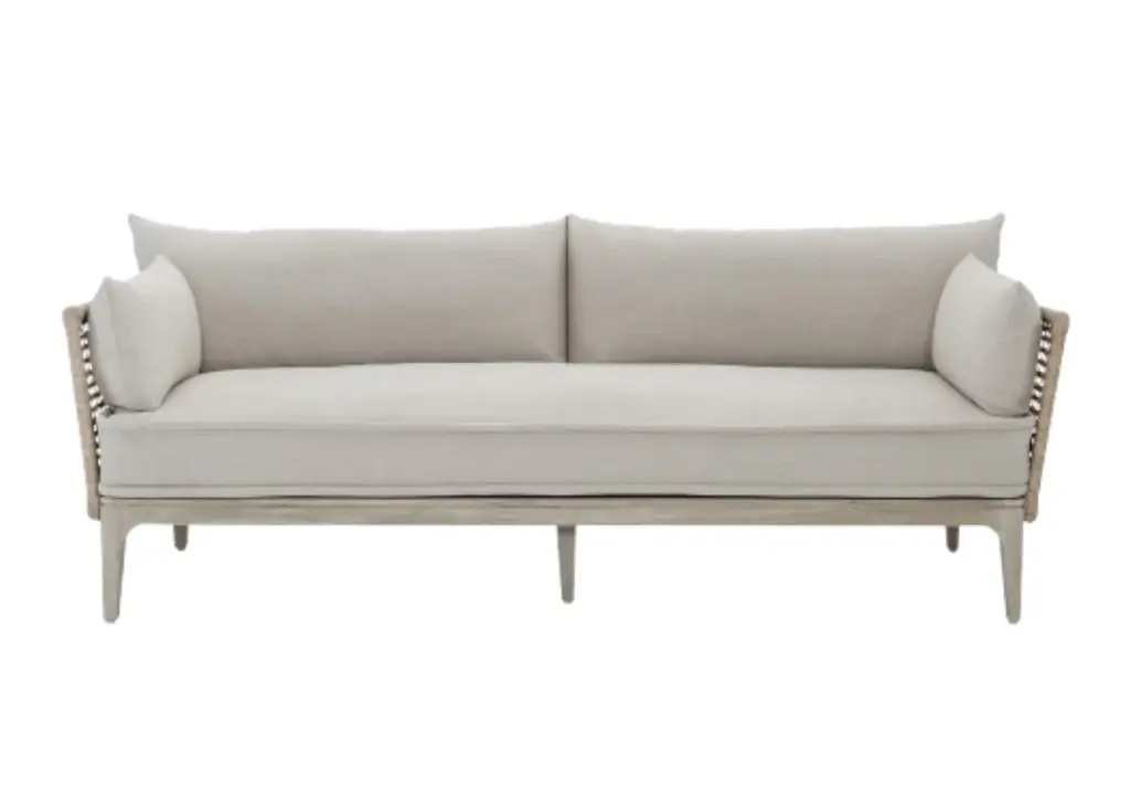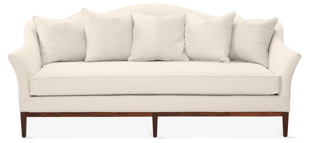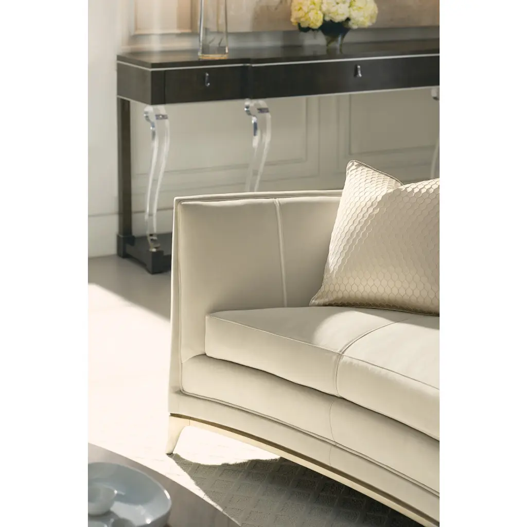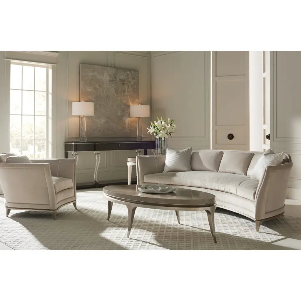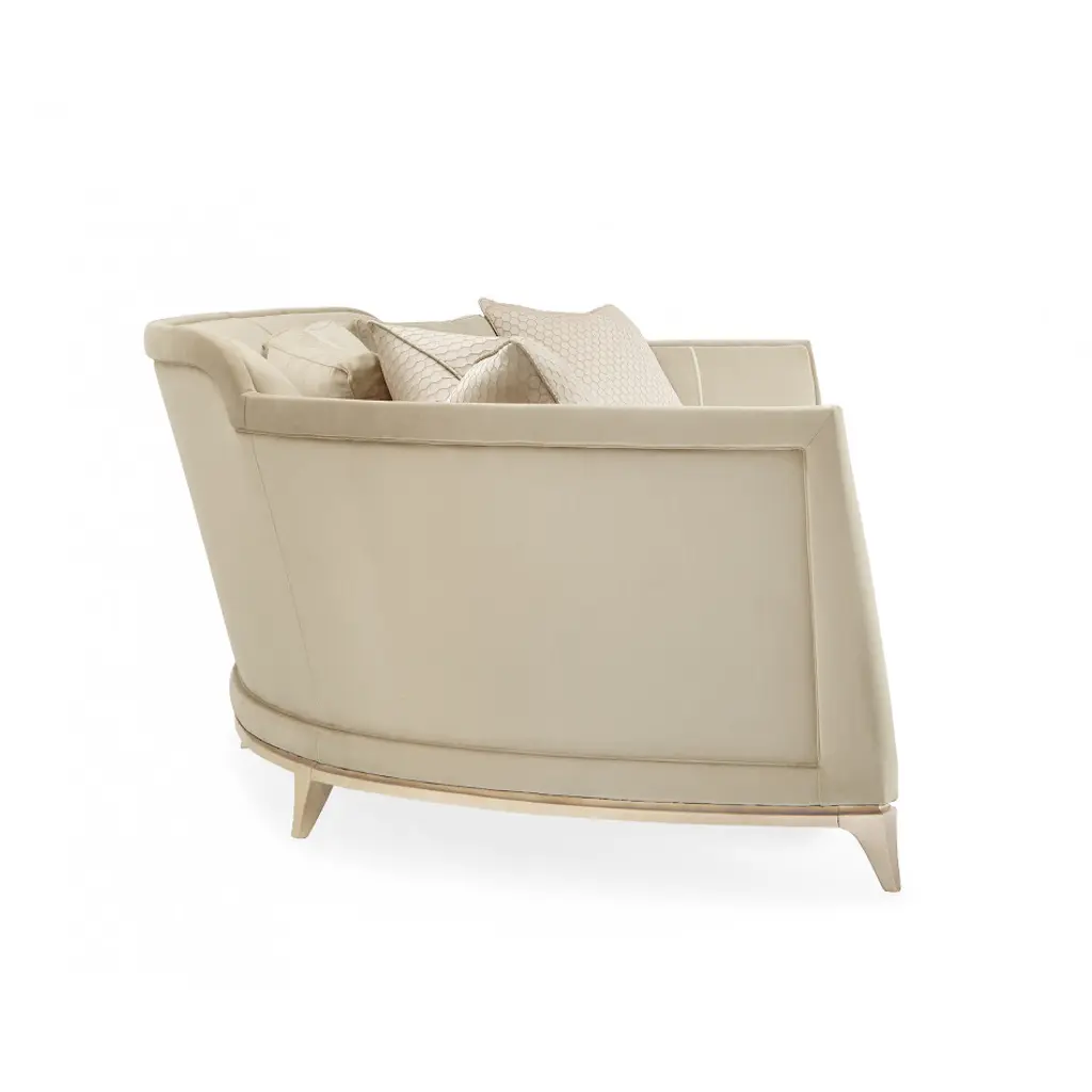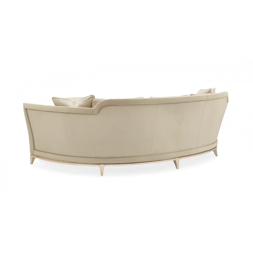 Equally at home in the city or country, this elegant crescent-shaped sofa bends all the rules to create the ultimate in sophisticated seating. Its shapely back and half-moon cushion are accented by a wood base in Soft Silver Paint. Upholstered in a plush, sumptuous buff shade of velvet with a peek-through seam detail on the inside back and arms and throw pillows in an embroidered satin, this sofa's sweeping lines and tailored details create a look that is cosmopolitan chic.