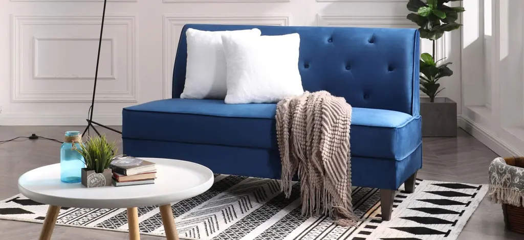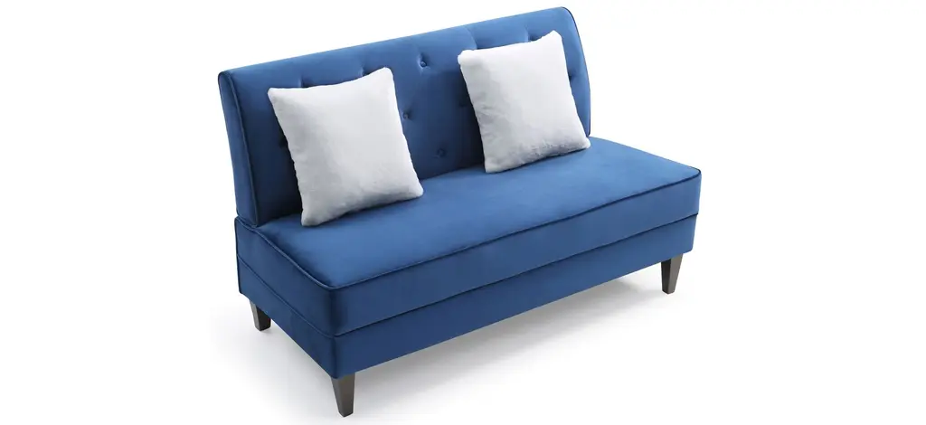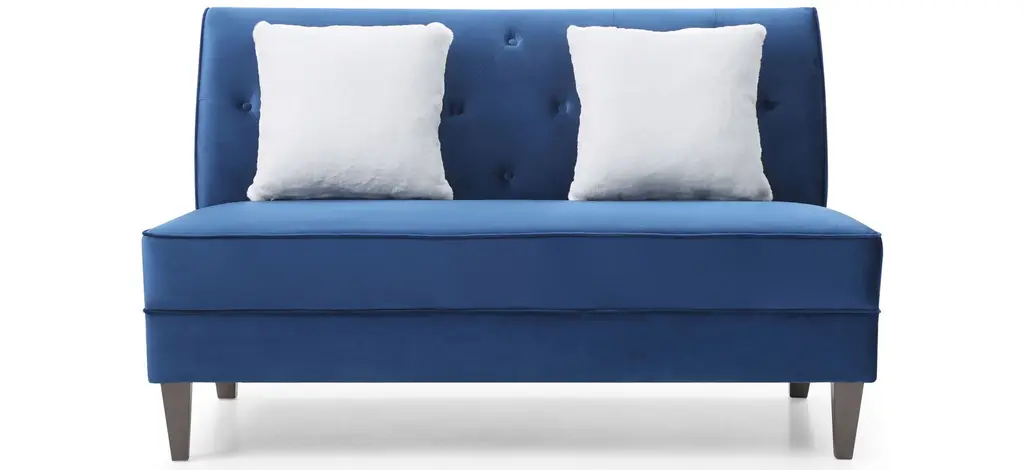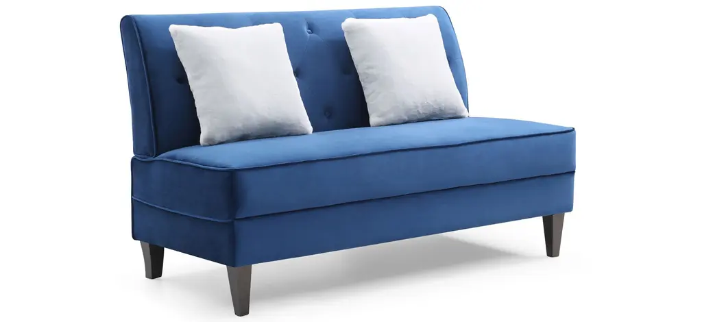 The armless Benedict settee provides seating for 2. Great for smaller rooms or that perfect accent seating needs. Includes 2 contrasting velvet throw pillowsThe armless Benedict settee provides seating for 2. Great for smaller rooms or that perfect accent seating needs. Includes 2 contrasting velvet throw pillows