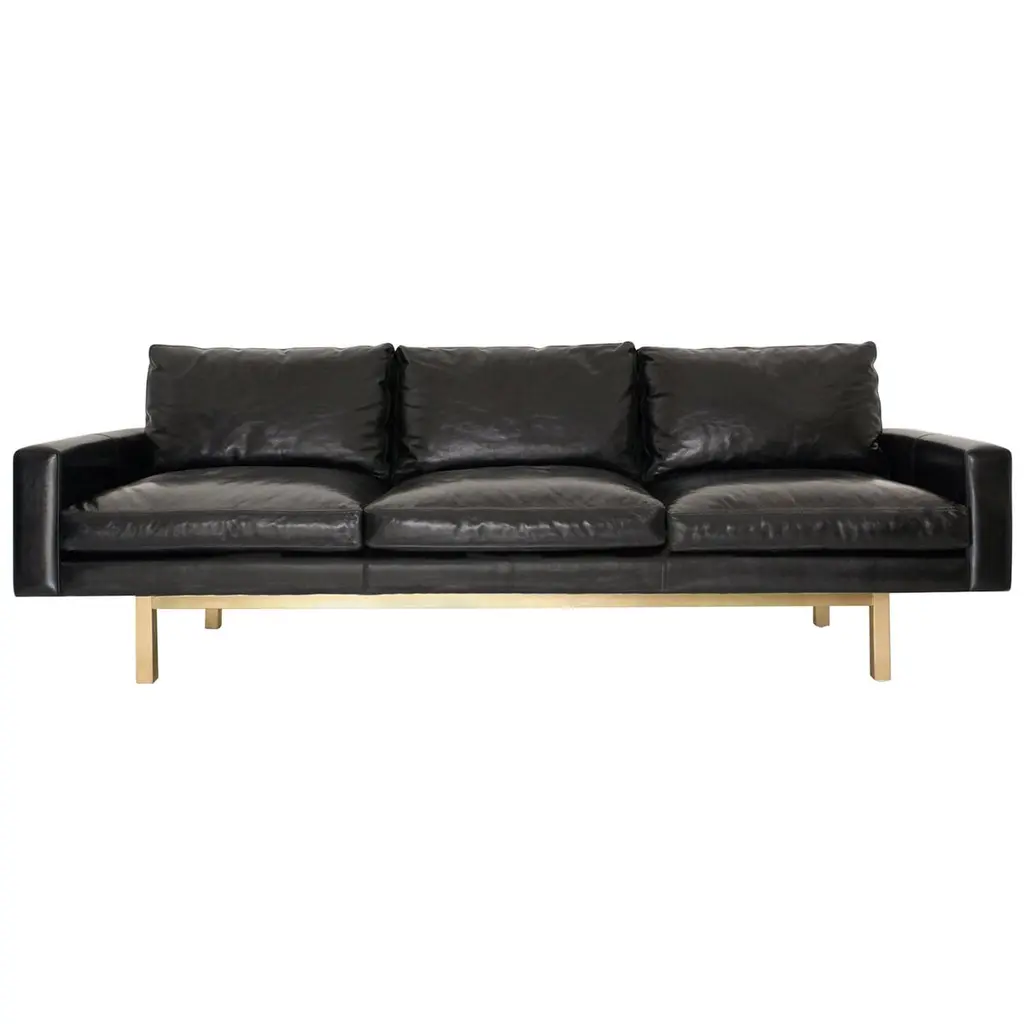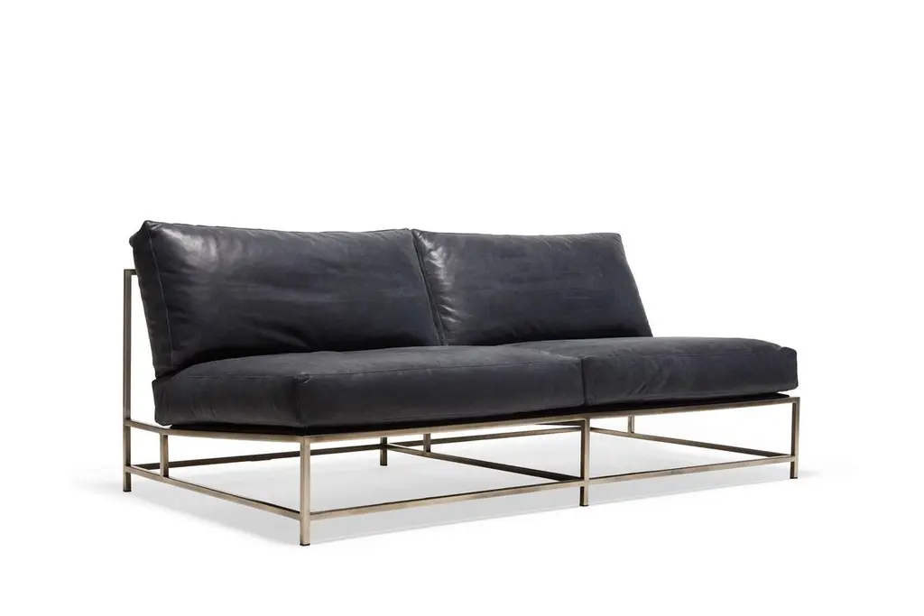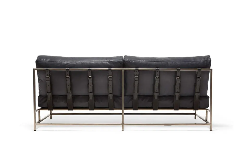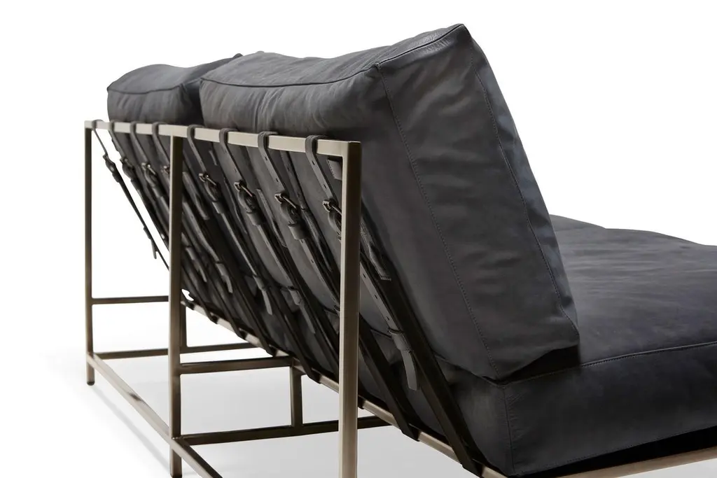 The Inheritance Loveseat by Stephen Kenn is as comfortable as it is unique. The design features an exposed construction composed of three elements - a steel frame, plush upholstery, and supportive belts. The deep seating area is perfect for a relaxing lounge experience. Every Stephen Kenn piece is made to order through our Los Angeles studio in partnership with a number of small businesses and fabricators in the LA area. With this highly customizable loveseat you can select from a wide range of finishes and materials to complement your home and lifestyle - please message us to see our Customization Guide with all available options.This version of our Inheritance Loveseat is upholstered in blue smoke leather from the Providence Collection by Moore & Giles. The foam seat cushions have been wrapped in down for added softness and comfort. Sitting atop an antique nickel frame, the loveseat is strapped with support belts featuring charcoal cotton webbing, black leather, and antique nickel buckles.