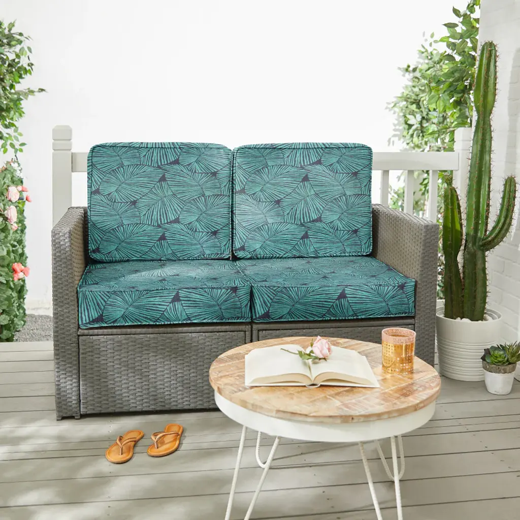 Round out a patio or poolside seating ensemble with this eye-catching outdoor loveseat cushion set. Offer supreme seating comfort on a pair of seat cushions and a pair of back cushions, each is filled with pure recycled foam. Cutting-edge sun and water damage protection is a bonus from this outdoor fabric that is soft yet durable. Attach cushions with self-ties to avoid slippage, and easily remove covers for spot-cleaning through zippered enclosures. This trpical palm leaf print loveseat and cushion set is primarily designed for outdoor use, but it offers a signature statement for indoor decor as well.