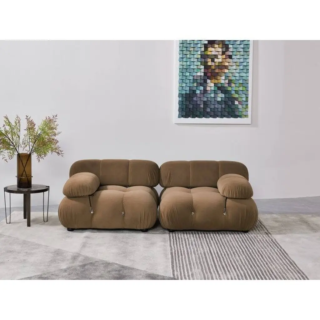 This loveseat is crafted using an innovative system comprised of cables, hooks, and rings, which imbue it with its distinct look and modular design. Its seats, backs, and armrests are built around a foundation of injection foam and wood frames. The padding consists of polyurethane in multiple densities and firmness levels, with intricately shaped layers working together to produce a comfortable, spring-like effect. This engineering marvel not only ensures exceptional comfort but also enables the sofa's interior to be disassembled, facilitating easy recycling. Furthermore, this sofa features a versatile reversible ottoman, offering flexibility in placement—whether positioned at the center of the seating arrangement or alongside, catering to diverse preferences and spatial configurations with ease. Features Removable Armrests and Backrests Easy to assemble, only the armrest and backrest need to assemble by a hook lock Luxury Velvet Fabric filled with premium high-density sponge and soft cotton only, bottom with a wood frame Each piece can be easily rearranged and reconfigured