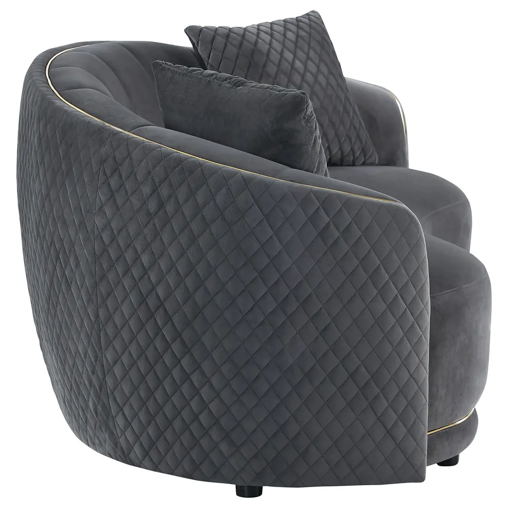 Bold contrast is achieved with the sophisticated gold trim featured on a modern loveseat. Designed to make a statement, the loveseat is a chic curved kidney silhouette with tight upholstery over its seat and a channel tufted back. The outer back and arm surface adds diamond quilting to create inviting texture, while a pair of accent pillows provide custom comfort. The loveseat shows off sloping arms for a streamlined profile that's smooth and sleek in your space. Choose this loveseat for a bit of fresh perspective in your living room or den. Features: Includes: One (1) loveseat Diamond tufting adds depth the outer surface of a modern upholstered loveseat in dark gray Gold trim highlights a gently rounded, mid-century inspired silhouette and creates sophistication Fully encased solid and engineered wood frame provides lasting durability and reliability Seat and back cushions feature foam fill, with silk wading on seat cushions Seats feature pocket coils and sinuous springs, creating durability and comfort in your home Dimensions: Loveseat: 73.00 inches wide x 41.00 inches deep x 32.00 inches high Seat Dimensions: 18.00 inches high x 24.00 inches deep This product will ship to you in one (1) box. Accessories pictured are NOT included.