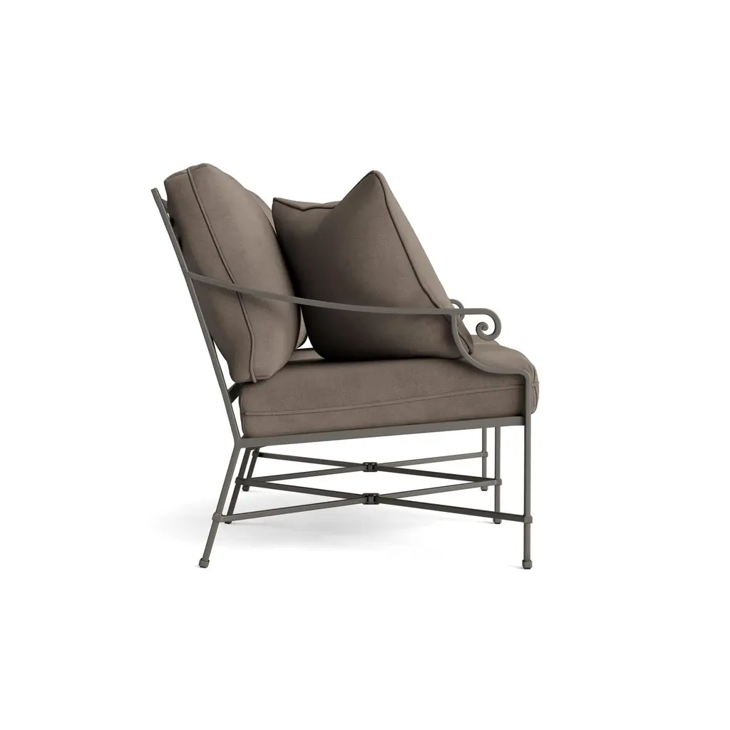 Venetian by Richard Frinier features a refined silhouette highlighted by timeless Neoclassic details. The x-back and cross-stretcher are framed by elegantly scaled rectangular lines, including a subtly flared and contoured back. Gracious spiral volute details at the end of the arms, architectural banding details on the legs, and the cross-stretcher are proportionately placed to enhance the overall balance. Care & Maintenance: Wash your furniture with a solution of mild detergent and water, rinse with clear water, and dry thoroughly. Assembly Required? No Extruded and cast aluminum frames. Extruded aluminum frames are affordable, easy to clean, and resistant to corrosion. Cast aluminum offers enhanced durability with added resistance to wind/weather and corrosion Powder-coated frames.Powder coating adds to the aluminum’s durability, providing a protective barrier against weather conditions and corrosion All cushions utilize the highest grade of performance outdoor fabrics. Not only are they soft to the touch, they’re also incredibly stain and weather resistance and offer long lasting color Cushions use a high-grade foam comparable to indoor upholstered seating. The foam is layered with 100% virgin fiber fill fitted for down-like comfort. Each cushion is then tailored with a polyester water-resistant barrier to prevent water from reaching the foam or fiber fill. To ensure industry leading design and quality our products undergo rigorous structural and environment testing. Frames undergo weighted testing and each finish is subject to UV testing to guarantee lasting quality.