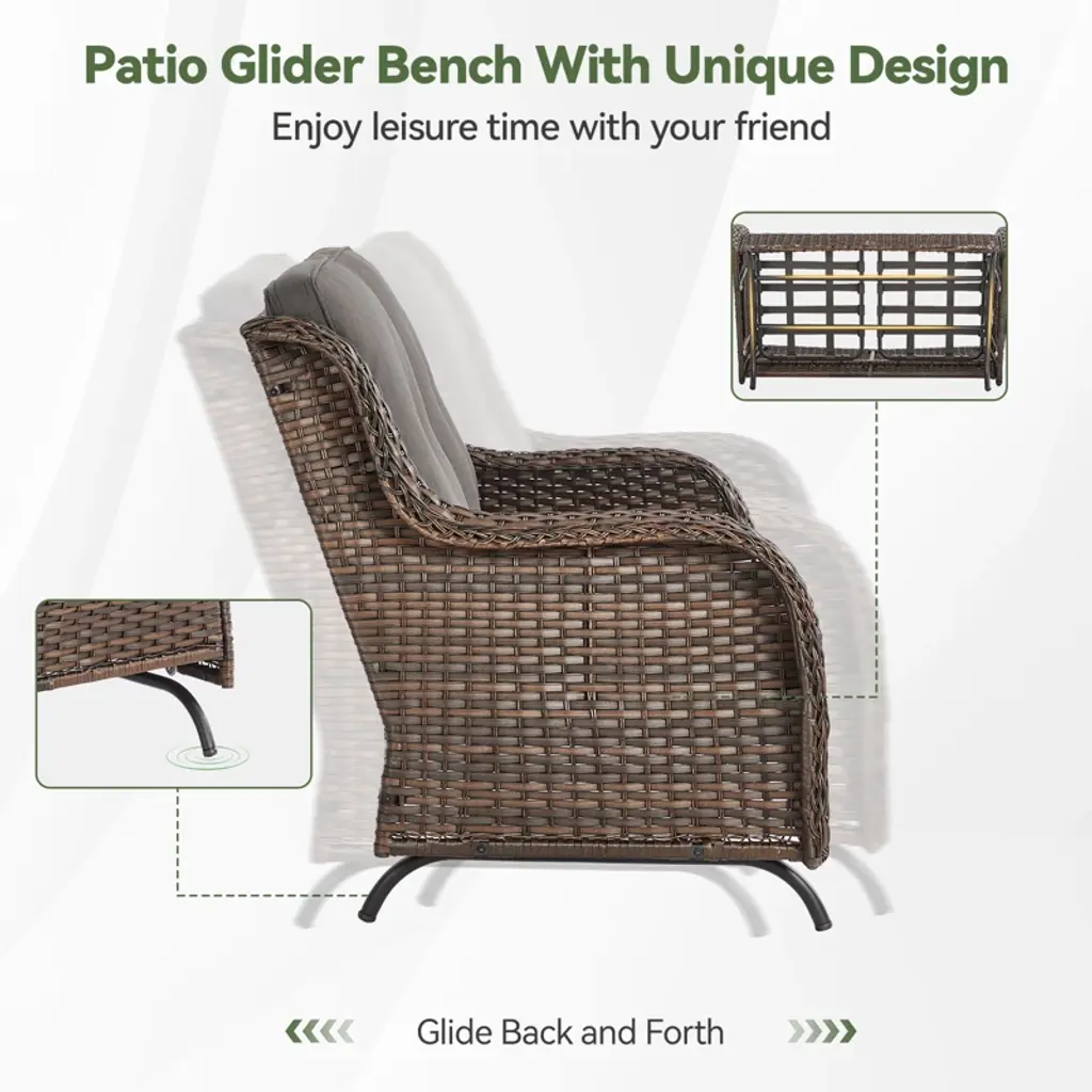 Buenhomino Patio Loveseat Rattan Glider Sofa With Curved Armrest Thicking Back & Seat Cushions For Garden Balcony Backyard