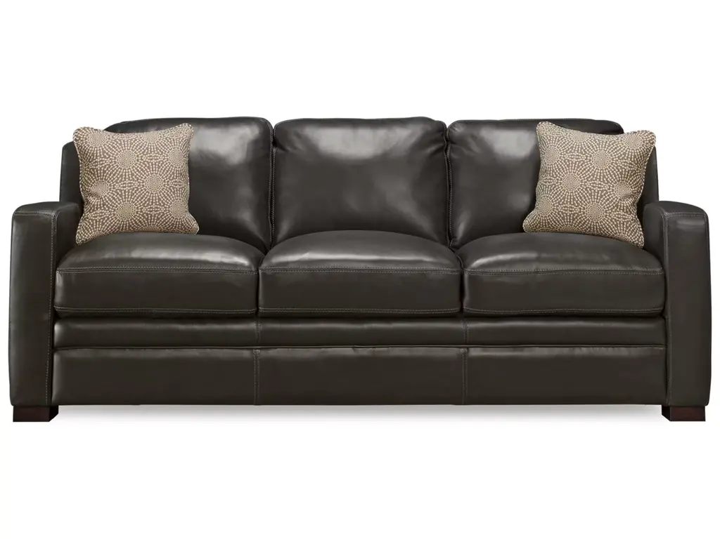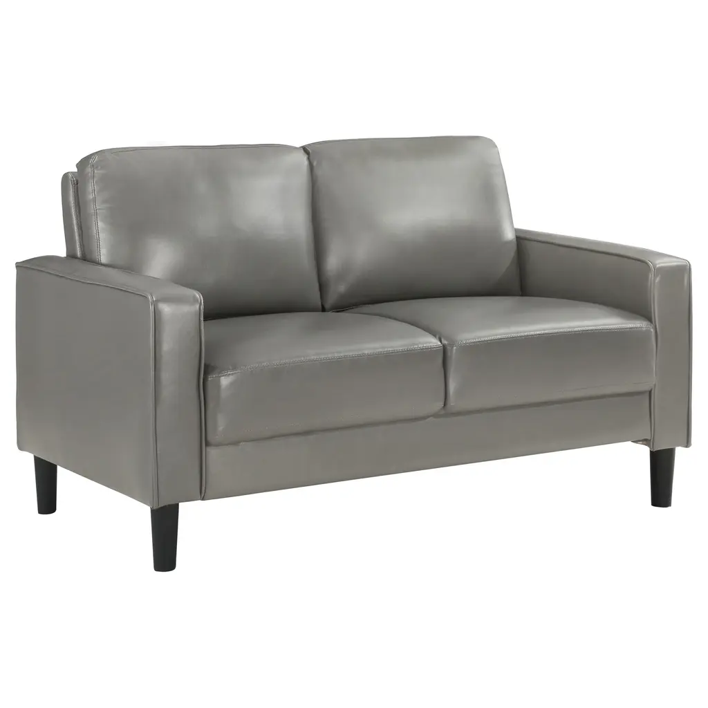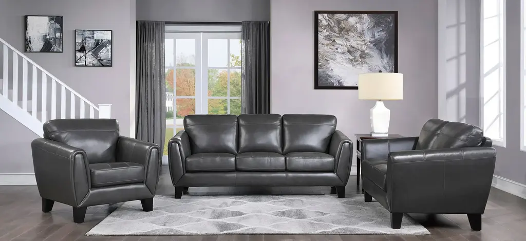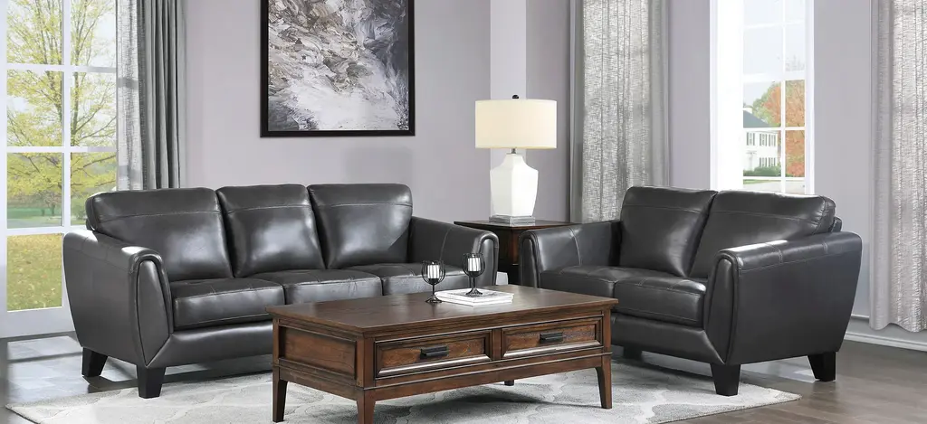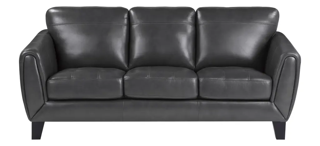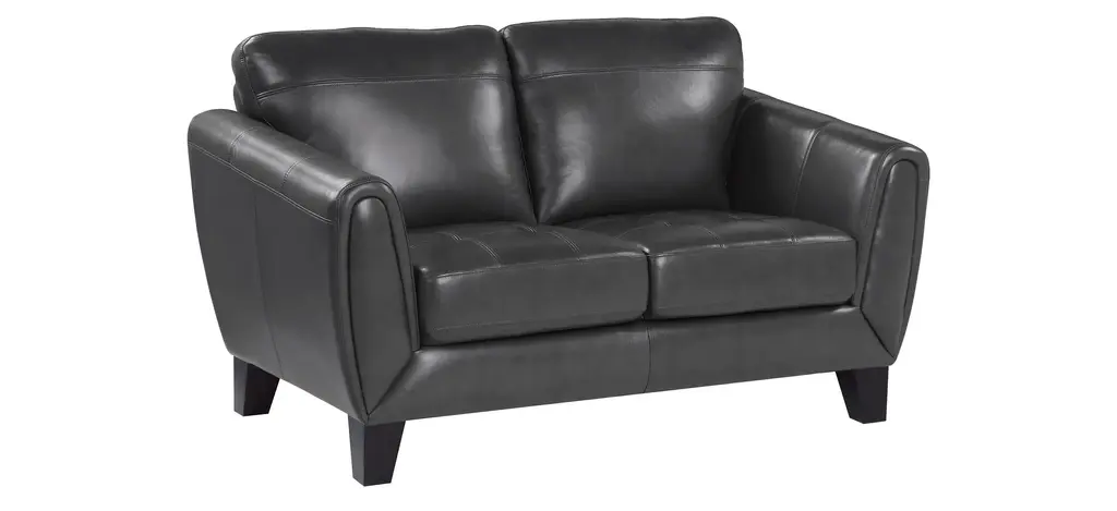 The subtle retro look of the Cadence Collection will pair with modern aesthetic of your home's decor, creating a classically cool look that is sure to turn heads. The streamlined profile of the love seat is covered in an dark gray hued top grain leather. Defining detail comes in the form of the arm's contour stitching and the cushioned wrap of the love seat's arms.