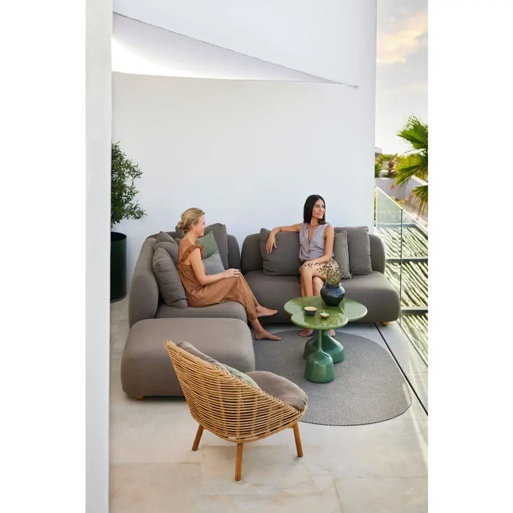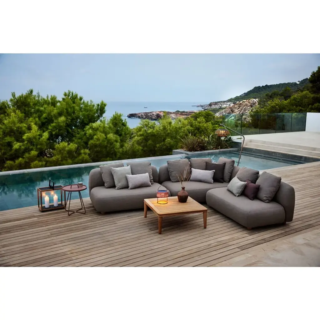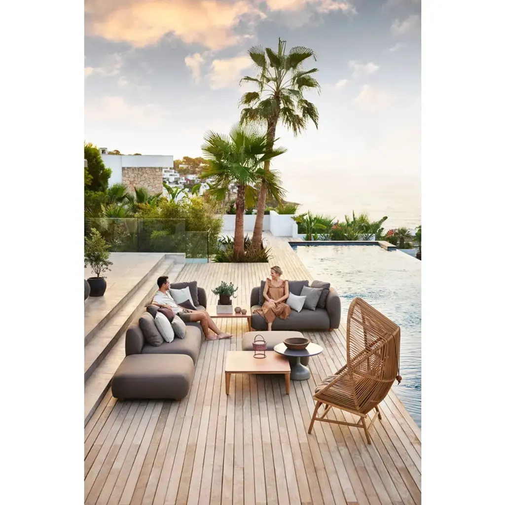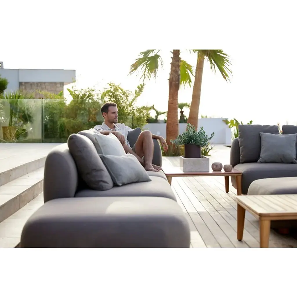 Cane-line’s Capture sofa provides weatherproof comfort and unparalleled versatility for both smaller and larger outdoor areas. The two-seater sofa is fully upholstered with Cane-line’s own AirTouch fabric, whose QuickDry & Airflow system ensures that the fabric dries in just one hour after a downpour. The frame of the sofa is made of aluminum and the legs from teak. Featuring an armrest on the right-hand side, this Capture sofa comes with three removable, machine-washable cushions. Thanks to the modular design of the Capture collection, you can combine different modules to suit your own needs, whether you are looking for a corner sofa, a chaise sofa, or a larger sofa group for multiple people. Each module can, of course, be used independently as well. The simple esthetics and rounded, voluminous shapes of the Capture sofas provide the ultimate lounging experience for sunny patios, balconies and poolside use.