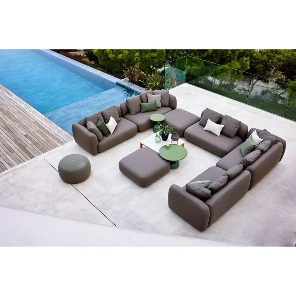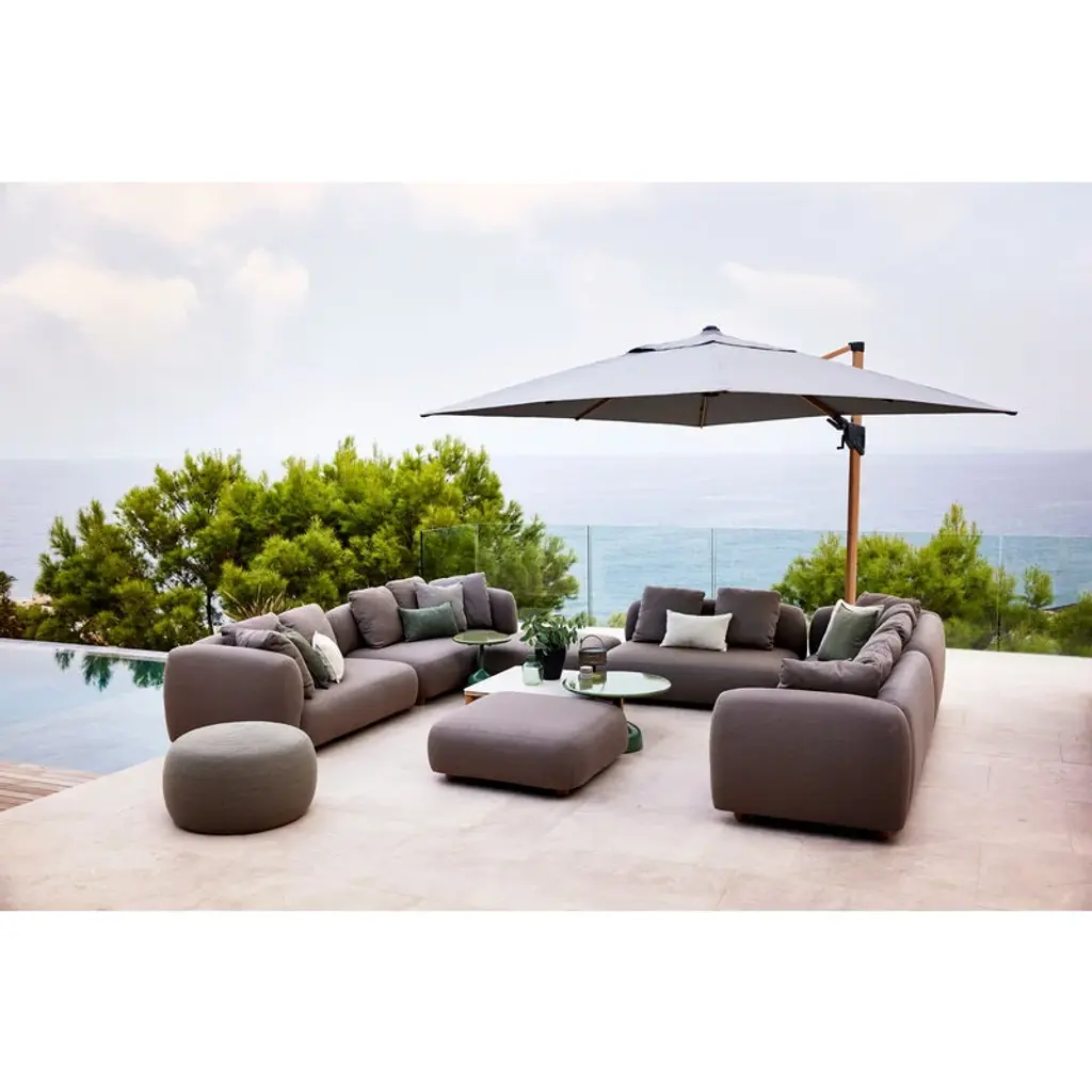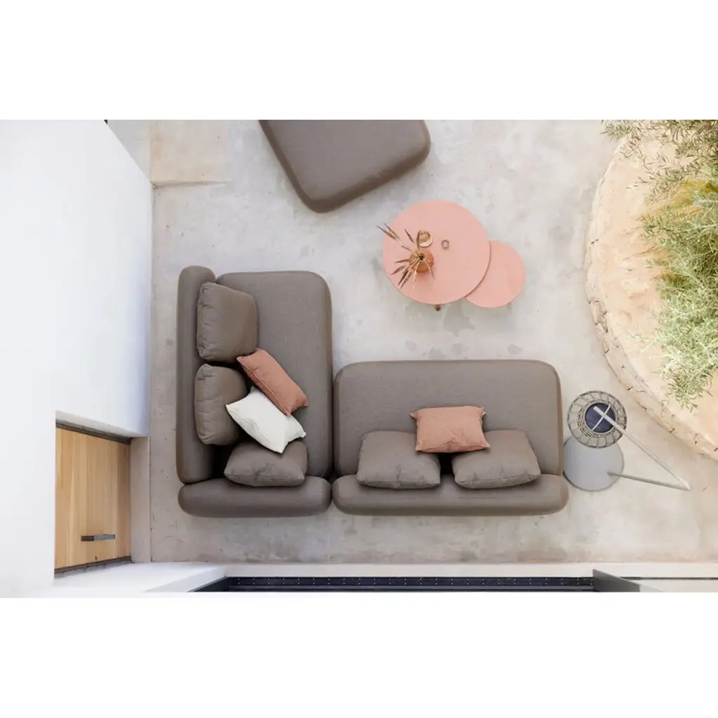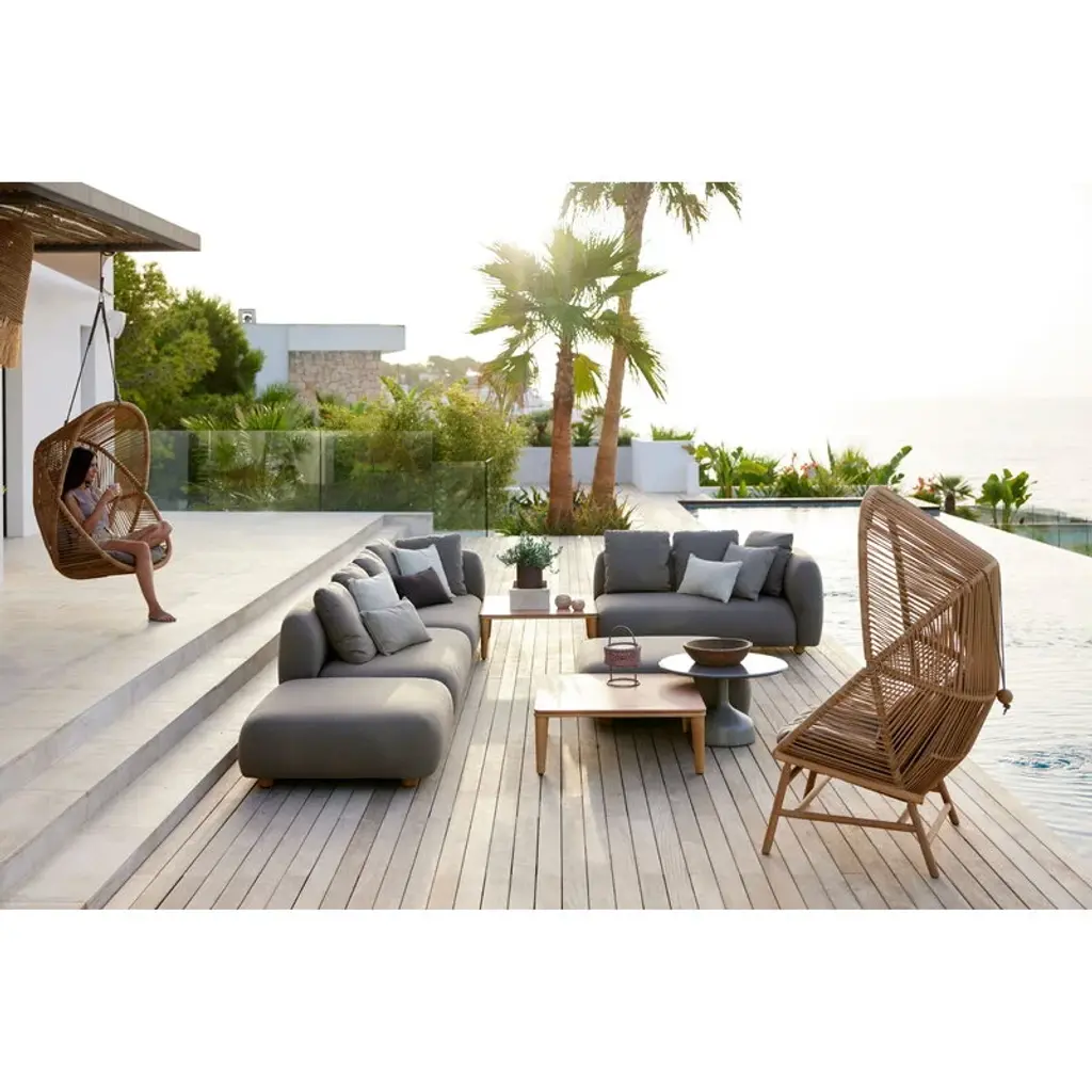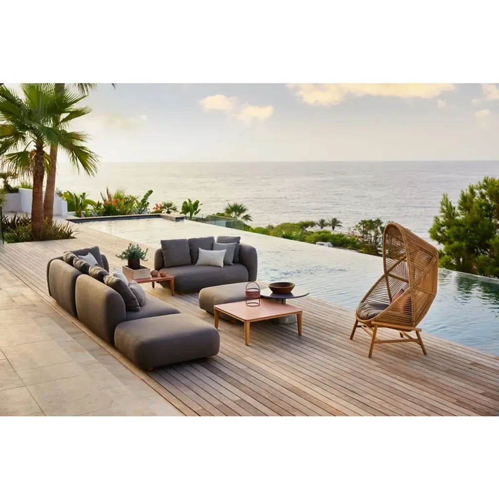 Cane-line’s Capture sofa provides weatherproof comfort and unparalleled versatility for both smaller and larger outdoor areas. The two-seater sofa is fully upholstered with Cane-line’s own AirTouch fabric, whose QuickDry & Airflow system ensures that the fabric dries in just one hour after a downpour. The frame of the sofa is made of aluminum and the legs from teak. Featuring an armrest on the right-hand side, this Capture sofa comes with three removable, machine-washable cushions. Thanks to the modular design of the Capture collection, you can combine different modules to suit your own needs, whether you are looking for a corner sofa, a chaise sofa, or a larger sofa group for multiple people. Each module can, of course, be used independently as well. The simple esthetics and rounded, voluminous shapes of the Capture sofas provide the ultimate lounging experience for sunny patios, balconies and poolside use.