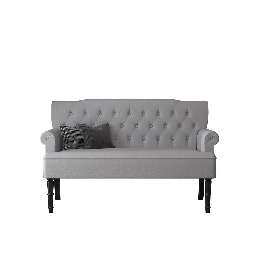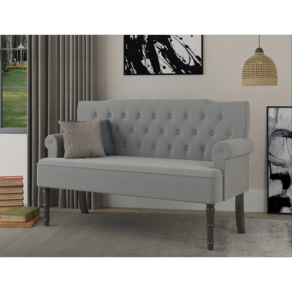 Make your room a luxurious look with this charming French design settee. This settee has an upholstered design with a button-tufted back to provide a backrest for you to watch TV or read in the settee comfortably. It consists of the single cushion seat style, individually placed rolled arms as well as button-tufted back to draw the eye. It is an ideal option for smaller spaces, living rooms, or any room.
