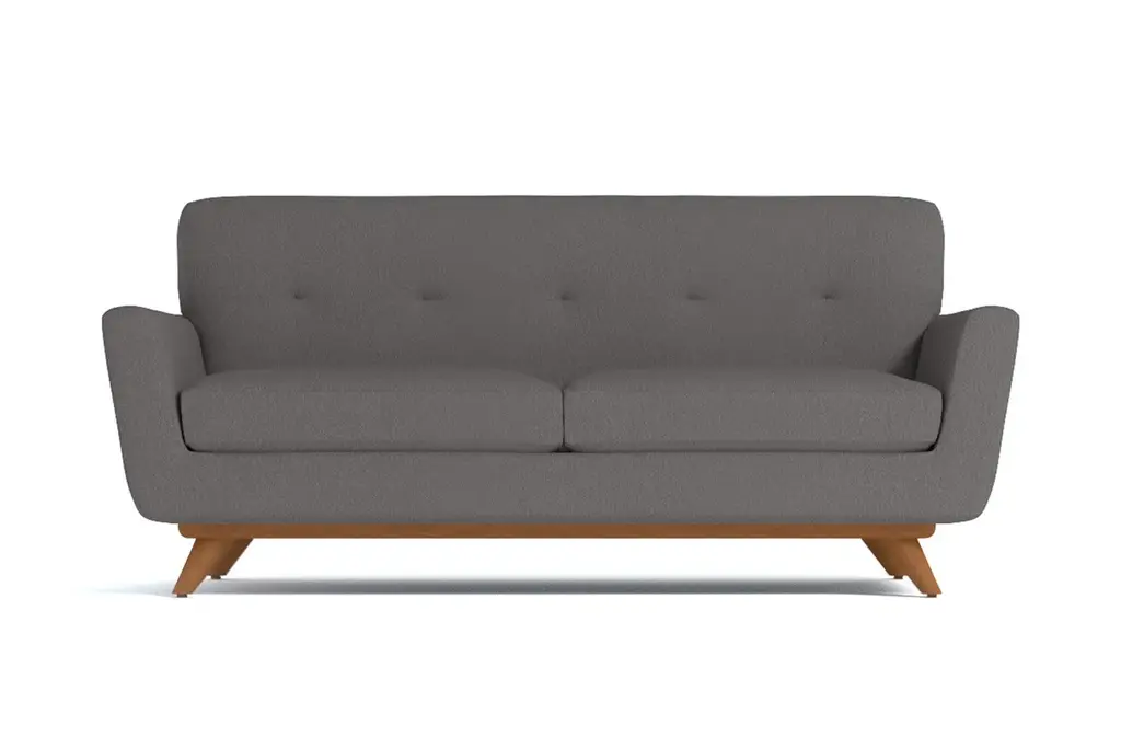 If you choose one midcentury item for your apartment, make sure it's the Carson Loveseat. It's both retro and futuristic (look it up - it's a thing), with a flared silhouette, tufted back cushioning and a solid pecan wood base. Look at how those legs angle outward adding to the modern aesthetic. And this sofa isn't just about looks. We're not shallow! Its deep cushions and solid back make for a comfortable respite far from the busy world. This sofa was built with apartment dwellers in mind - we know space is a hot commodity and the Carson is just what you need if square footage is at a minimum. You get to choose from our 27 exciting colors, one of which is sure to be the perfect compliment to your space. With flared arms, button tufted back cushioning and a sleek solid pecan wood base, this is one of the hottest looks around!