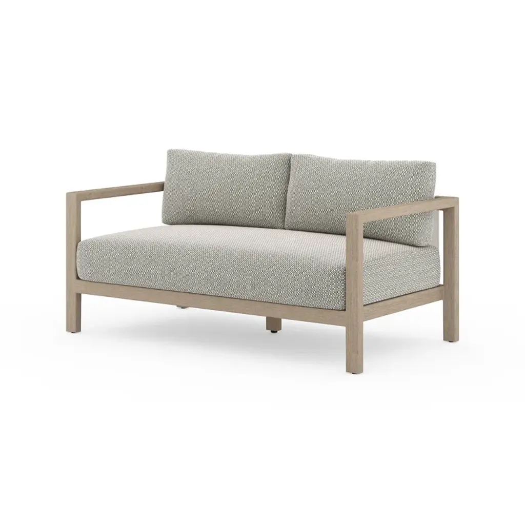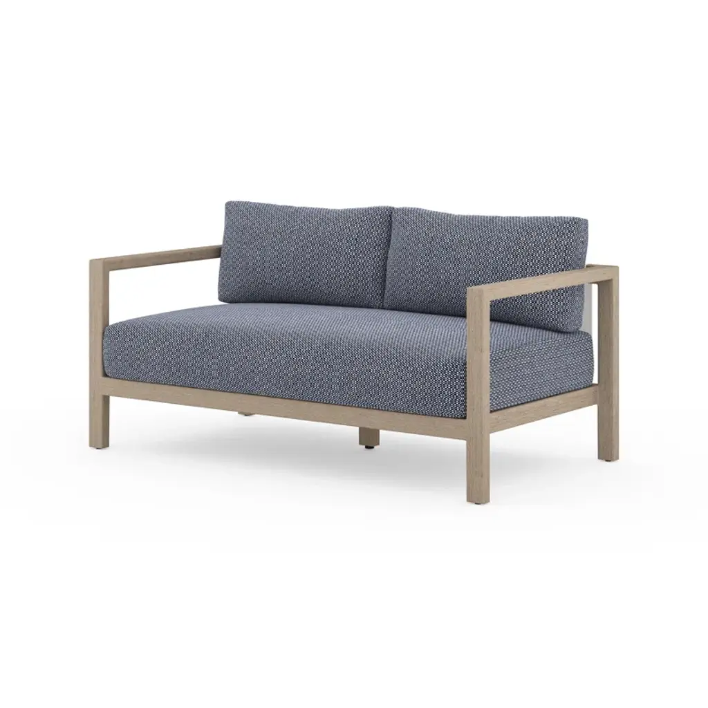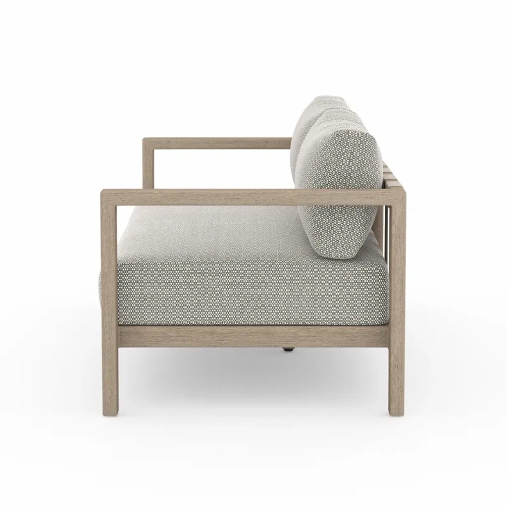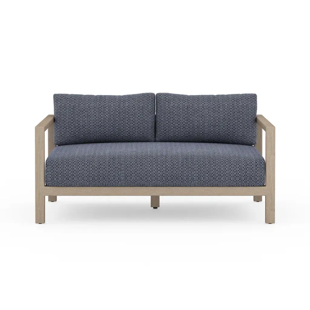 Modern materials ready a stylish silhouette for the outdoors. Teak forms a clean two-seat frame for UV-resistant and water-repellent Sunproof fabric. Back straps add intrigue. Cover or store indoors during inclement weather and when not in use.