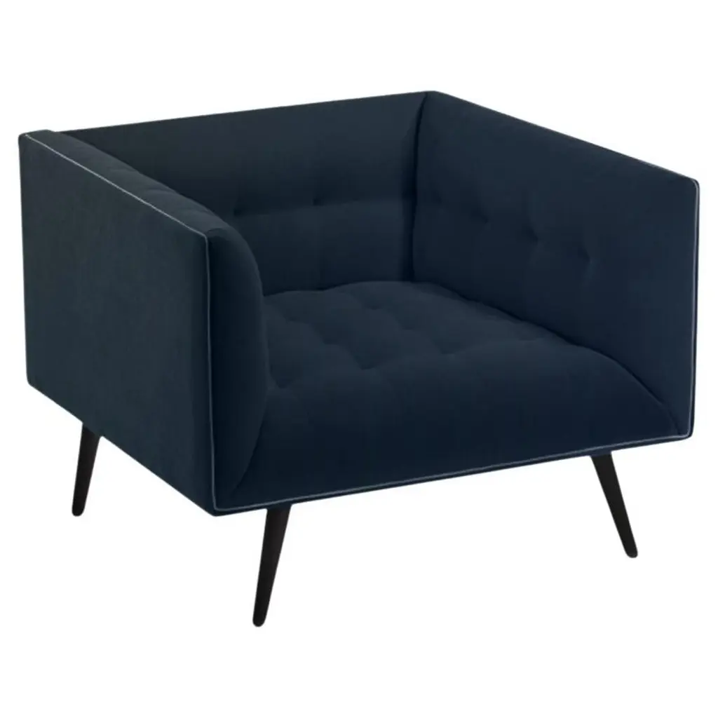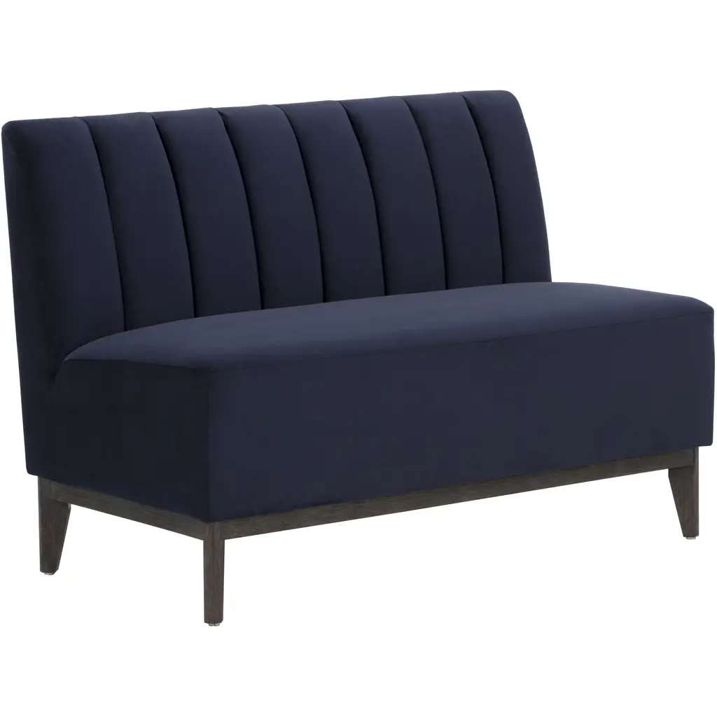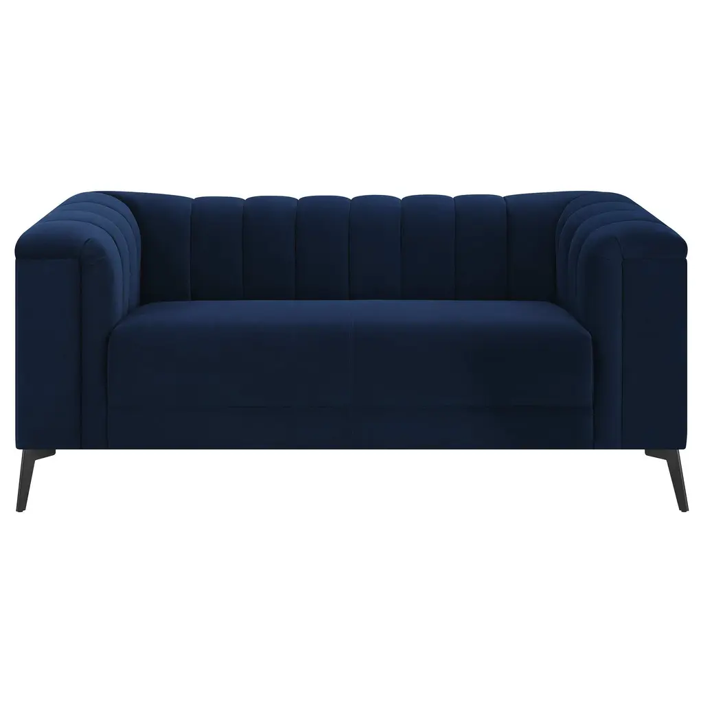This elegant transitional loveseat will bring a palpable radiance to your home. It's upholstered in a vibrant navy blue matte velvet fabric that's so soft and stunning that you'll have to experience it to believe it. Whether you recline or sit, the bench-style seat with pocket coil springs will offer all the comfort and support you want. It features an additional visual appeal with the shelter back and inside arms that are crafted with deep vertical channels. Tapered black metal legs bring the design together for a vibrant loveseat that will transform your living space. Item Contents: Item Bullets: Materials: Features: Dimensions: Accessories pictured are NOT included.