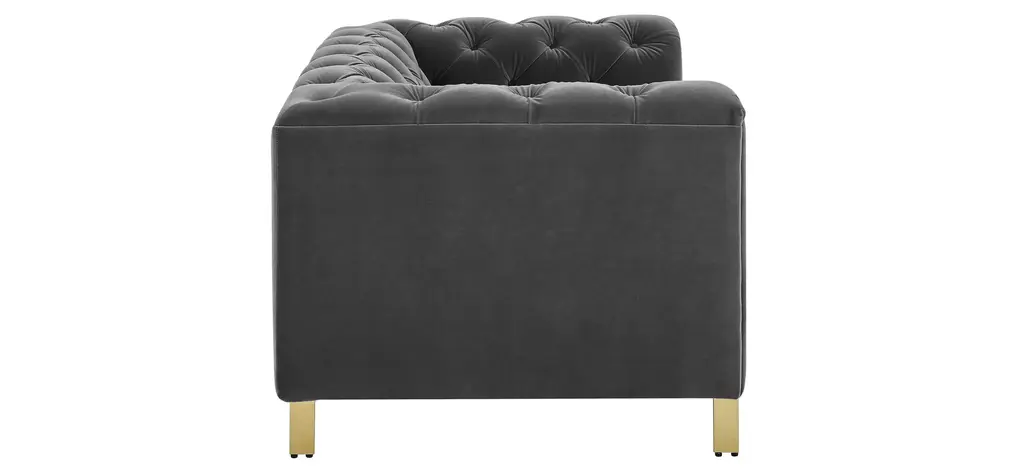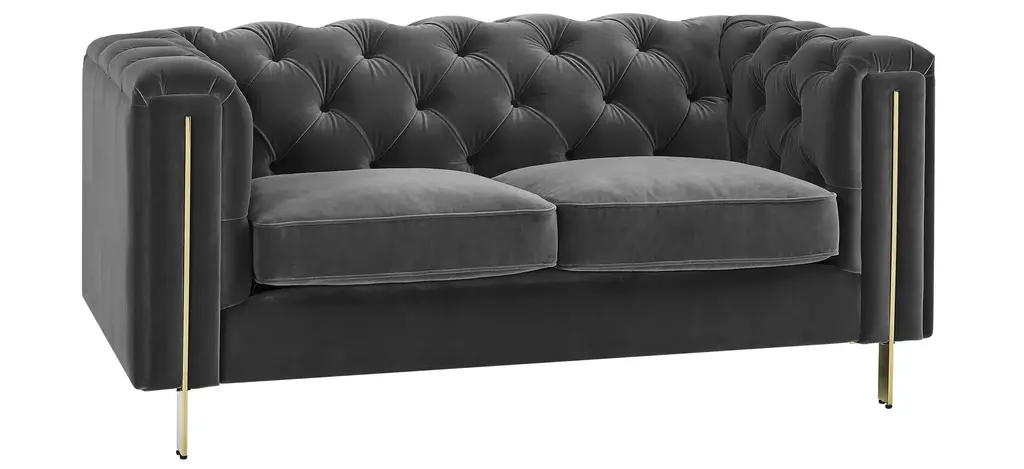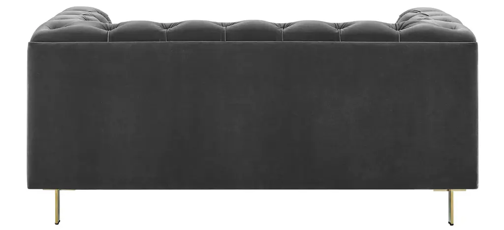 Charlene Loveseat blends classic and contemporary styles in a modern silhouette you won't be able to take your eyes off. Curl up with a book on a rainy Sunday afternoon or entertain friends with this indulgent piece that everyone will love. Ultra-soft velvet is draped over a classic Chesterfield frame and then button tufted in an Old English look. A modern brass frame adds a level of pop to the presentation that freshens up a classic upholstered silhouette. Style blending enough for modern or traditional settings, this eclectic delight is an elegant yet fun center to any living area.
