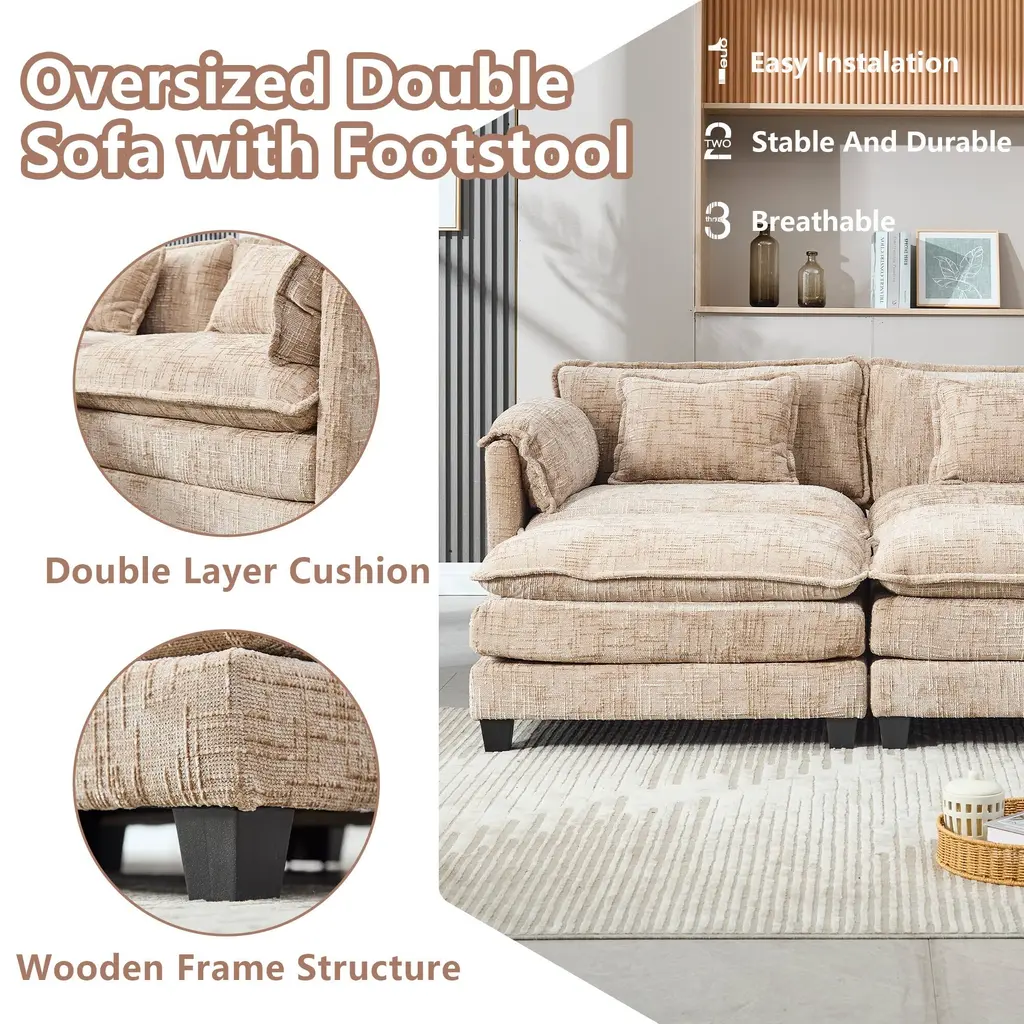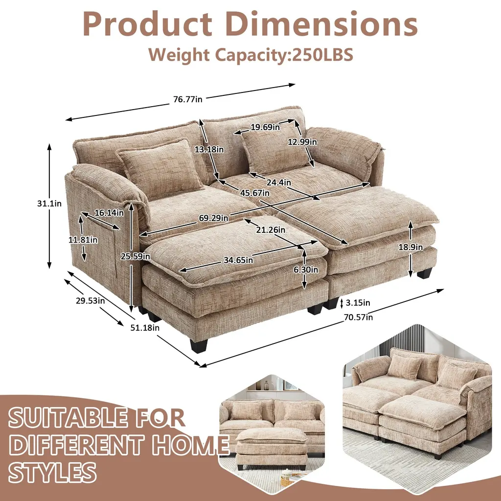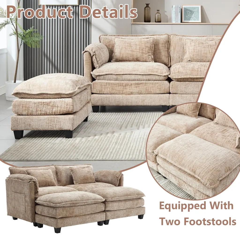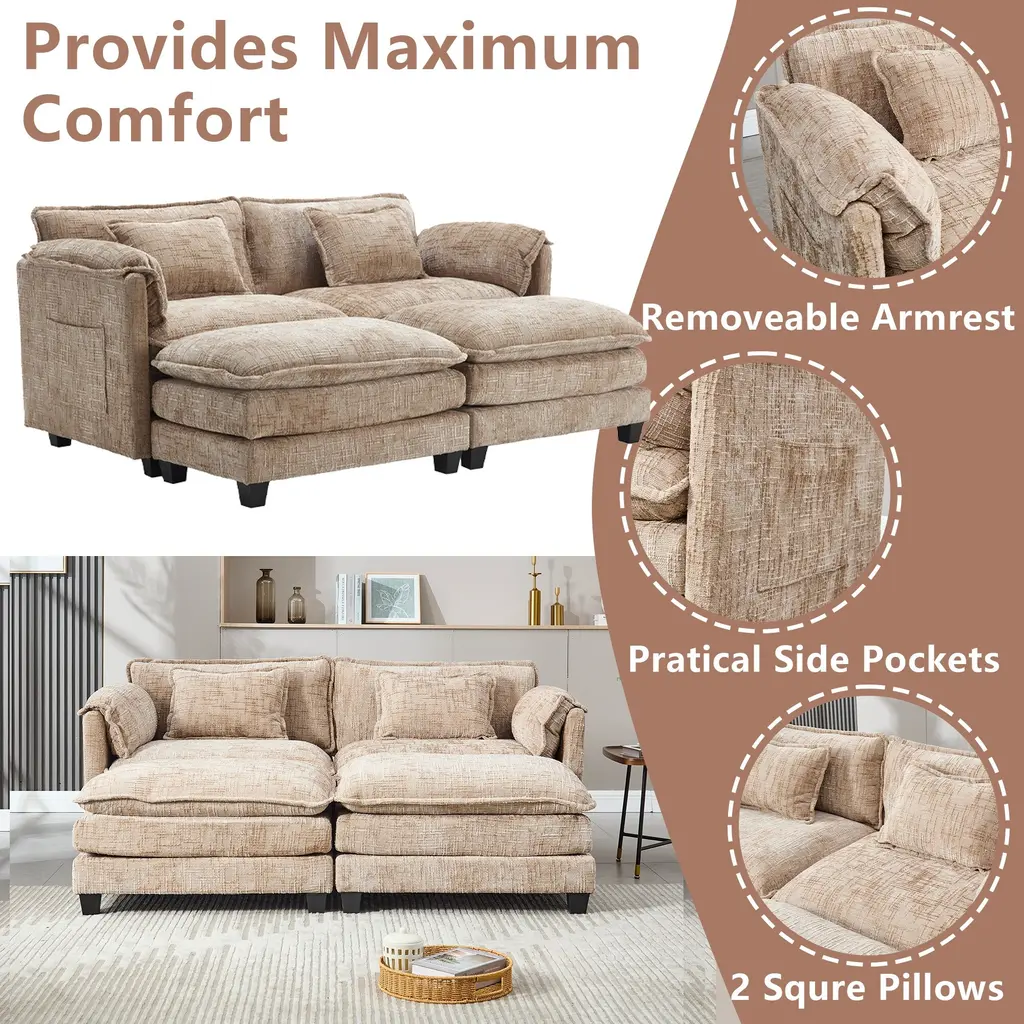 Chenille Upholstered Wood Frame Detachable Armrests Side Pocket Loveseat Sofa With 2 Ottomans - Camel