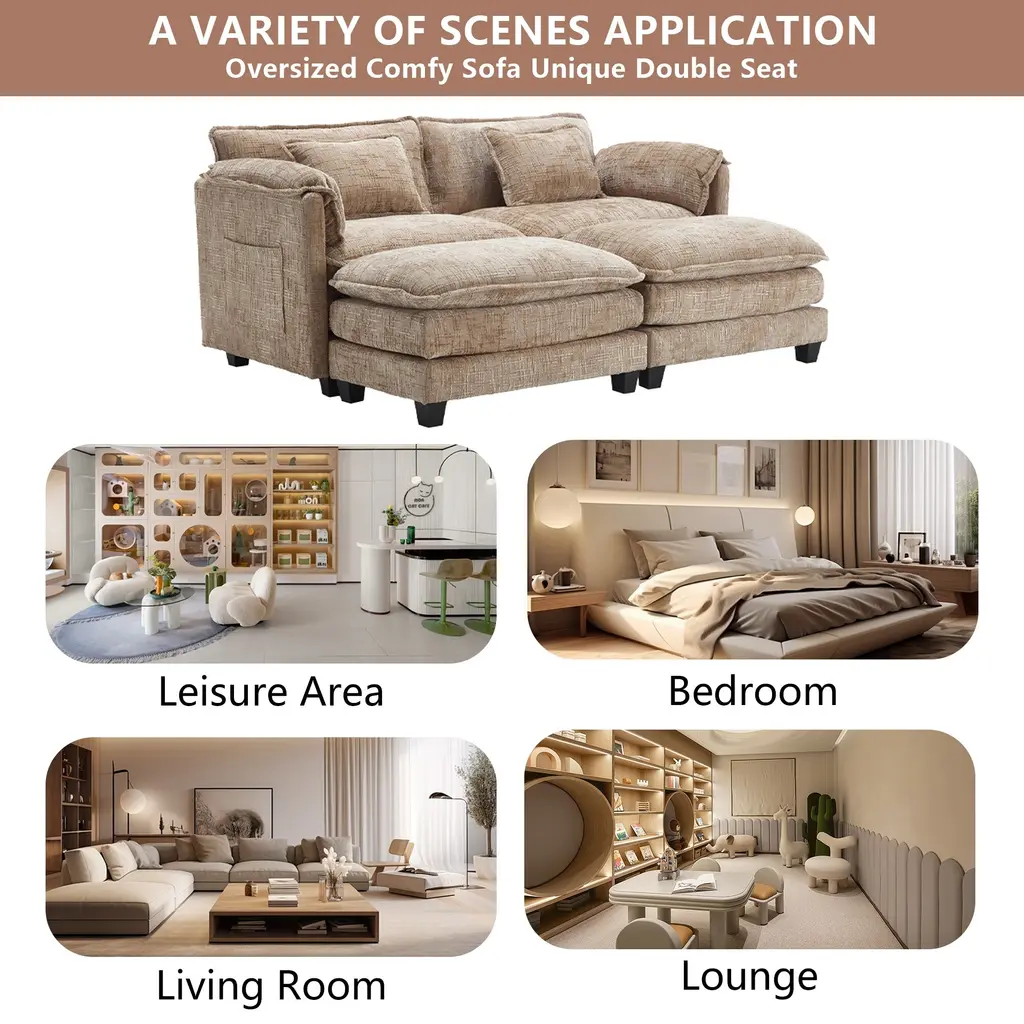 【Two-person comfortable design】two-person sofa provides just the right space for you and your companions, whether it is warm snuggle or relax, you can enjoy a comfortable and comfortable experience. 【Extra points for matching footstool】 Equipped with two footstools, you can lift your feet high when sitting, relieve leg pressure, relax your body and mind, and greatly enhance the overall comfort 【Convenient side pocket】 The design of the side pocket is unique, convenient for you to place a variety of small objects, such as books, glasses, remote control, etc., readily available, so that your life is more convenient, but also to avoid the trouble of misplaced items 【Convenient side pocket】The design of the side pocket is unique, convenient for you to place a variety of small objects, such as books, glasses, remote control, etc., readily available, so that your life is more convenient, but also to avoid the trouble of misplaced items 【Detachable armrest advantage】 The detachable armrest design is a highlight, you can adjust flexibly according to personal needs, you need a larger lying space can be easily removed, want to rely on when it can be quickly installed, but also easy to clean all corners of the sofa and in the narrow space handling. 【High-quality Chenille fabric】 The sofa is made of chenille fabric, which is soft and skin-friendly, bringing you a comfortable touch. This fabric also has excellent wear resistance and stain resistance, durable and easy to take care of, can keep the sofa beautiful and clean for a long time.