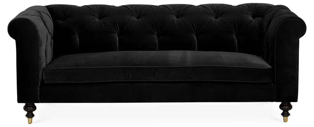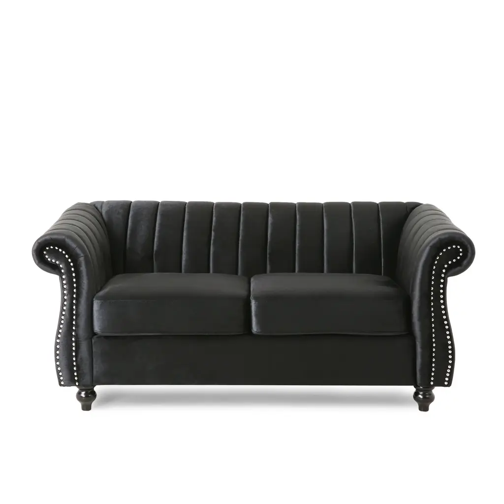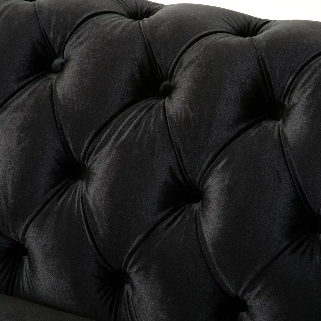 Chesterfield Black Velvet Loveseat, 2 Seater Roll Arm Upholstered Sofa - Black