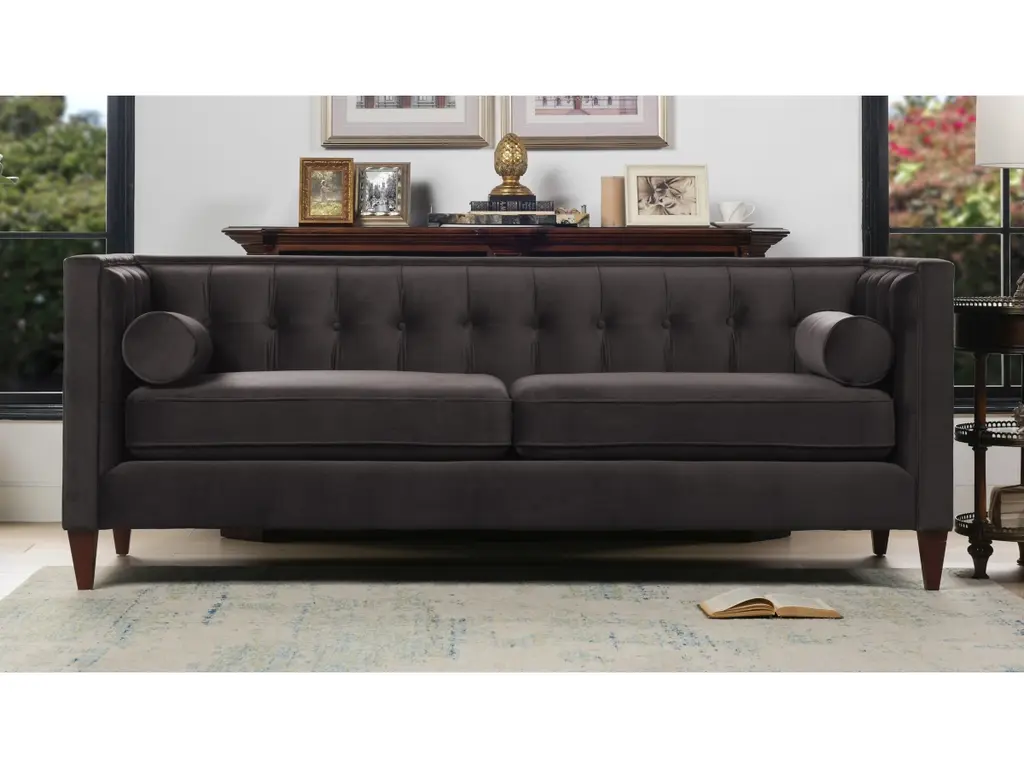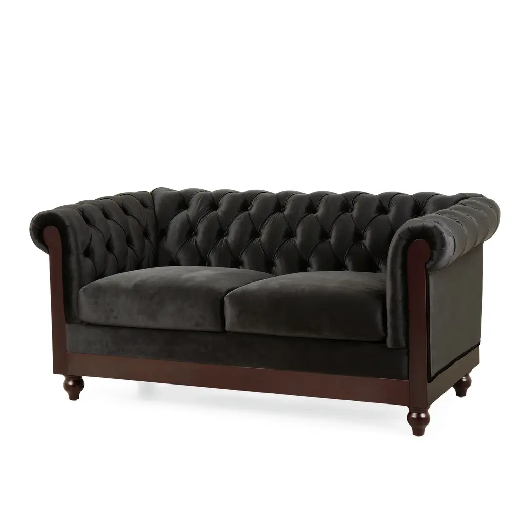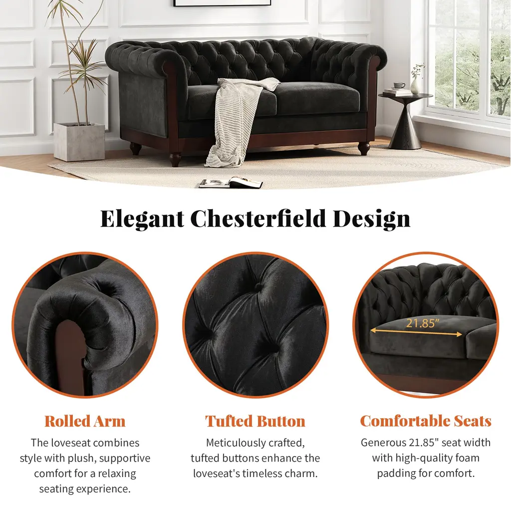 Description:Wrapped in luxurious, high-quality velvet, this loveseat exudes sophistication and comfort. The plush 6.69-inch thick cushions offer an exceptionally soft touch, making it an inviting piece for long, relaxing conversations or cozy reading sessions. Featuring classic Chesterfield design elements such as elegantly rolled arms and meticulous button tufting, this loveseat not only enhances the aesthetic appeal of any room but also provides superior back support. Its compact size of 59.44 inches makes it an excellent choice for small apartments, studios, or rooms where space optimization is crucial.Quick Glance:Specifications:Product Type: LoveseatsMaterial:Velvet Fabric(100% Polyester)+Pine Wood Frame+Birch Legs+Foam(1.8 lbs./cu. ft.)Seat Construction:Sinuous SpringsRemovable Cushions:YesRemovable Cushion Cover:YesTufted Cushions:YesToss Pillows Included NoArm Type:Rolled ArmBack Type:Tufted backOverall Size:59.44x34x26.57inch(LXWXH)Seat to Ground: 17.95inch.Overall Weight:88.18lbsWeight Capacity:300lbs/seat