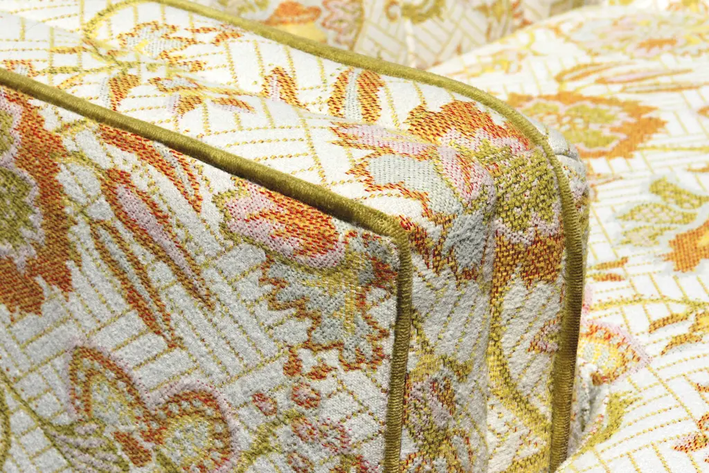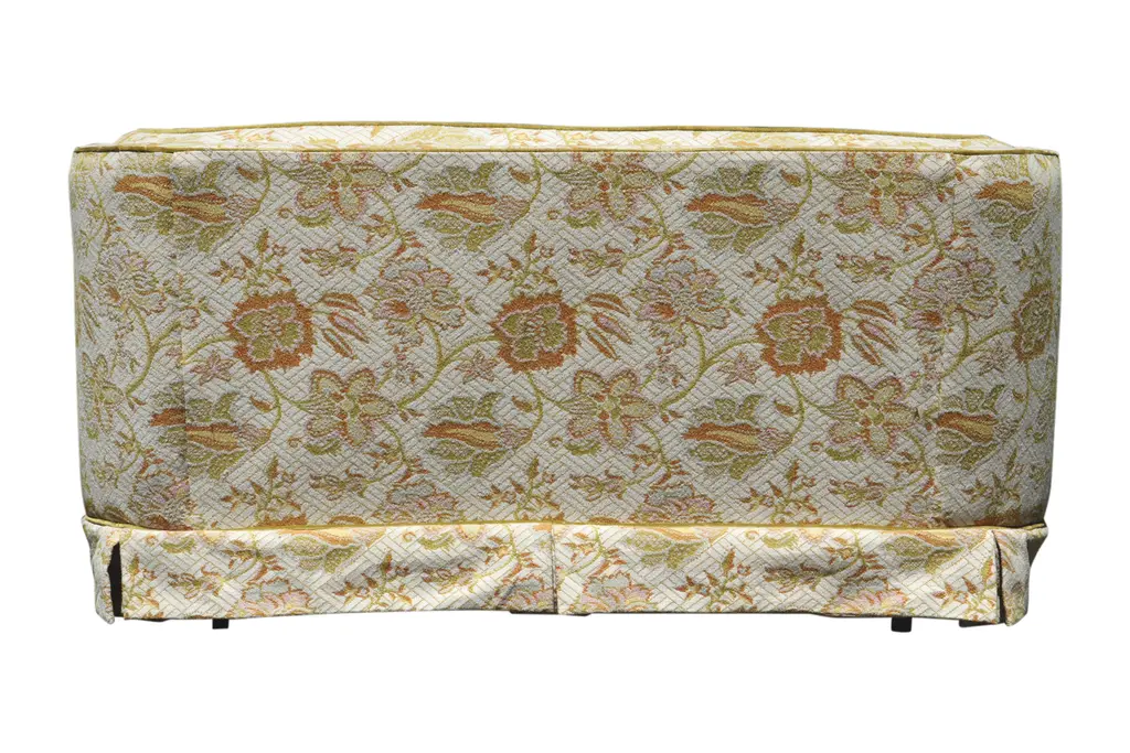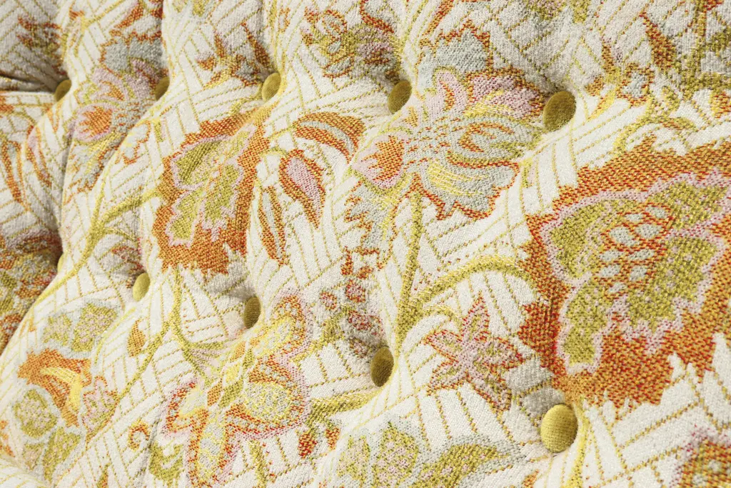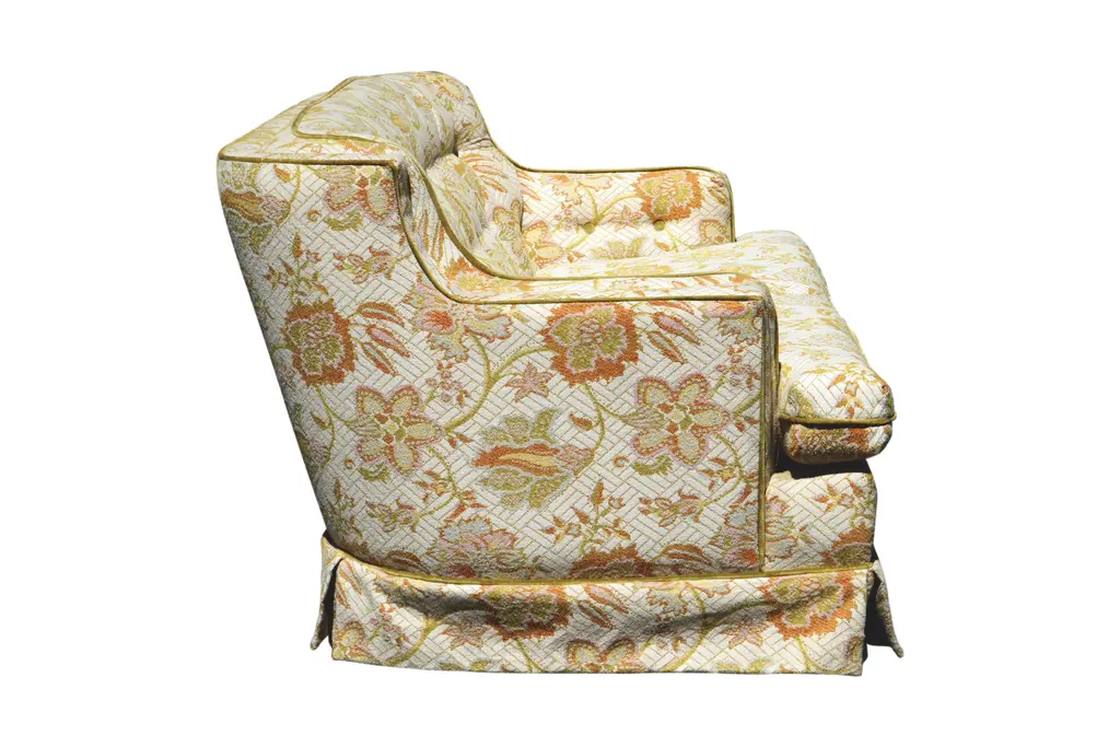 A tufted chinoiserie floral loveseat sofa made by Style House Custom Furniture for Montgomery Ward, dated 1967. The sofa has a low profile with curved corners that meet flat arms. Upholstered throughout in a bold jacquard fabric decorated with orange flowers on a vine over a trellis motif. Arm height 23", seat height 18".