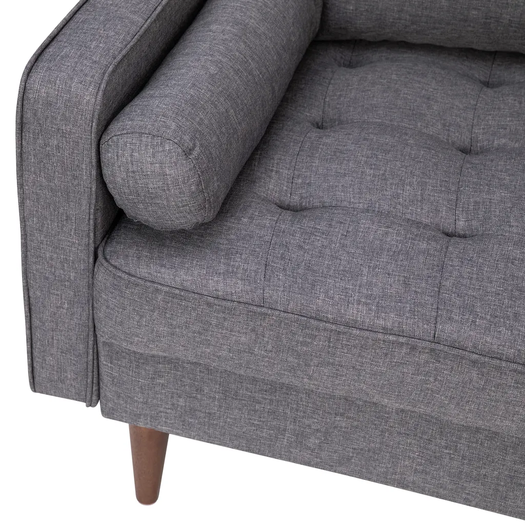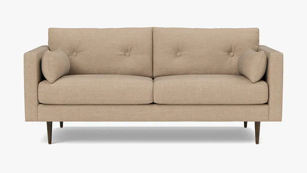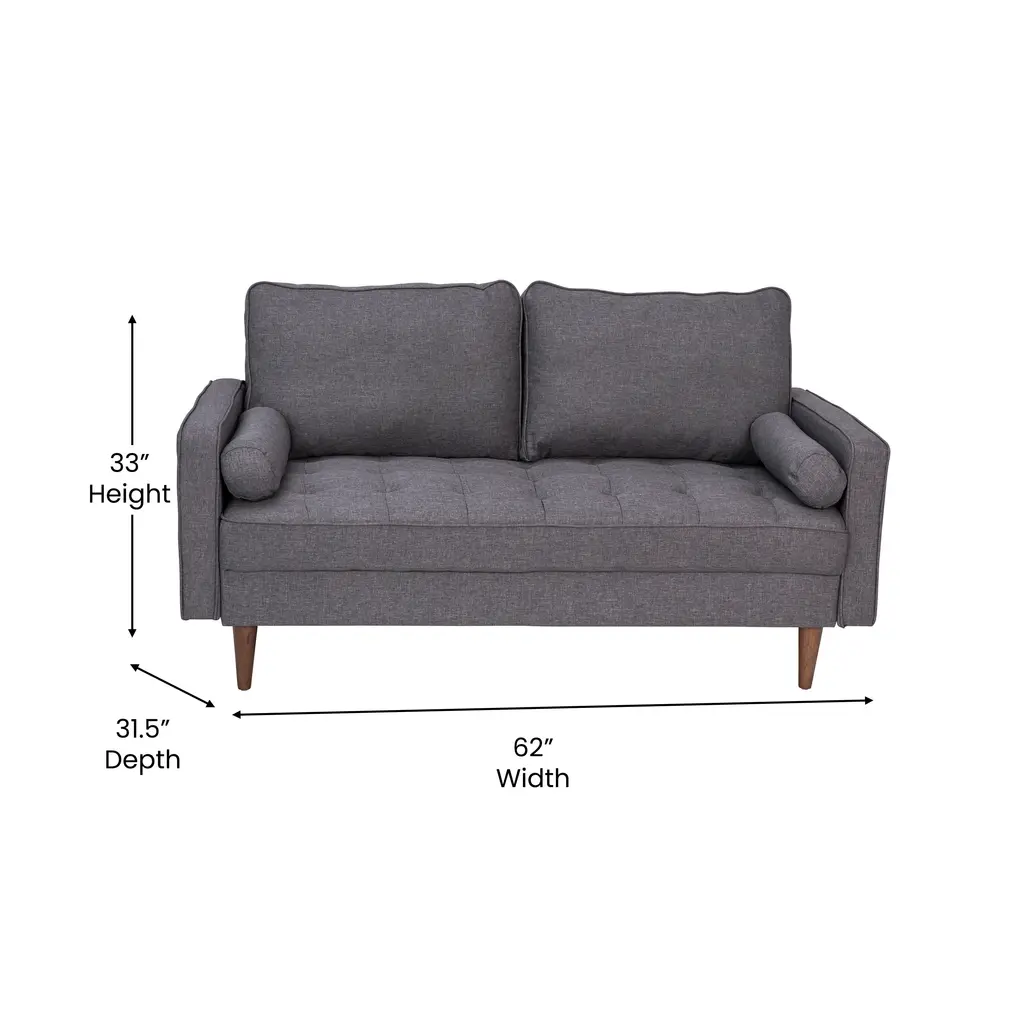 Refresh the look of your current home or furnish your new residence with the trendy mid-century modern aesthetic of this compact loveseat ideal for small spaces. Upholstered in commercial grade faux linen fabric and boasting buttonless tufting on the seat cushion, this 2-seater sofa, with included bolster pillows, lends a chic, updated look to any space. Durability is just as important as great looks and this modern loveseat has plenty of both. Real wood legs and a solid wood frame allow this loveseat to hold up to 600 lbs static weight while generous foam padding paired with pocket springs adds an extra supportive feel. Fixed floor glides prevent damage to your hard flooring surfaces and the attached seat cushion keeps your space tidy but the back cushions can be removed for a quick catnap. Assemble your new settee in less than 10 minutes with no tools required and easily keep it looking new by cleaning with a damp cloth. This 2 person couch arrives in a single box and pairs with other pieces in our collection giving your room a sophisticated, cohesive look.
