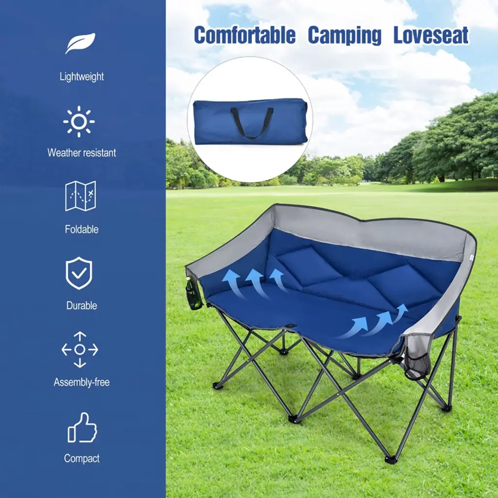 Costway Folding Camping Chair Loveseat Double Seat W/ Bags & Padded Backrest Blue