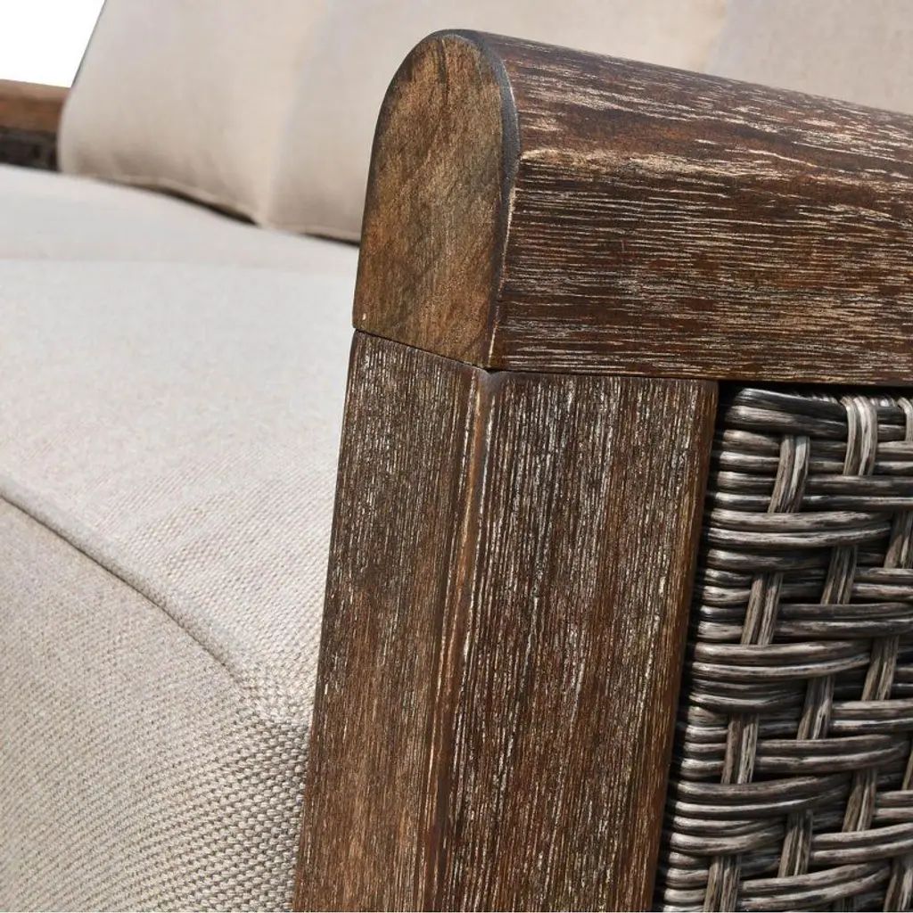 Bermuda Collection is fully assembled and ready to use. With inset woven panels this style is sure to give your outdoor space an island feel with comfort and class. Made of tropical FSC certified teak wood and hand finished with a water based stain for a patina look and protection. The synthetic woven panels are done by hand and are UV resistant. The cushions are made of top of the line Sunbrella fabric with densified foam and a Dacron vertical fiber wrap to help the cushions hold their shape. Easy to clean and 1 year limited manufacturers warranty.