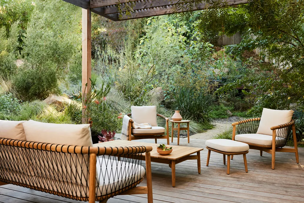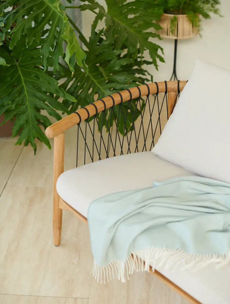 Utilizing industrial materials in a handcrafted way, the Crosshatch Outdoor Settee (2017) merges simplicity and functionality. Design studio Eoos used parachute cord for the sofa's open latticework, due to its stiffness and resistance to stretching over time. The teak frame is upholstered in Sunbrella Heritage fabric, which has an elegant, linen-like texture.