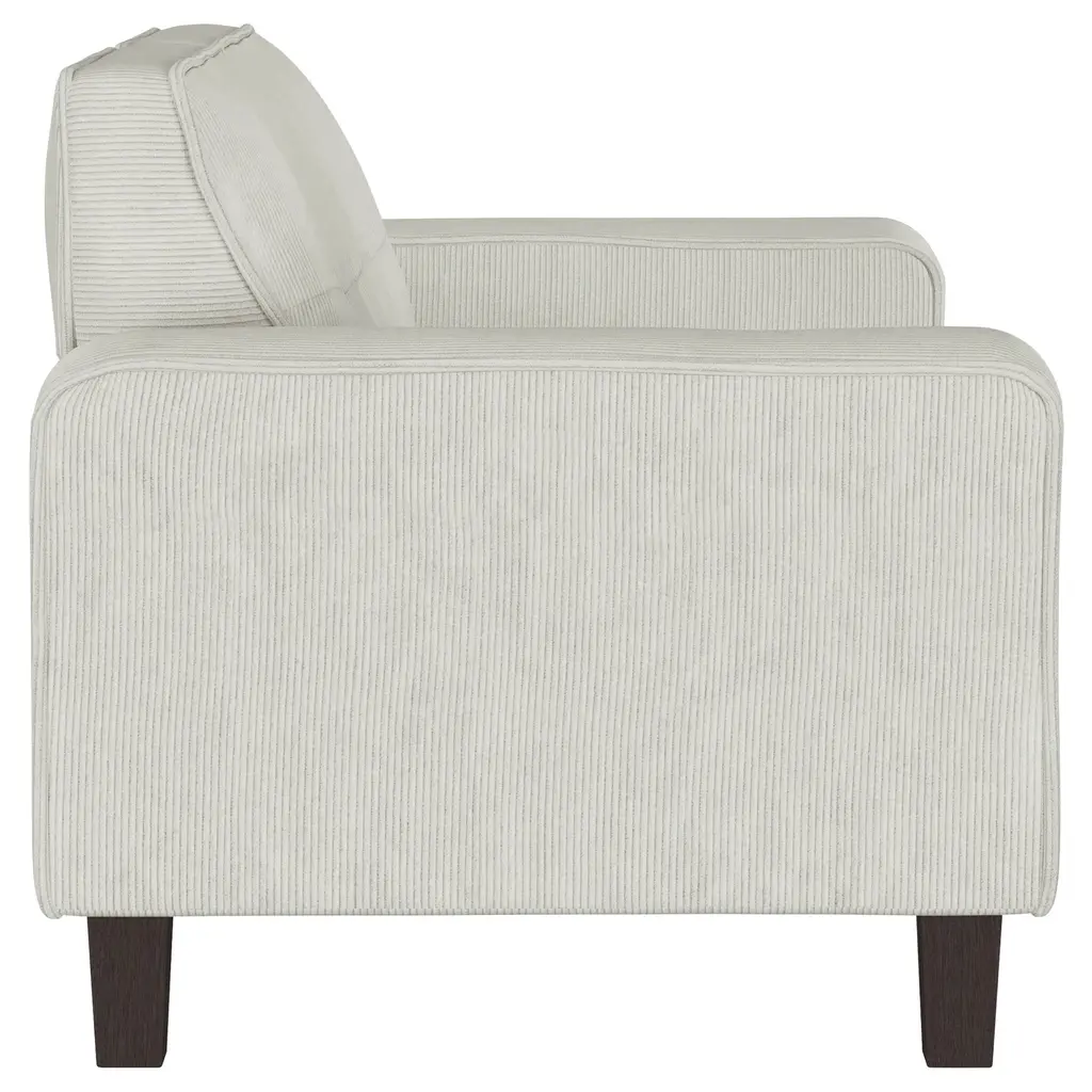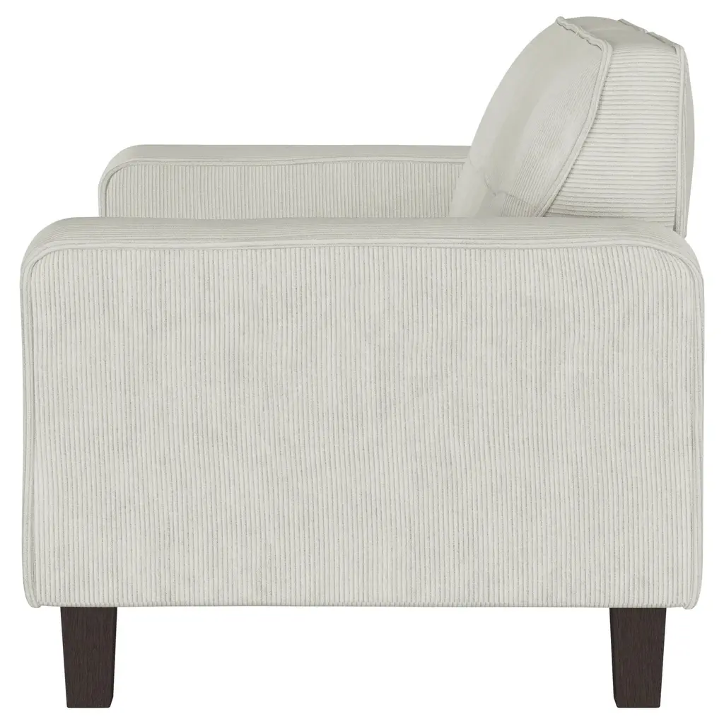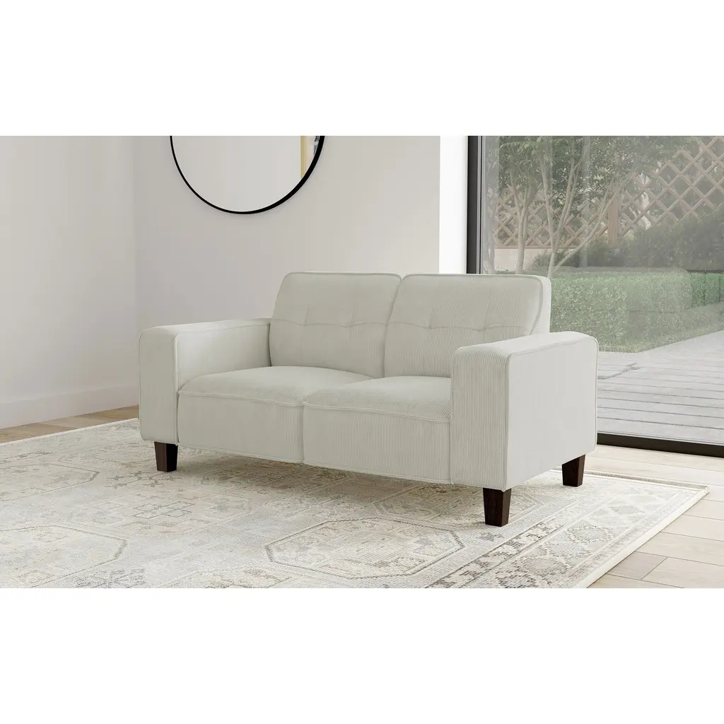Inject impressive comfort and impeccable style with a modern loveseat in your living room or den. Its tufted back cushions add depth and dimension, perfect for a touch of character in your living area. Plush, soft upholstery in a neutral hue complements perfectly, offering inviting comfort and style with corduroy-like texture. Wide track arms add structure to a clean-lined silhouette, offering timeless flair that blends in any setting. Tapering wooden legs complete the look, offering height that create a touch of light, airy ambiance that delivers a modern design. Options: Item Contents: Item Bullets: Materials: Features: Dimensions: Accessories pictured are NOT included.