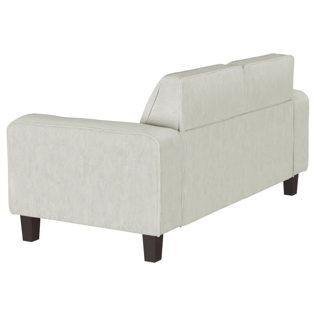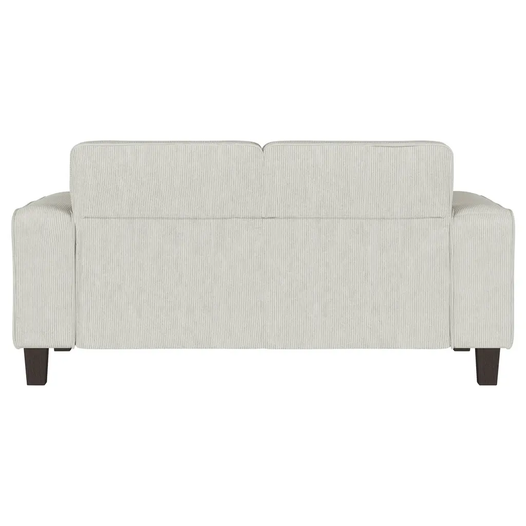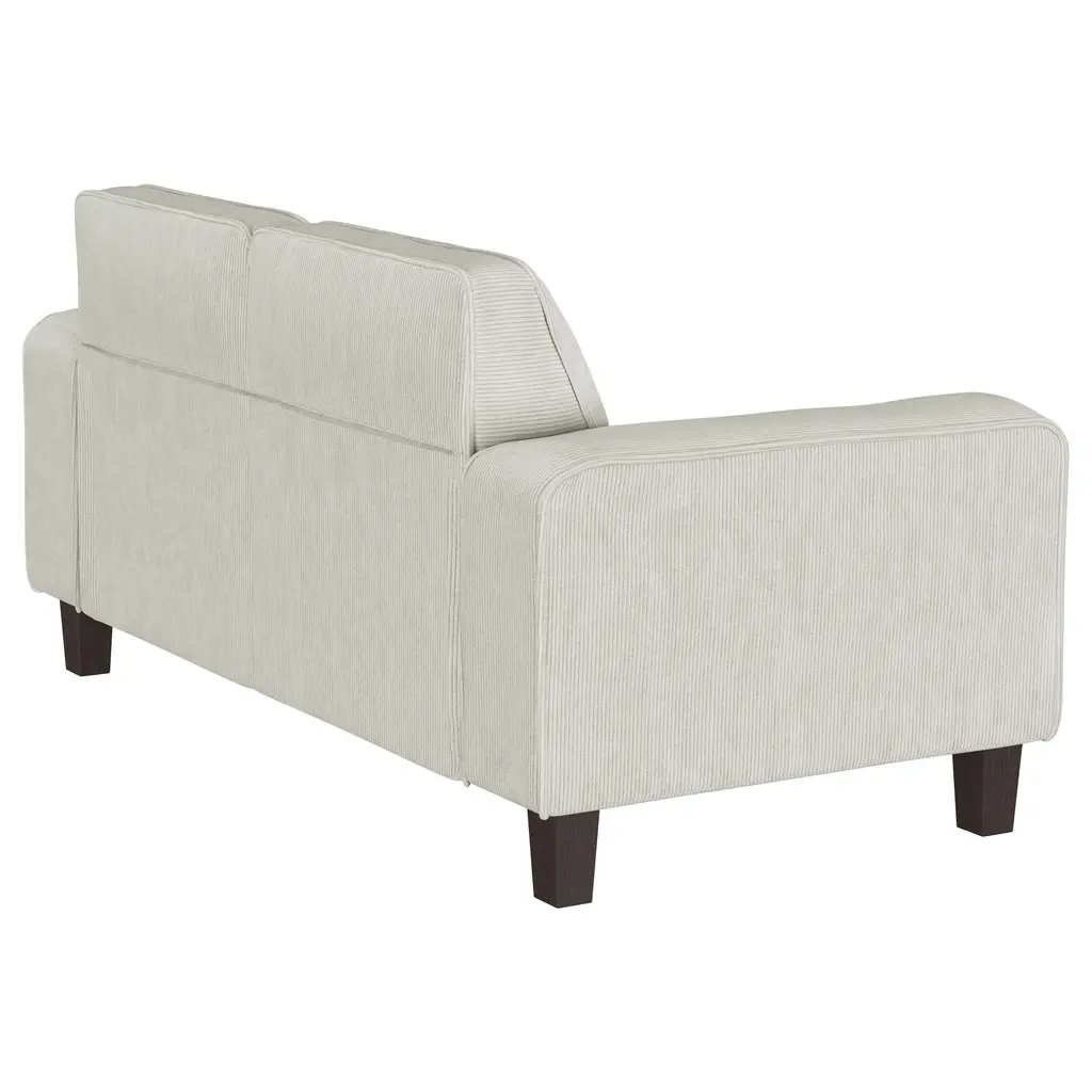 Inject impressive comfort and impeccable style with a modern loveseat in your living room or den. Its tufted back cushions add depth and dimension, perfect for a touch of character in your living area. Plush, soft upholstery in a neutral hue complements perfectly, offering inviting comfort and style with corduroy-like texture. Wide track arms add structure to a clean-lined silhouette, offering timeless flair that blends in any setting. Tapering wooden legs complete the look, offering height that create a touch of light, airy ambiance that delivers a modern design. Options: Item Contents: Item Bullets: Materials: Features: Dimensions: Accessories pictured are NOT included.