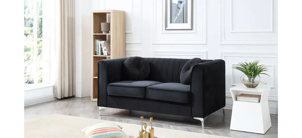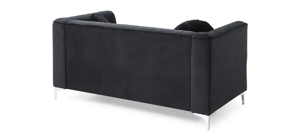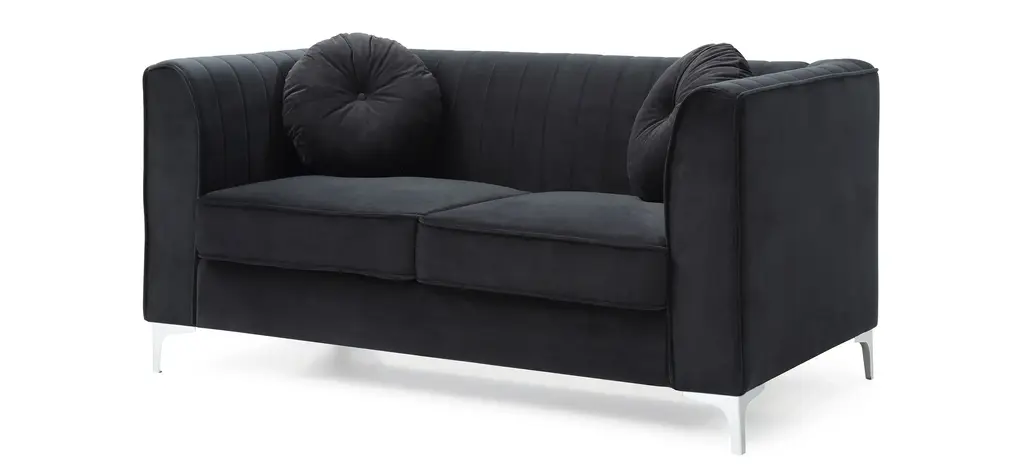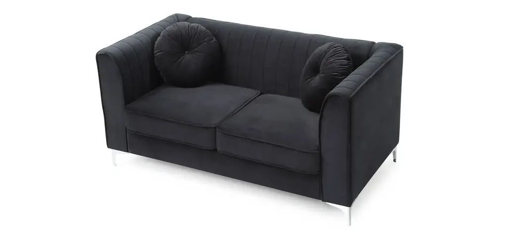 Soft polyester upholstery covers this dramatic Delray loveseat. Includes channel quilted inside back and arms, matching throw pillows. Pocketed coil springs are encased in high quality support foam.